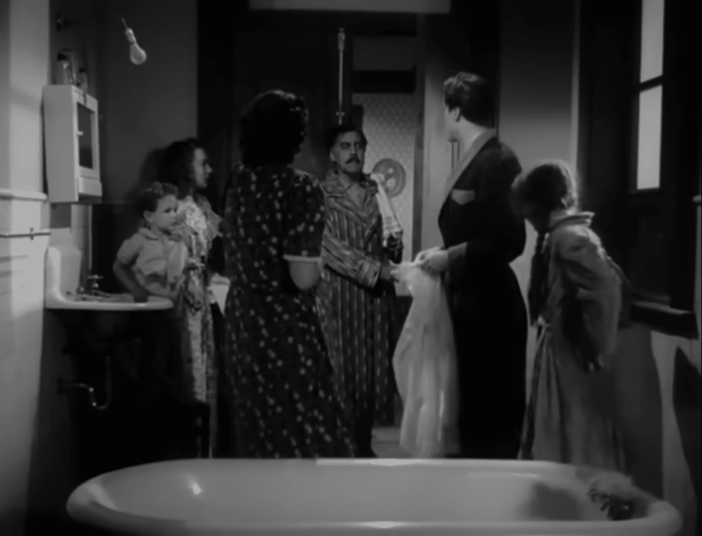 La pelea matutina por el baño no la inventó Alejandro Galindo pero quizá Una familia de tantas (1949) es una de las primeras películas mexicanas en la que se muestra el uso y la importancia del cuarto de baño, habitación de la casa familiar que implica la existencia de la privacidad. Por órdenes del autoritario padre (Fernando Soler), las tres hijas deben usar el baño después del hermano varón y, por razones de moral y decoro, evitar coincidir con él ahí “como si estuvieran haciendo algo malo”.