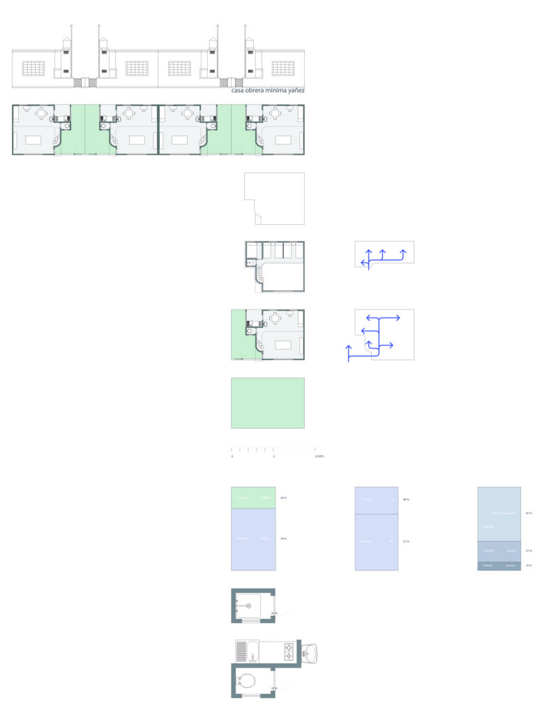 Con ese material comencé a comparar la primera fotografía que vi con las plantas. Los dibujos no coincidían entre sí ni con las fotos. Había otros dibujos, de un conjunto en San Jacinto, similar al de Balbuena. Comparando con imágenes de Google Earth y Street View, se veía que el conjunto había sido modificado casi por completo. Al mismo tiempo, recopilando material para un curso en la escuela en el que dibujamos varios casos de espacio doméstico, mostrando el funcionamiento, las circulaciones, la relación de los metros cuadrados construidos con la huella del desplante, llegué a un dibujo axonométrico, junto con las plantas y secciones de la propuesta de Enrique Yáñez en el mismo concurso para vivienda obrera mínima. Busqué dibujar ambos proyectos de manera similar, tratando de entender las variaciones en la tipología, la ubicación del que fue construido, y comparar el dibujo con fotografías de época. Al unir los distintos tipos de vivienda en una planta de conjunto, siguiendo lo que podía ver en las imágenes satelitales contemporáneas. Algunos ejes de los distintos tipos de casas iban coincidiendo al seguir el escalonamiento de la planta de conjunto.