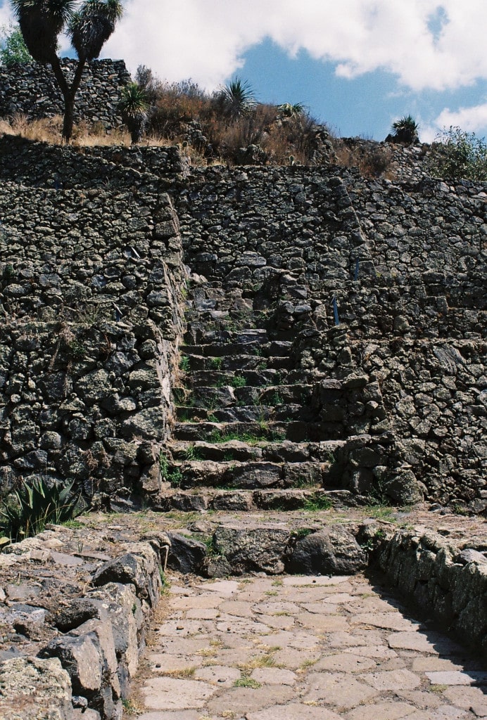 Tomamos la escalinata que inusualmente a lo que estamos acostumbrados a ver en otras expresiones de la arquitectura y urbanismo prehispánico, no asciende en forma monumental y en línea recta hacia el cielo, sino que se tuerce a los pocos metros para subir tangentemente a los taludes que forman la muralla, hasta llegar al punto donde nos encontramos con la hendidura visualizada desde la plaza inferior; durante el ascenso, el juego de plataformas del volumen por el que vamos transitando, se convierte en un juego de recortes que enmarcan la plaza baja, la ciudad, y el paisaje dependiendo del nivel y la perspectiva a donde volteemos.