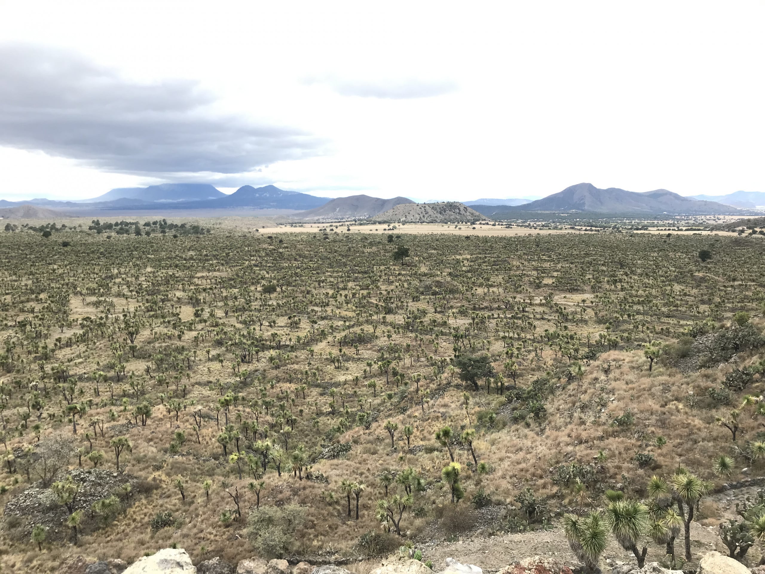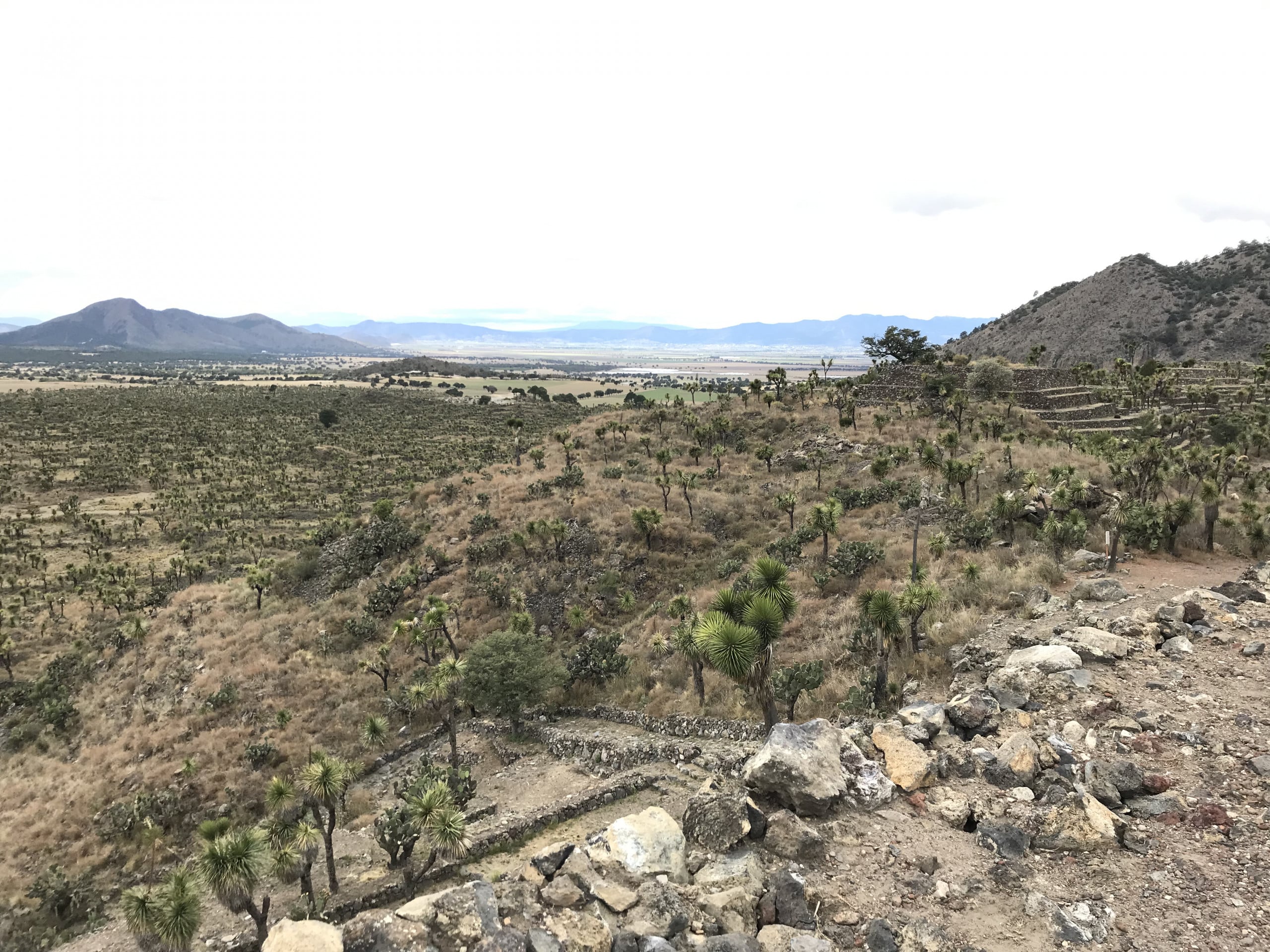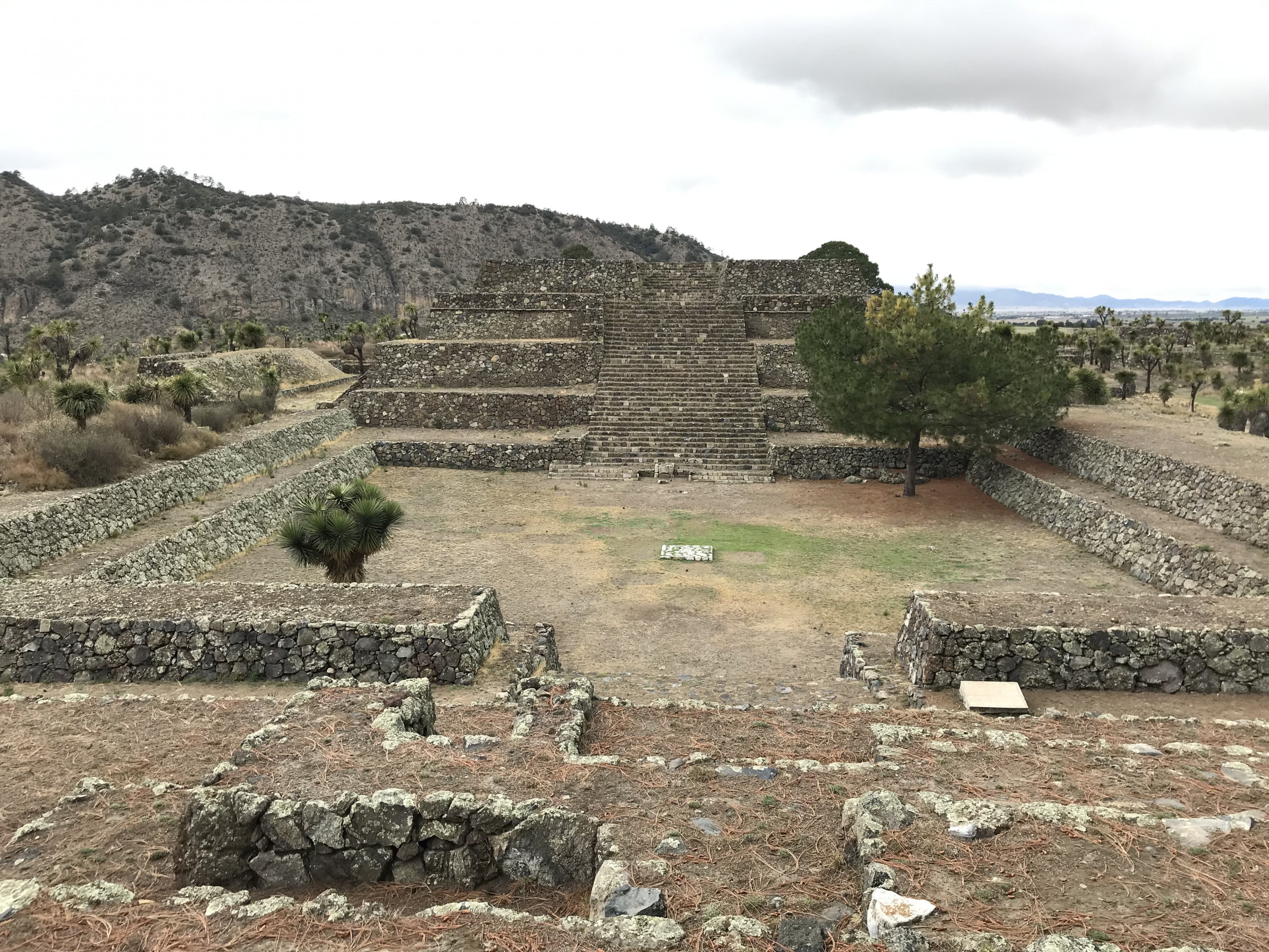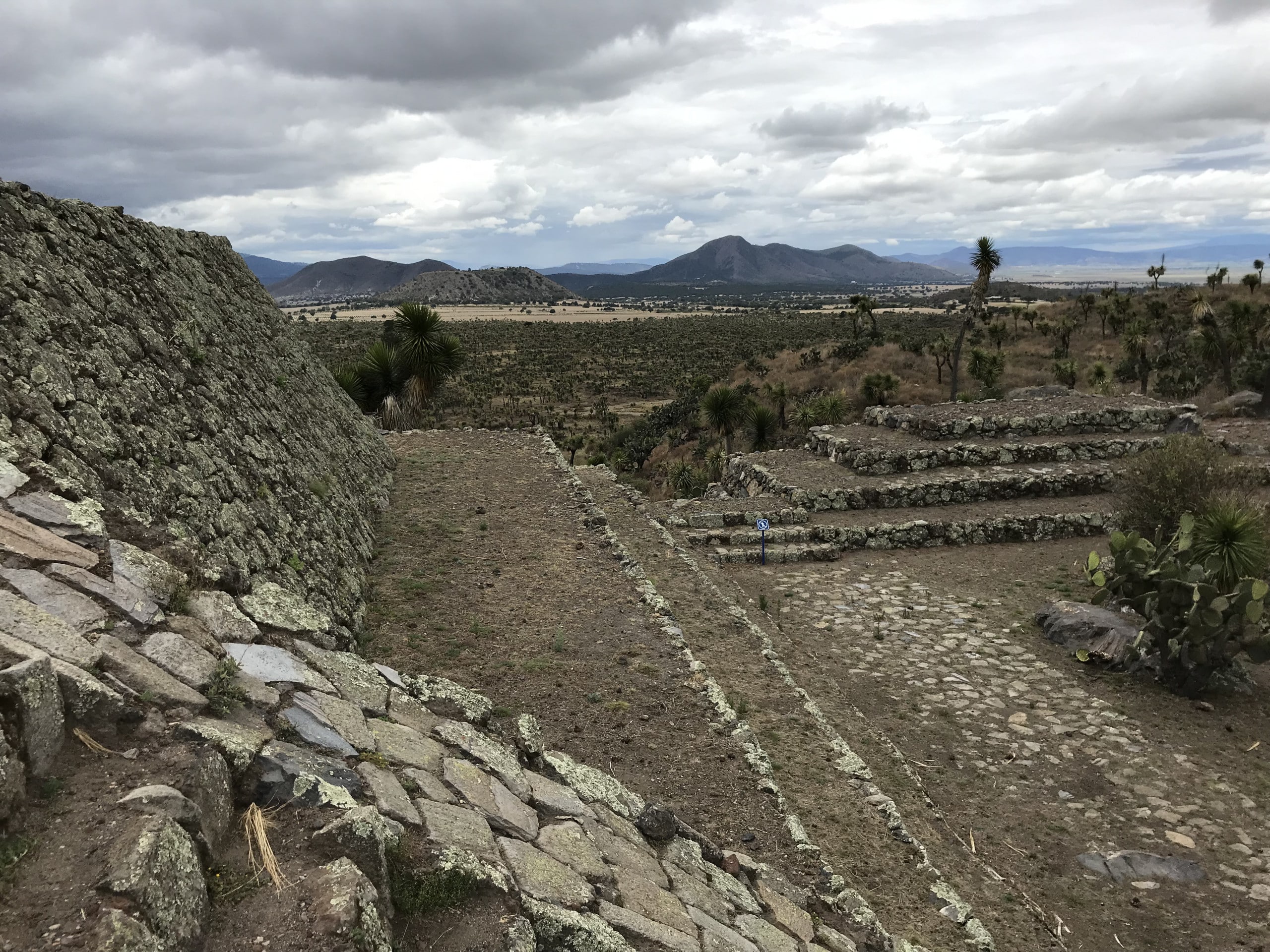 La salida del conjunto correspondiente al juego de pelota 7 prepara el último punto de la ruta hacia el este: La plaza oriente y la denominada Pirámide del Mirador. Para no aburrir a nuestras y nuestros lectores con reiteraciones inútiles, este espacio representa el extremo opuesto de la acrópolis en relación con el acceso desde la muralla, y nos brinda una experiencia visual que domina el valle, una gran extensión de ciudad aún sin desmontar, cubierta por yucas y otras plantas desérticas, y una espectacular panorámica de las siluetas volcánicas de la Sierra Madre Oriental.