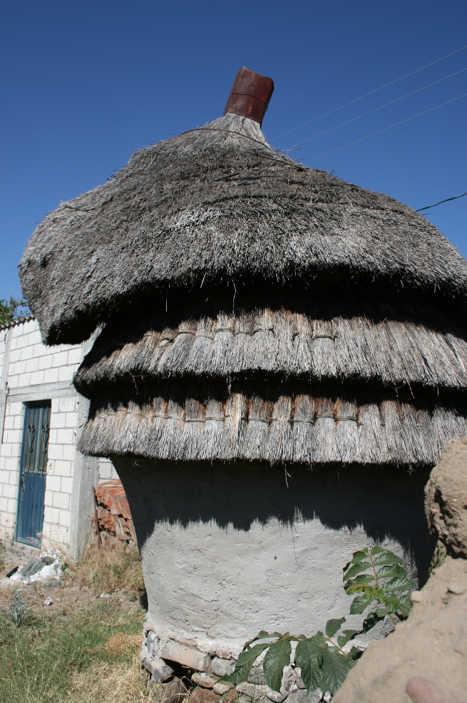 Un pequeño basamento de piedra circular, sólo abierto por una pequeña puerta por donde, siguiendo la fuerza de la gravedad, saldrá el grano celosamente cuidado, producto de la milpa en forma cuantificada, sostiene a una cazuela compuesta por una mezcla de tierra compactada y zacate. La tierra trabajada con agua se teje con el zacate para formar, al secarse, una compacta sustancia que resiste a la compresión y a la flexión, precedente milenario de lo que, con otros materiales, evolucionará posteriormente como concreto armado. La cazuela puede elevarse un par de metros, abriéndose hacia la altura hasta llegar a un diámetro cercano a 1.50 metros.