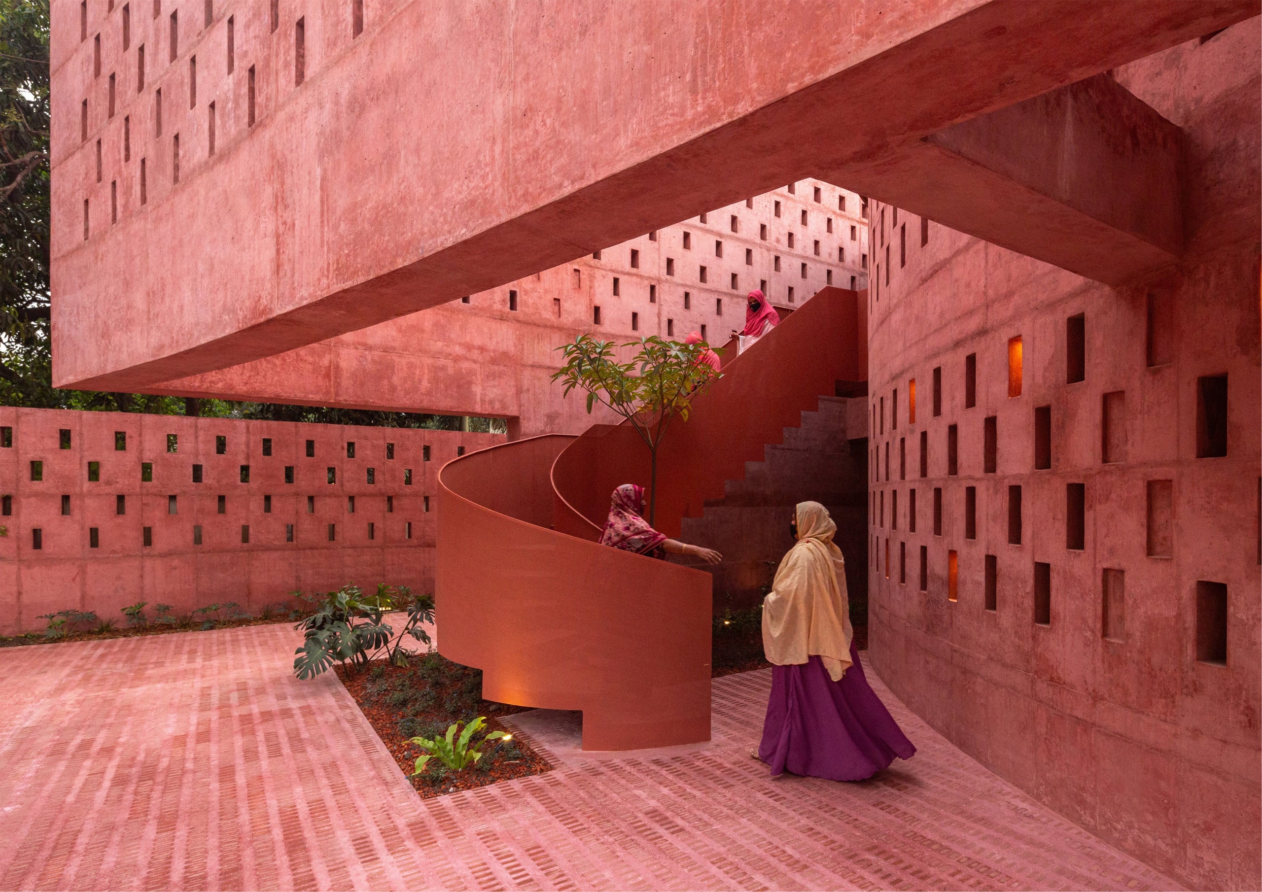 En el ámbito educativo, la arquitectura se plantea como herramienta para enfrentar contextos ambientales y urbanos complejos. En Bangladés, el campus de BRAC University Campus transforma un antiguo vertedero en un conjunto vertical ajardinado basado en estrategias pasivas de climatización. En India, Sondara Gurukulam adopta una configuración abierta de terrazas y patios que favorecen la ventilación natural, mientras el DY Patil Centre of Excellence combina certificación ambiental con patios sombreados y un jardín elevado.