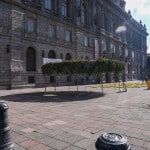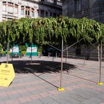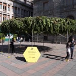 Un anillo de nueve metros de diámetro conformado por ramas recién podadas parece flotar a tres metros de altura a un lado de la Plaza Manuel Tolsá en el Centro Histórico de la Ciudad de México. El único espacio de sombra en toda la plaza.
