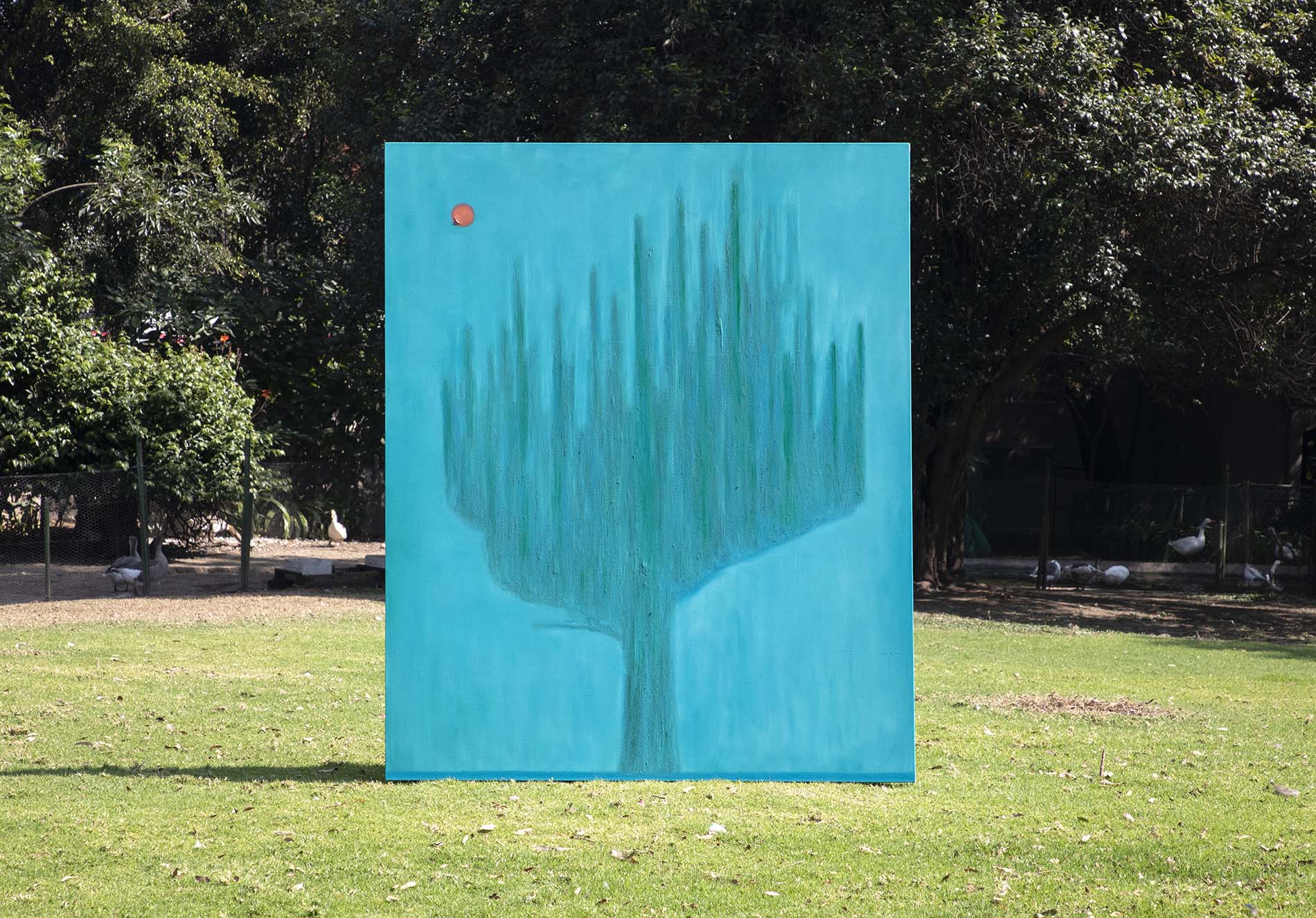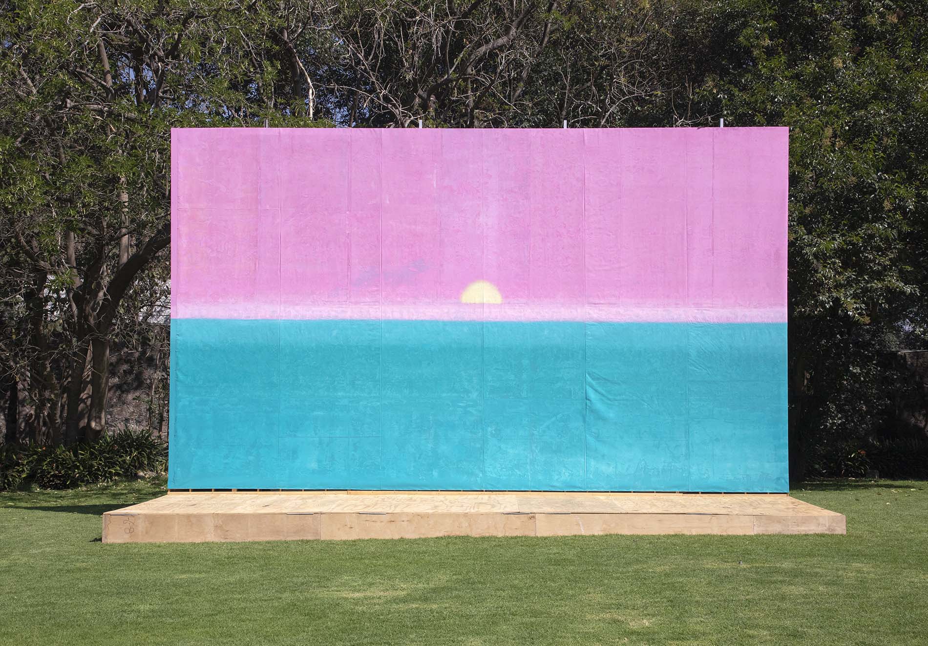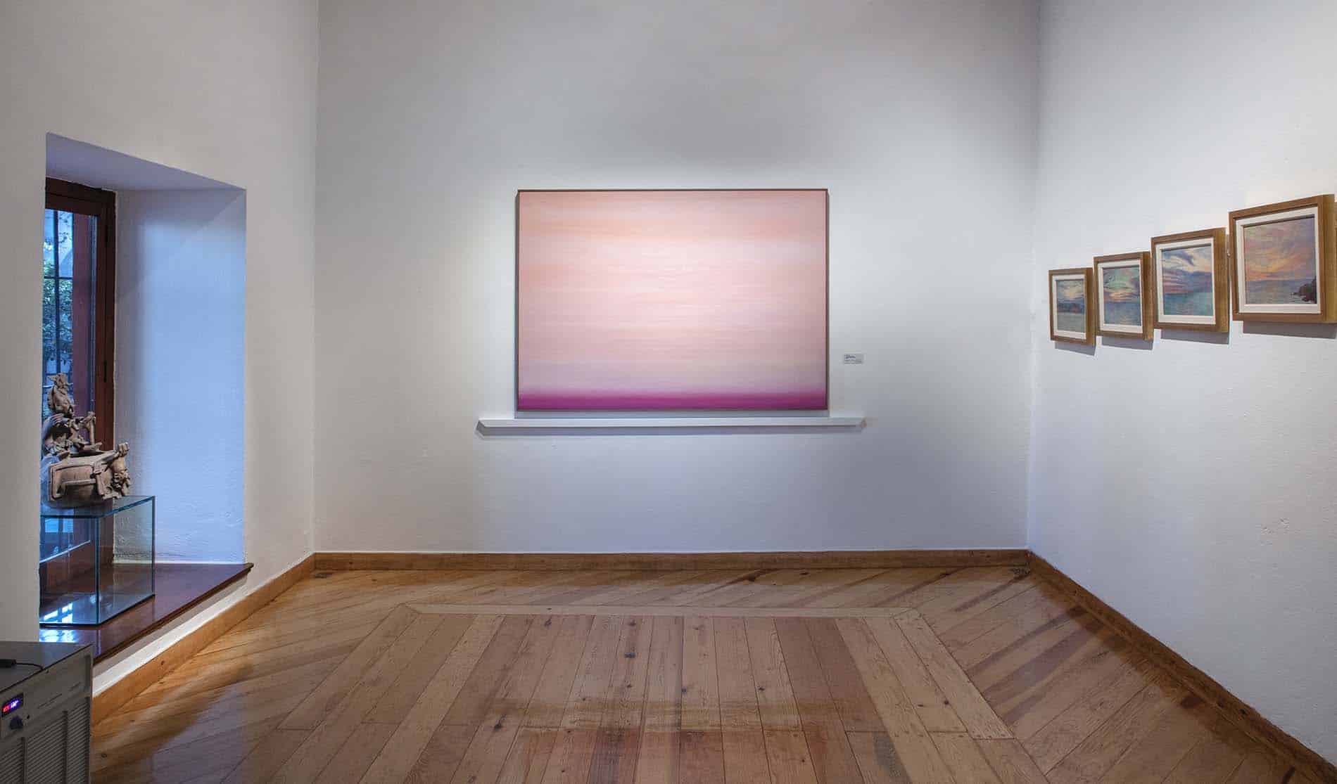“Horizontes de Sentido”, curada por Argüelles, a través de Saenger Galería, muestra la obra del artista mexicano Yoab Vera (Coyoacán, 1985) entre una mayoría de pavorreales, cactáceas y xoloitzcuintles que habitan en La Noria, Xochimilco. Inspirado por las “Puestas de Sol”, pintadas por Diego Rivera en 1956 y que forman parte de la colección del Museo Dolores Olmedo, Vera muestra el paso del tiempo y el tránsito de la luz sin anclas ni cartografías específicas.