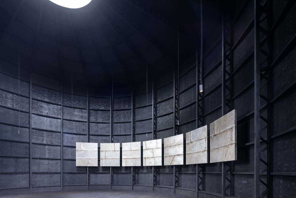 Siete paneles pictóricos cuelgan en la estructura interior. En estas obras, Gates buscó honrar el