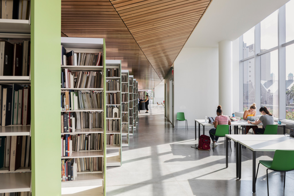 A medida que las personas se mueven por el edificio, esta conectividad visual y física les permite mantener su orientación y fomenta el uso de todos los recursos del edificio. En la base de la escalera principal, el mostrador de servicio integral proporciona la primera interfaz entre el personal de la biblioteca y los estudiantes, y facilita su acceso a la colección de la biblioteca. Al reducir drásticamente el espacio requerido para el almacenamiento de libros y al mismo tiempo ampliar el acceso a la colección de la Biblioteca, BookBot permite un mayor espacio para el aprendizaje colaborativo, los recursos académicos y el espacio de estudio individual.
