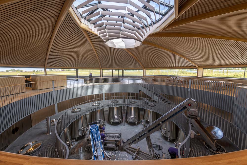 Los visitantes se acercan a la bodega a lo largo de una avenida arbolada. Al final, se encuentra un edificio de planta circular. Una combinación de dos rampas, una externa para enfatizar la relación con el sitio y la otra interna, permiten al visitante caminar por las diferentes etapas del proceso del vino y le dan al nuevo edificio su definición espacial. Ambas rampas conducen a una galería en el nivel superior que forma el corazón social del edificio con mesas de degustación, un elegante bar de vinos y espacios de entretenimiento, todo envuelto por vistas de 360 grados de los viñedos contiguos. Un atrio circular permite a las personas mirar hacia abajo a los espacios de producción y almacenamiento de vino que se encuentran debajo, brindando una experiencia holística y única para los visitantes.