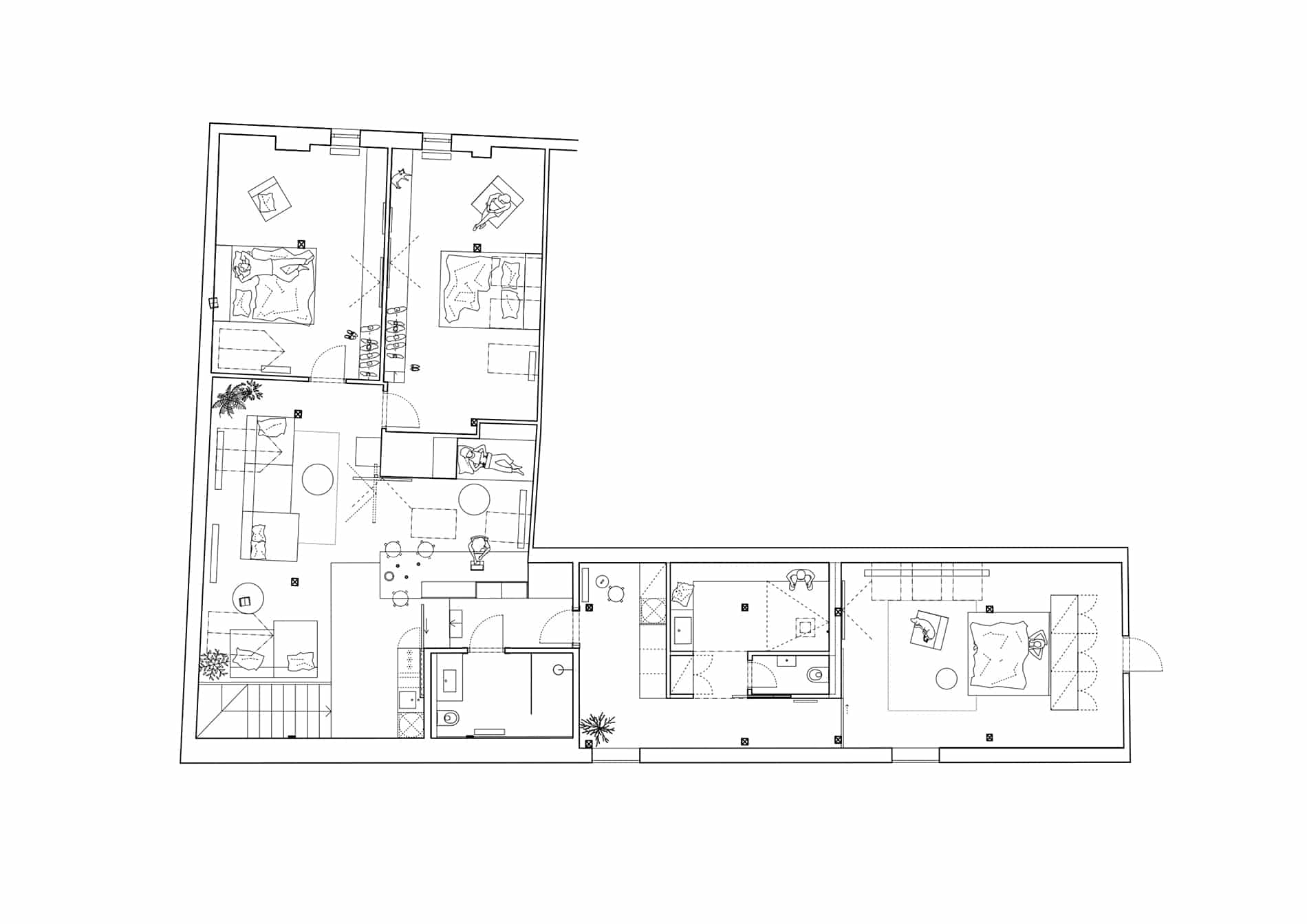 La planta se organiza en dos zonas diferenciadas. El área privada incluye dormitorio y vestidor en tonos oscuros, mientras que las habitaciones para huéspedes adoptan una atmósfera más clara. Ambas se articulan mediante un espacio social central que integra barra, área de estar y zona de trabajo. Junto a la escalera se ubican el baño compartido y un sanitario. El confort térmico se resuelve mediante aire acondicionado en verano y radiadores en invierno, complementados por mejoras en sellos de puertas y ventanas y una partición corrediza que separa ambas plantas.