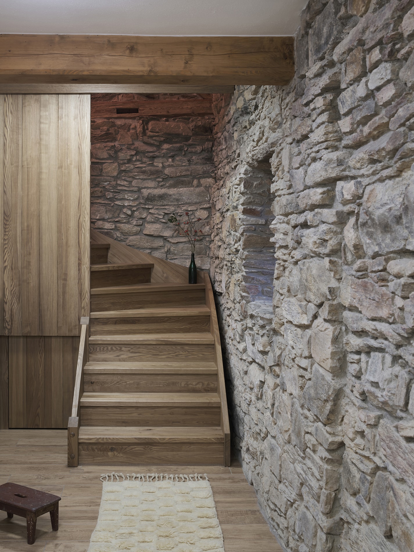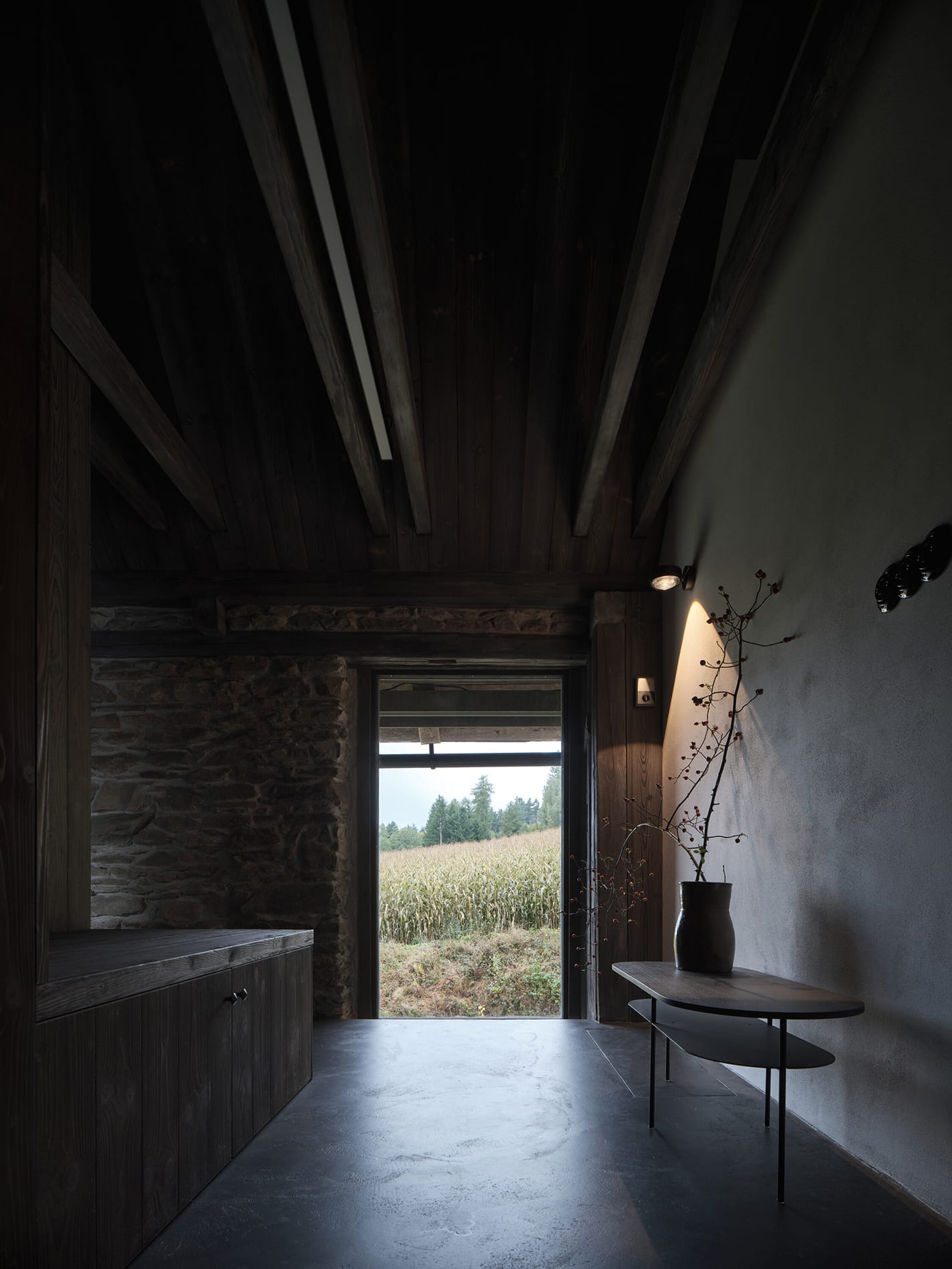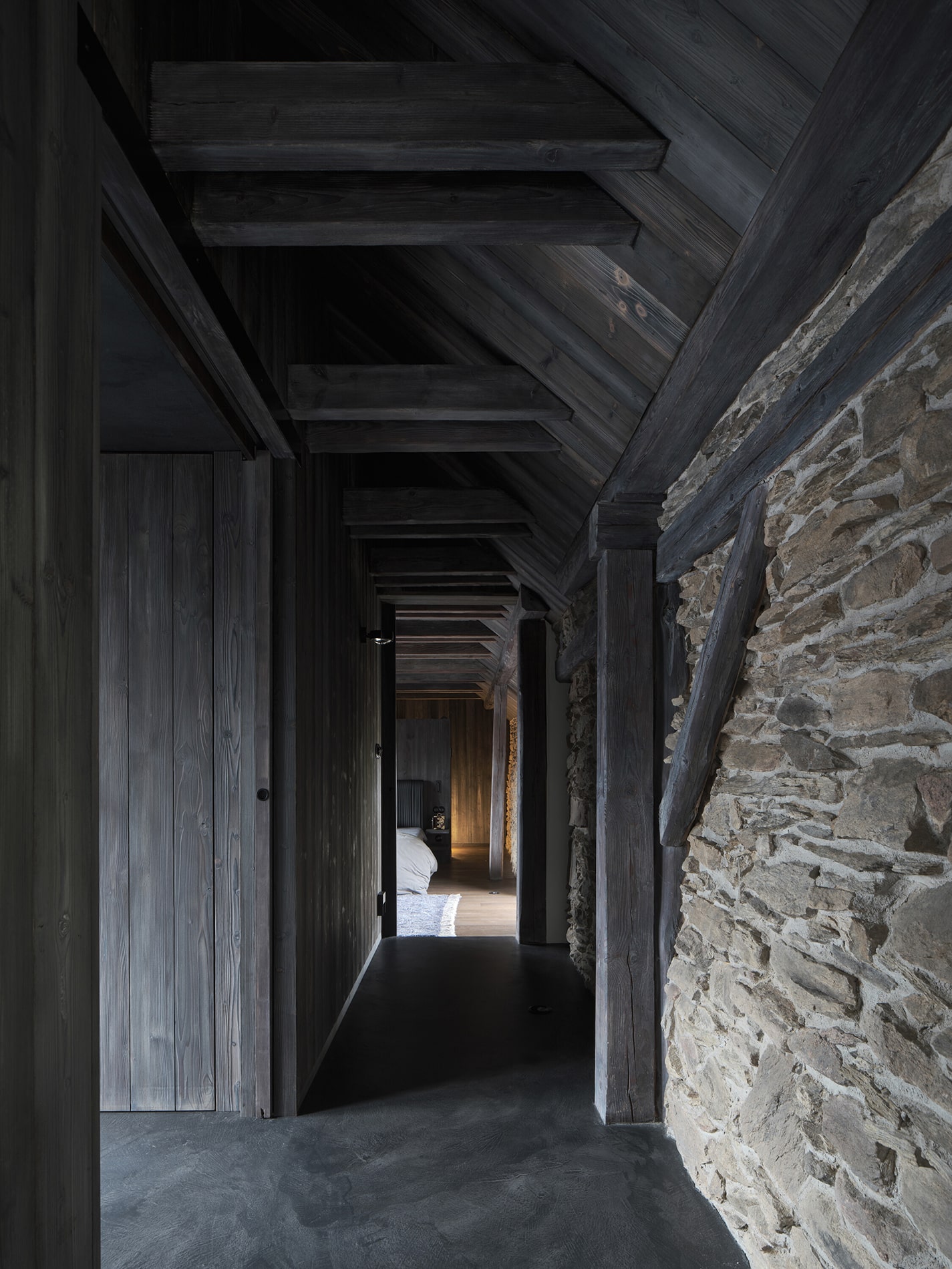 El proyecto buscaba crear un ambiente acogedor para la familia y sus huéspedes, garantizando privacidad tanto en el interior como respecto al paisaje circundante. La propuesta mantiene vínculos con la planta inferior mediante el uso de materiales como madera maciza de abeto y el muro de piedra original expuesto, mientras que la planta alta adopta un carácter propio. Los tonos oscuros y los materiales en bruto —poco comunes en interiores rurales tradicionales— contribuyen a construir una atmósfera introspectiva. Combinados con una iluminación cuidadosamente diseñada, reducen estímulos visuales y favorecen la concentración y el descanso.