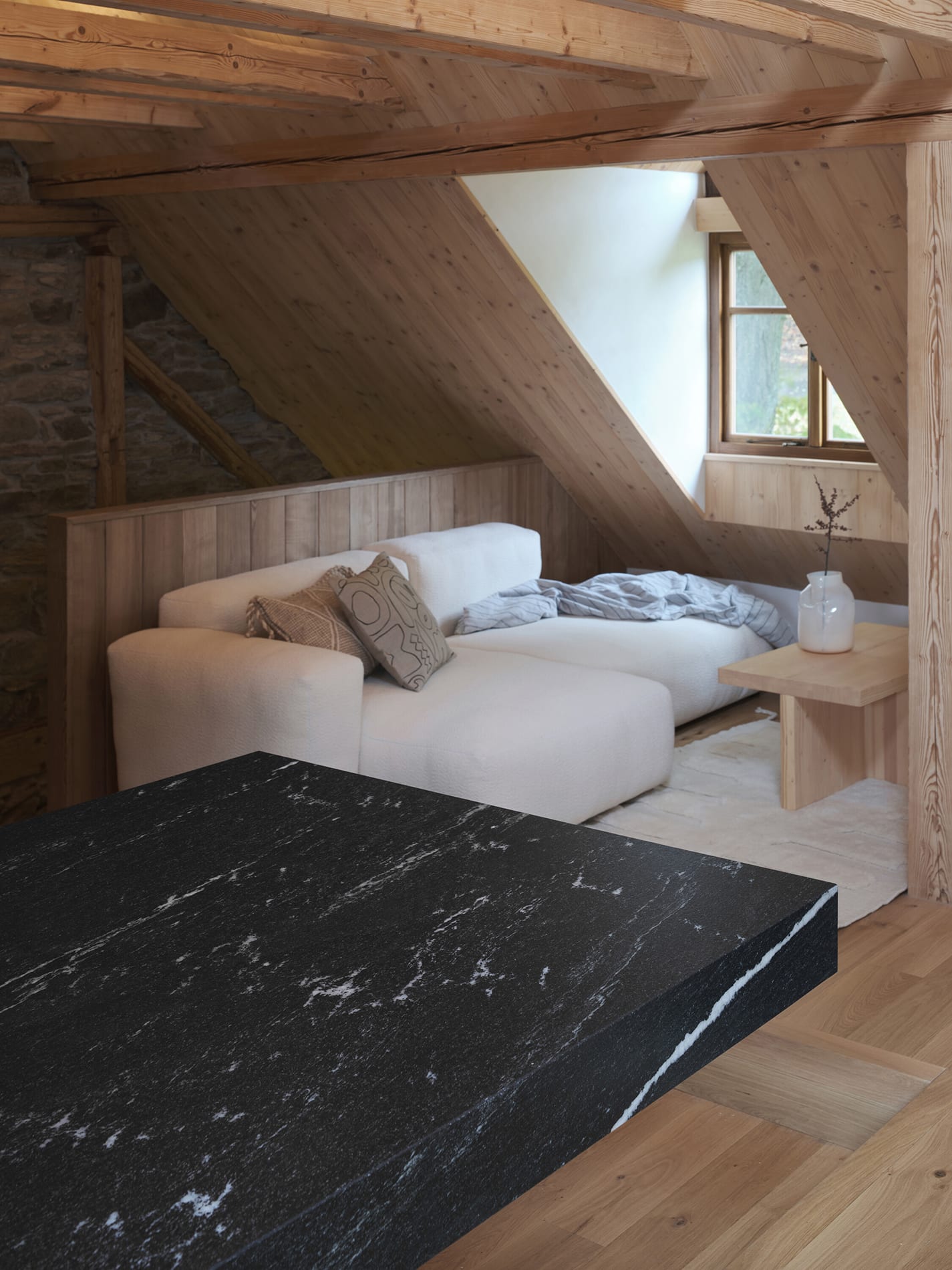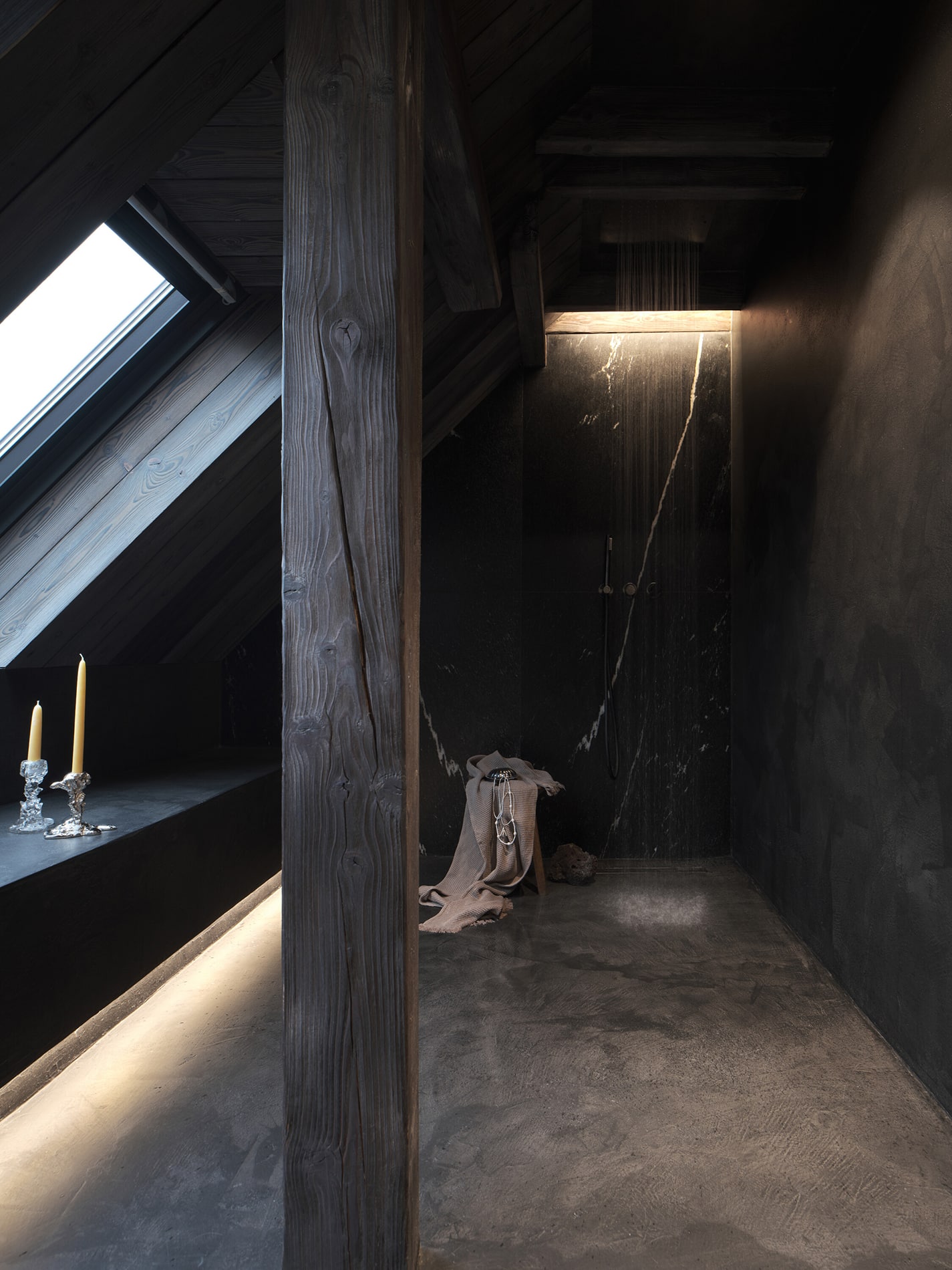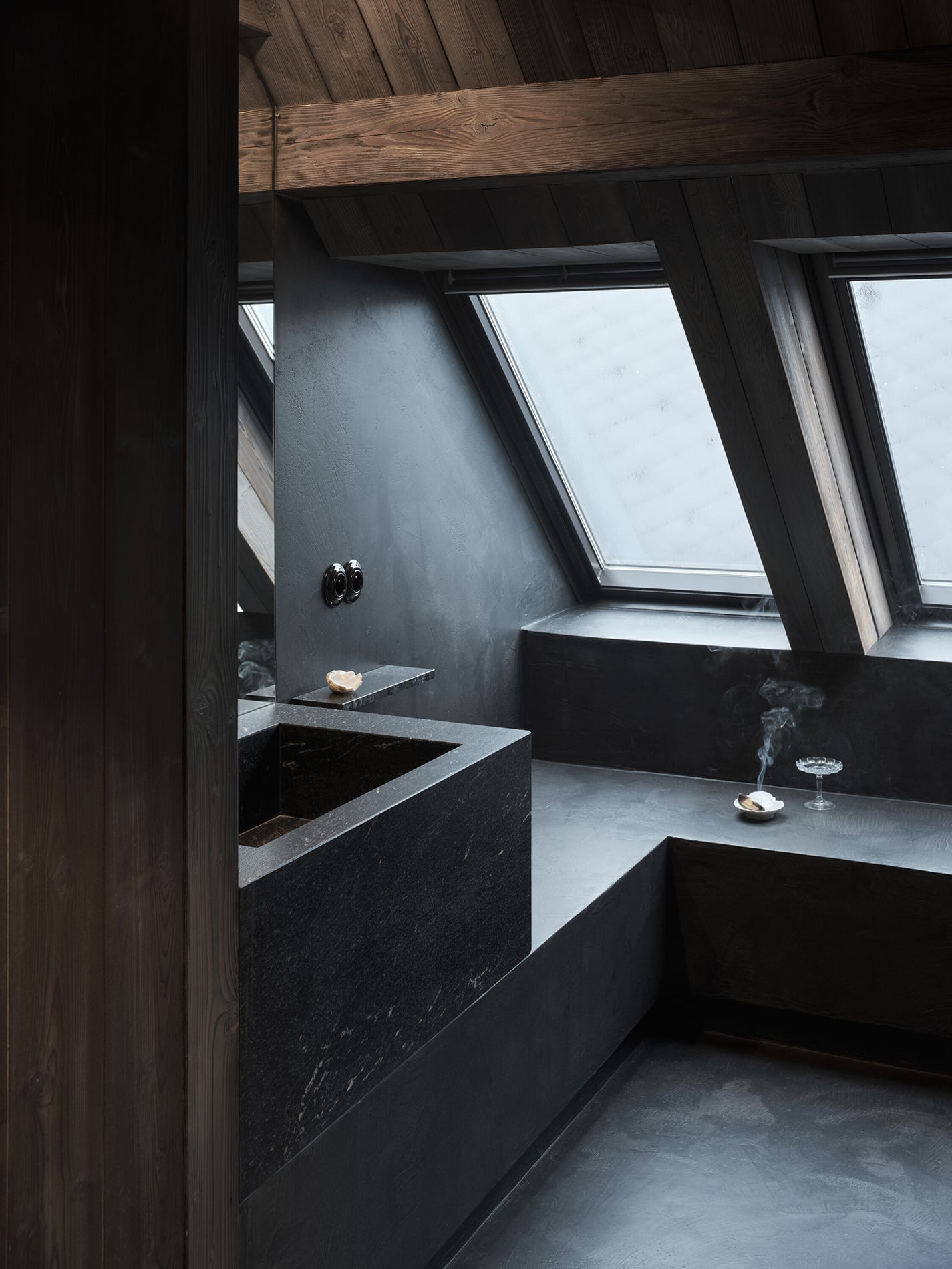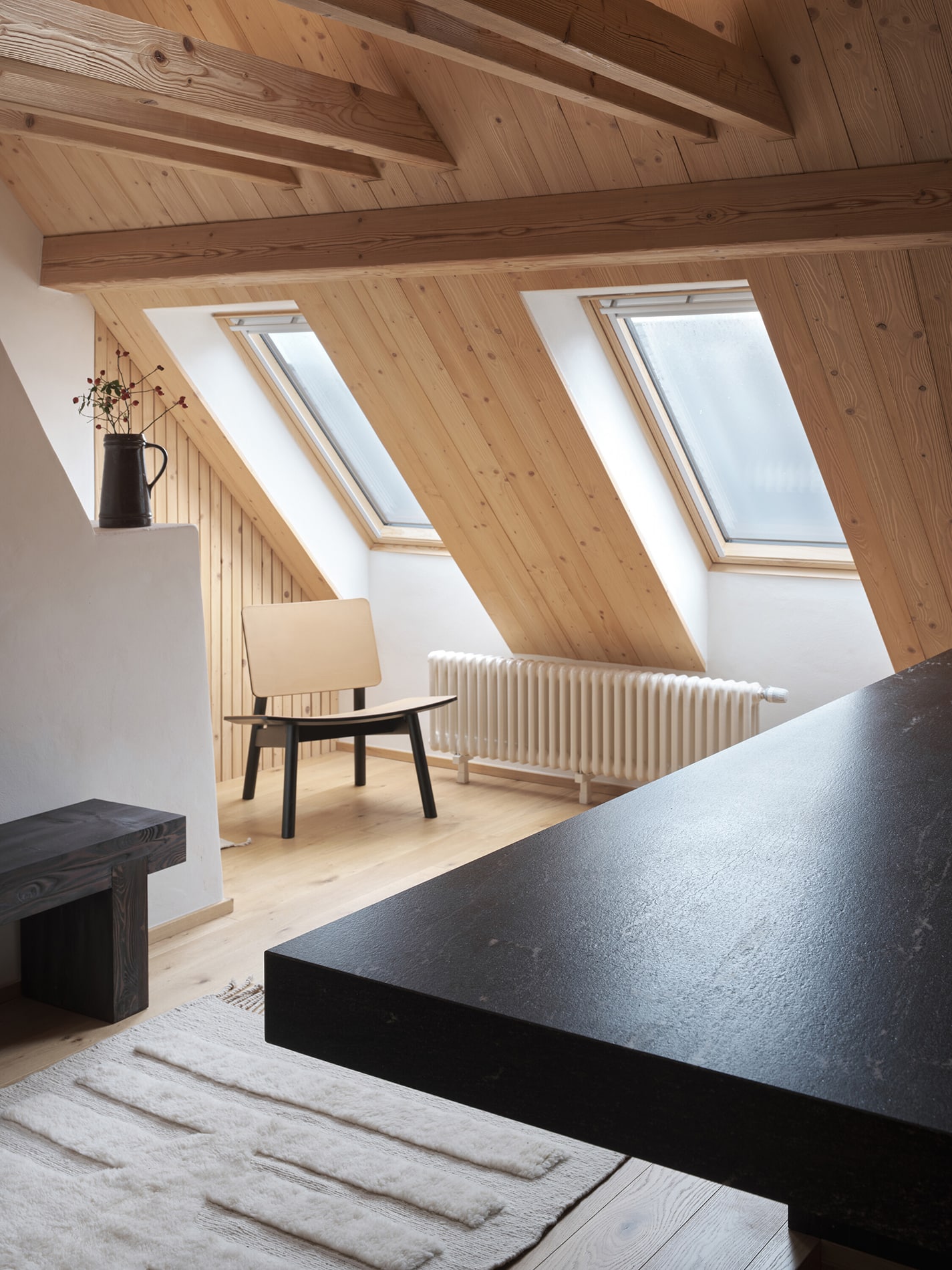 El proyecto buscaba crear un ambiente acogedor para la familia y sus huéspedes, garantizando privacidad tanto en el interior como respecto al paisaje circundante. La propuesta mantiene vínculos con la planta inferior mediante el uso de materiales como madera maciza de abeto y el muro de piedra original expuesto, mientras que la planta alta adopta un carácter propio. Los tonos oscuros y los materiales en bruto —poco comunes en interiores rurales tradicionales— contribuyen a construir una atmósfera introspectiva. Combinados con una iluminación cuidadosamente diseñada, reducen estímulos visuales y favorecen la concentración y el descanso.