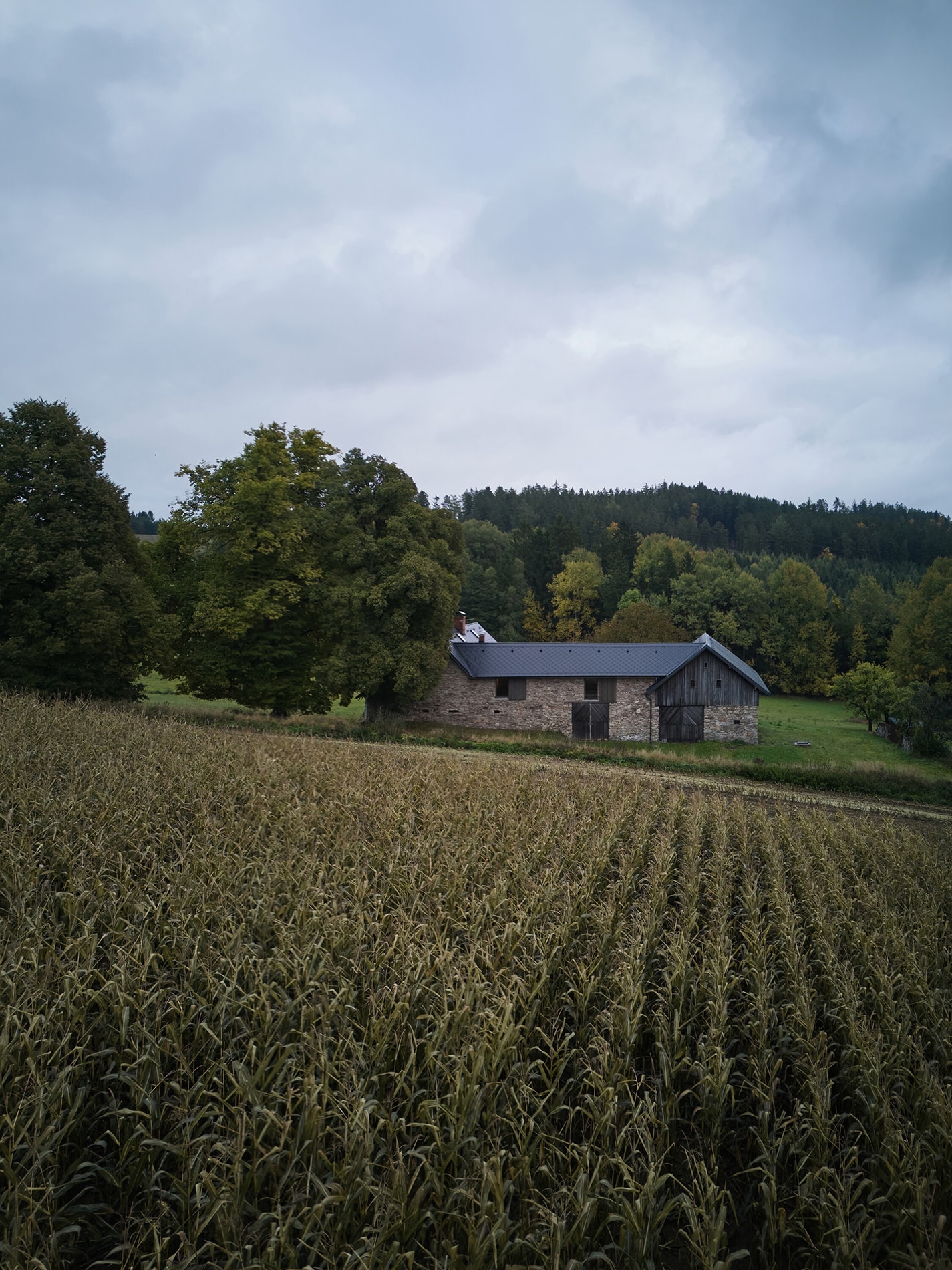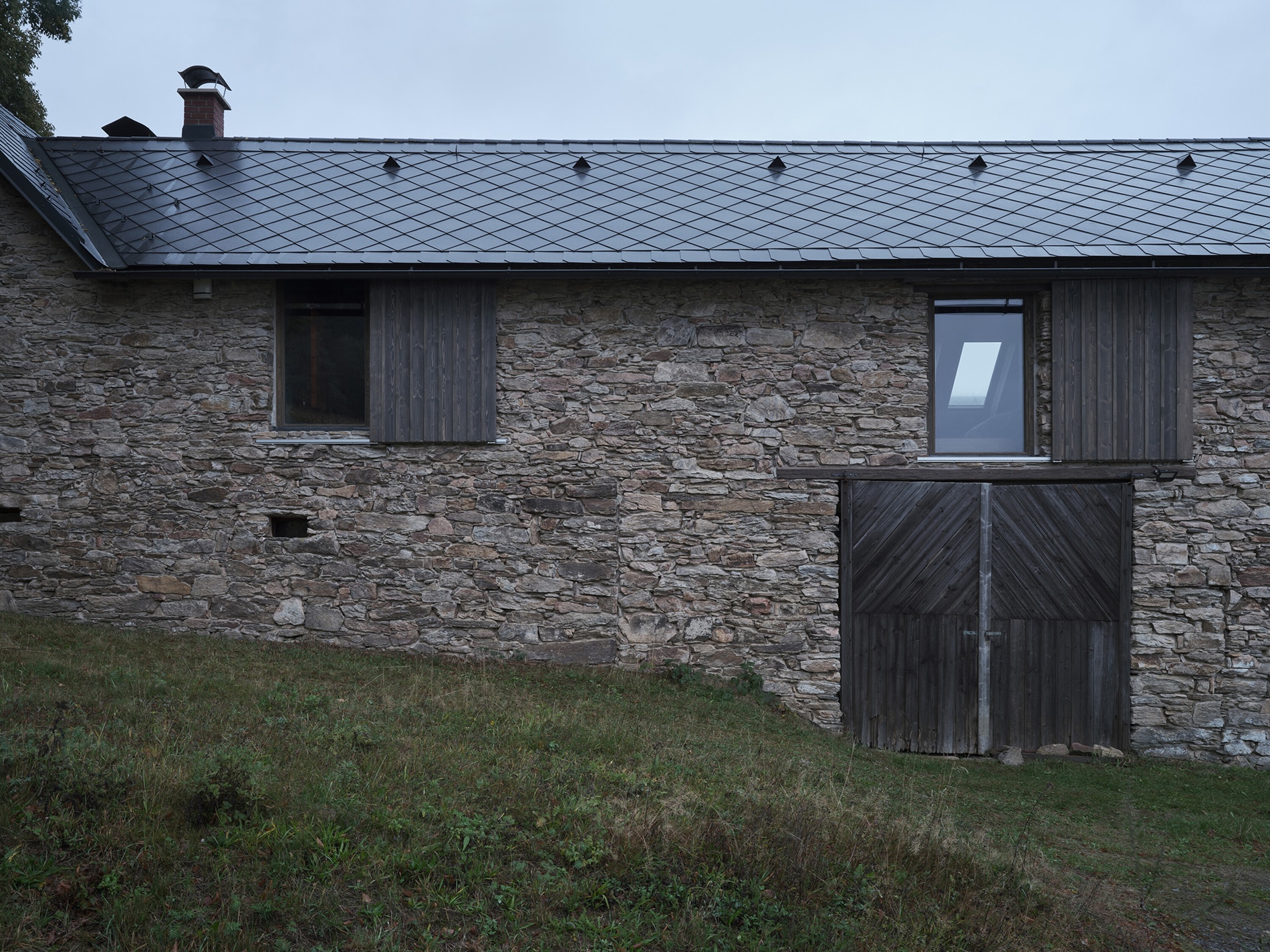 El proyecto reutiliza una antigua granja situada en el paisaje ondulado de la región de Vysočina. Su construcción comenzó alrededor de 1820 y se completó hacia finales del siglo XIX. La casa rural se orienta hacia el acceso mediante un muro de piedra y portones de madera, mientras que la vivienda principal se sitúa en el borde del terreno con vistas al bosque. La familia propietaria adquirió el inmueble en 1993 e inició de forma gradual la restauración del exterior. En 2020 se renovó la planta baja y posteriormente el despacho Plus One Architects fue encargado de intervenir la planta alta.