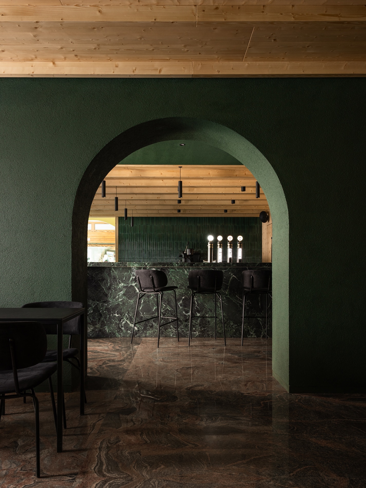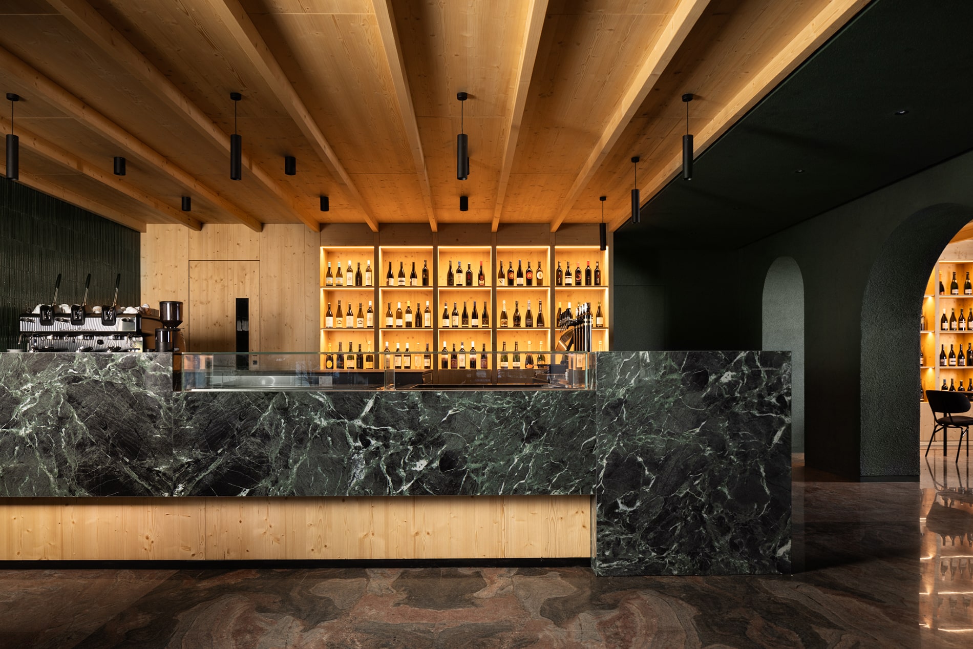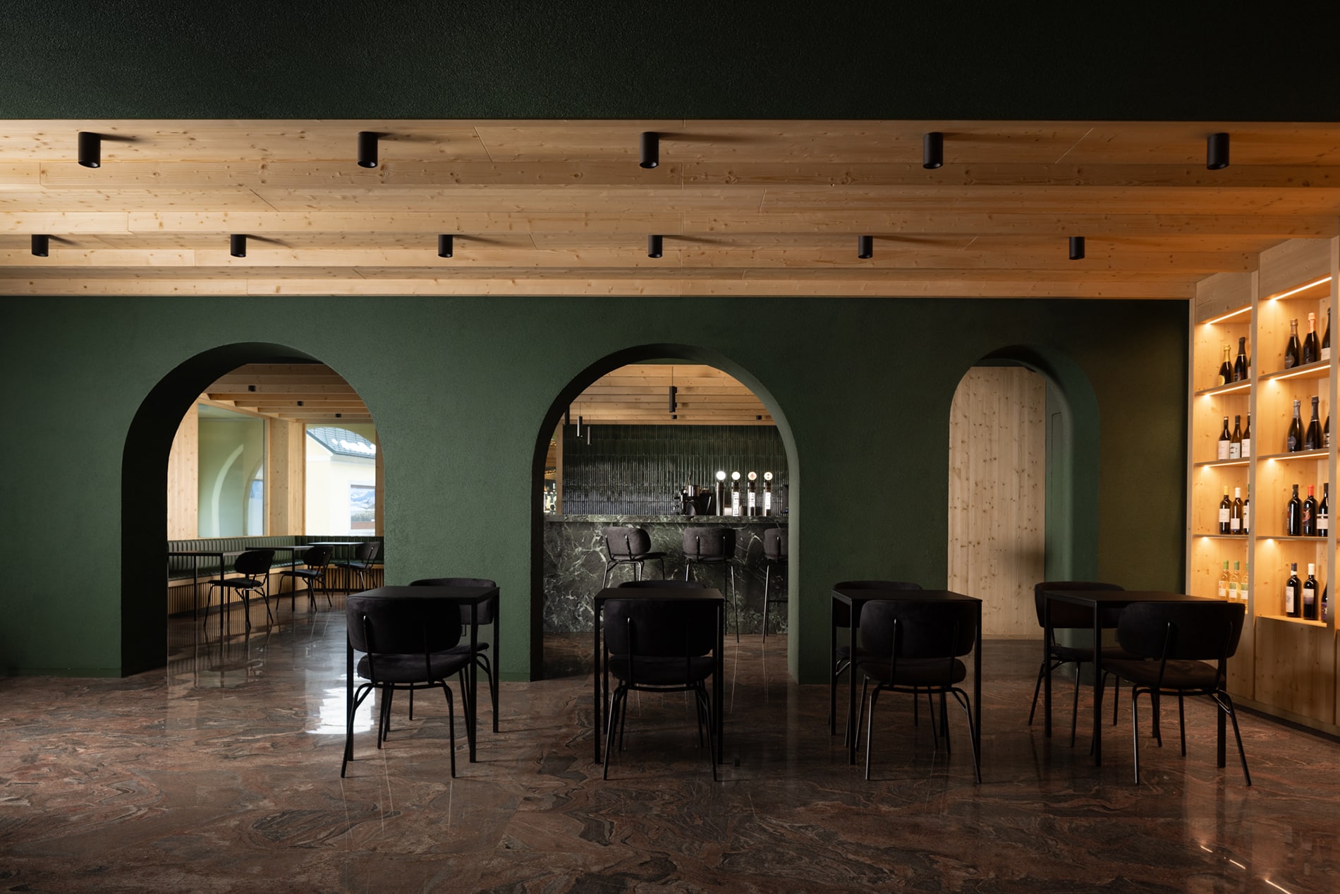 El diseño toma como punto de partida el piso de mármol existente, caracterizado por tonos cambiantes de verde bosque y marrón rojizo profundo. Desde esta base surge una paleta que reinterpreta el entorno alpino: madera de abeto para muros y estructura, y el verde expresado a través de una variedad de materiales —mármol, cerámica vidriada y yeso texturizado. Los materiales definen la experiencia espacial, mientras que amplias aperturas acristaladas establecen una conexión visual con la calle, enmarcando la vida cotidiana. De este modo, el Caffè Nazionale se convierte en un lugar de encuentro e identidad compartida, en diálogo permanente con su entorno.