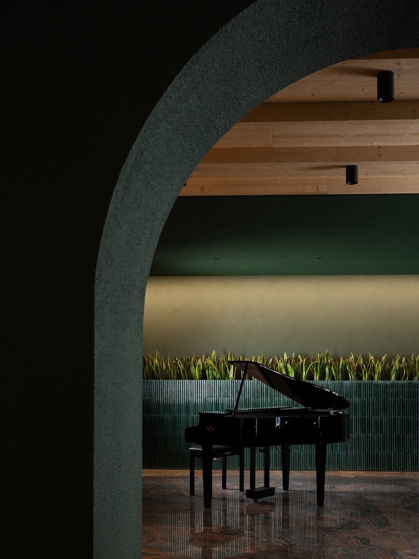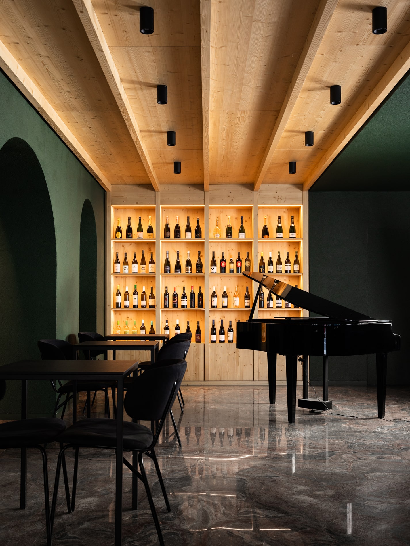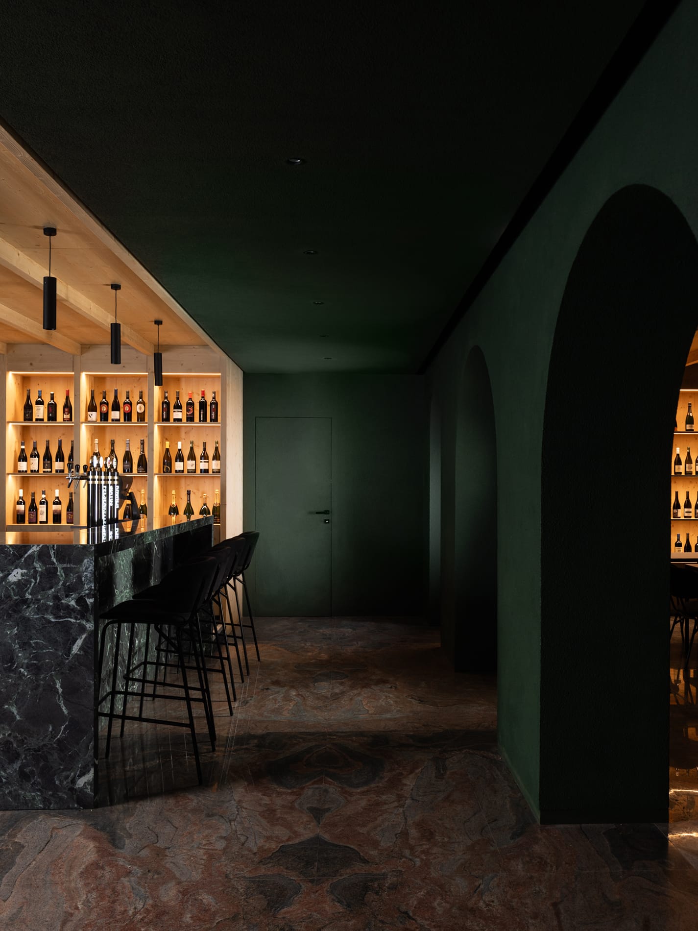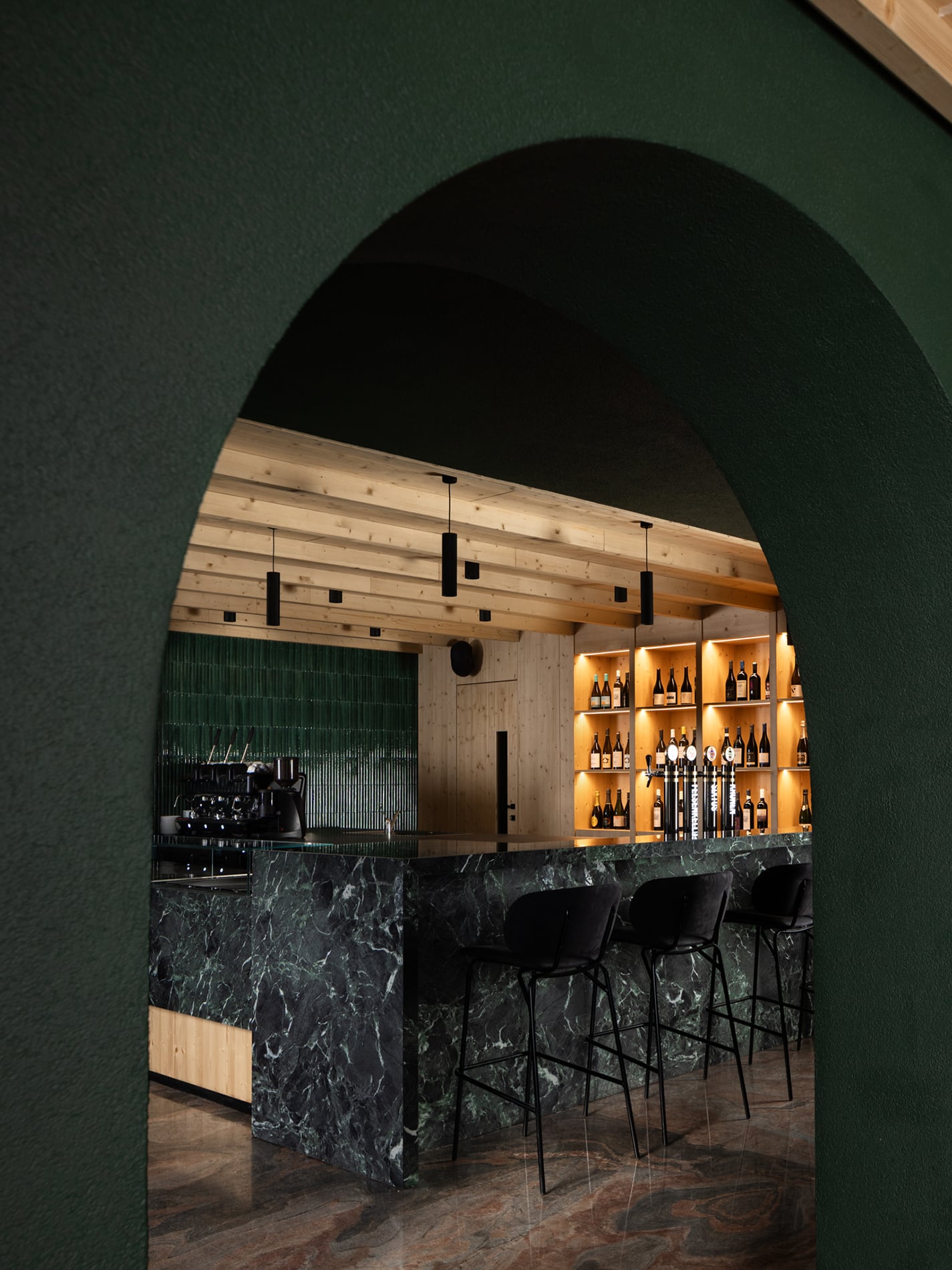 El diseño toma como punto de partida el piso de mármol existente, caracterizado por tonos cambiantes de verde bosque y marrón rojizo profundo. Desde esta base surge una paleta que reinterpreta el entorno alpino: madera de abeto para muros y estructura, y el verde expresado a través de una variedad de materiales —mármol, cerámica vidriada y yeso texturizado. Los materiales definen la experiencia espacial, mientras que amplias aperturas acristaladas establecen una conexión visual con la calle, enmarcando la vida cotidiana. De este modo, el Caffè Nazionale se convierte en un lugar de encuentro e identidad compartida, en diálogo permanente con su entorno.