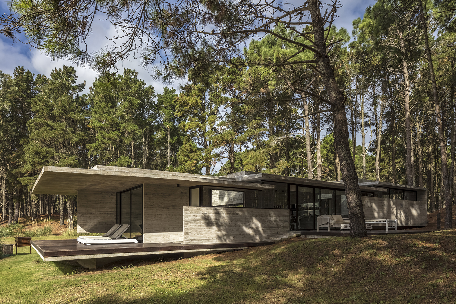 Costa Esmeralda es una inversión privada sobre los médanos de la costa bonaerense, a 390 kilómetros de Buenos Aires. Se trata de una urbanización reciente con una forestación joven de acacias y pinos marítimos y algunos sectores de bosque consolidado. El terreno, con un extenso frente de cuarenta y cinco metros, pertenece a este último sector, de manera que la casa debía incorporar ese paisaje privilegiado, aunque cuidando de preservar su intimidad hacia la calle. Había que considerar también que el médano del que forma parte tiene una pendiente de casi dos metros sobre el frente y que, si bien su entorno posee una densa arboleda, el terreno cuenta con especies solo parcialmente.