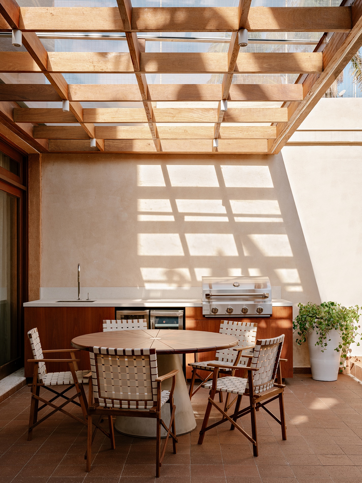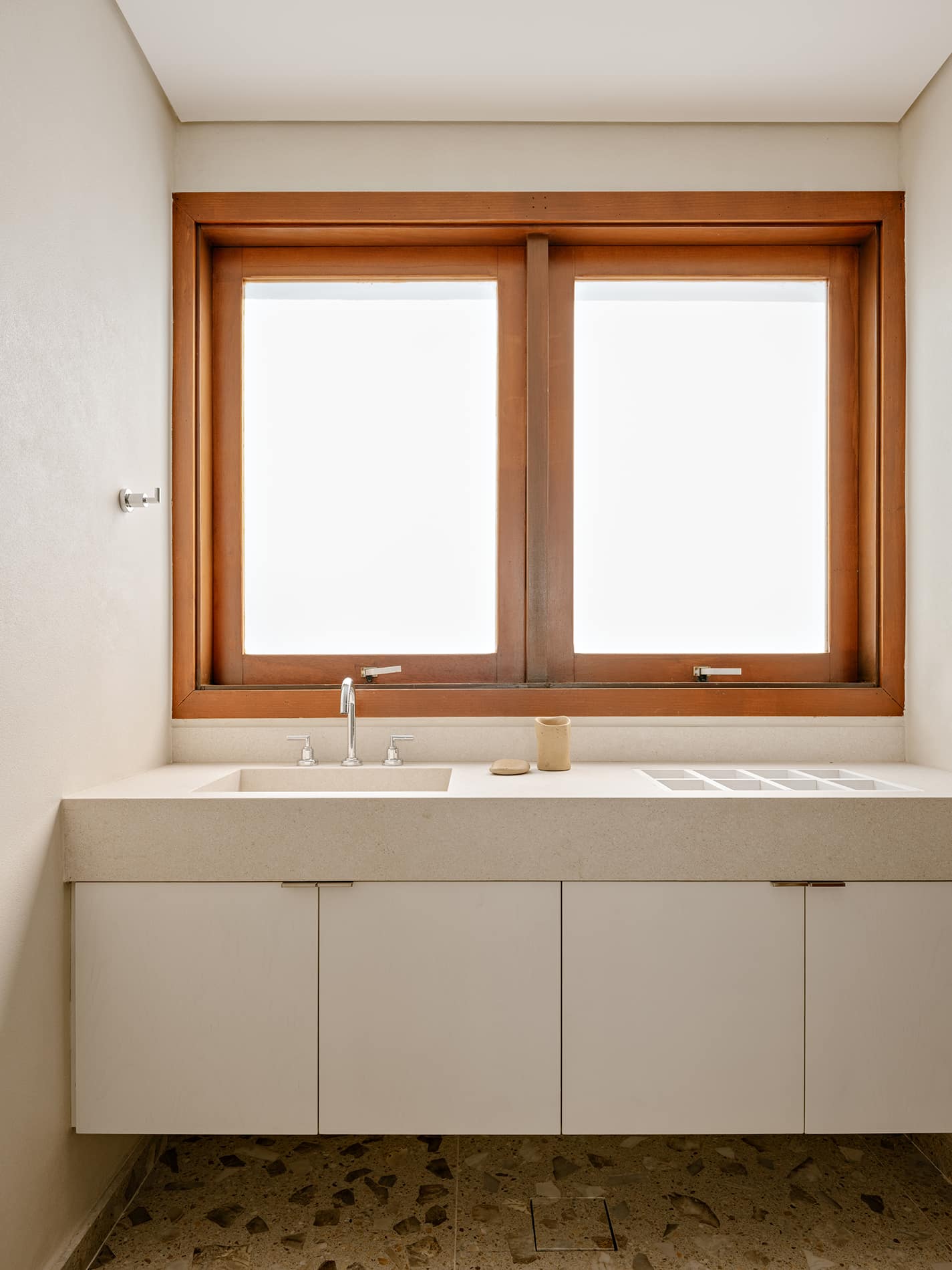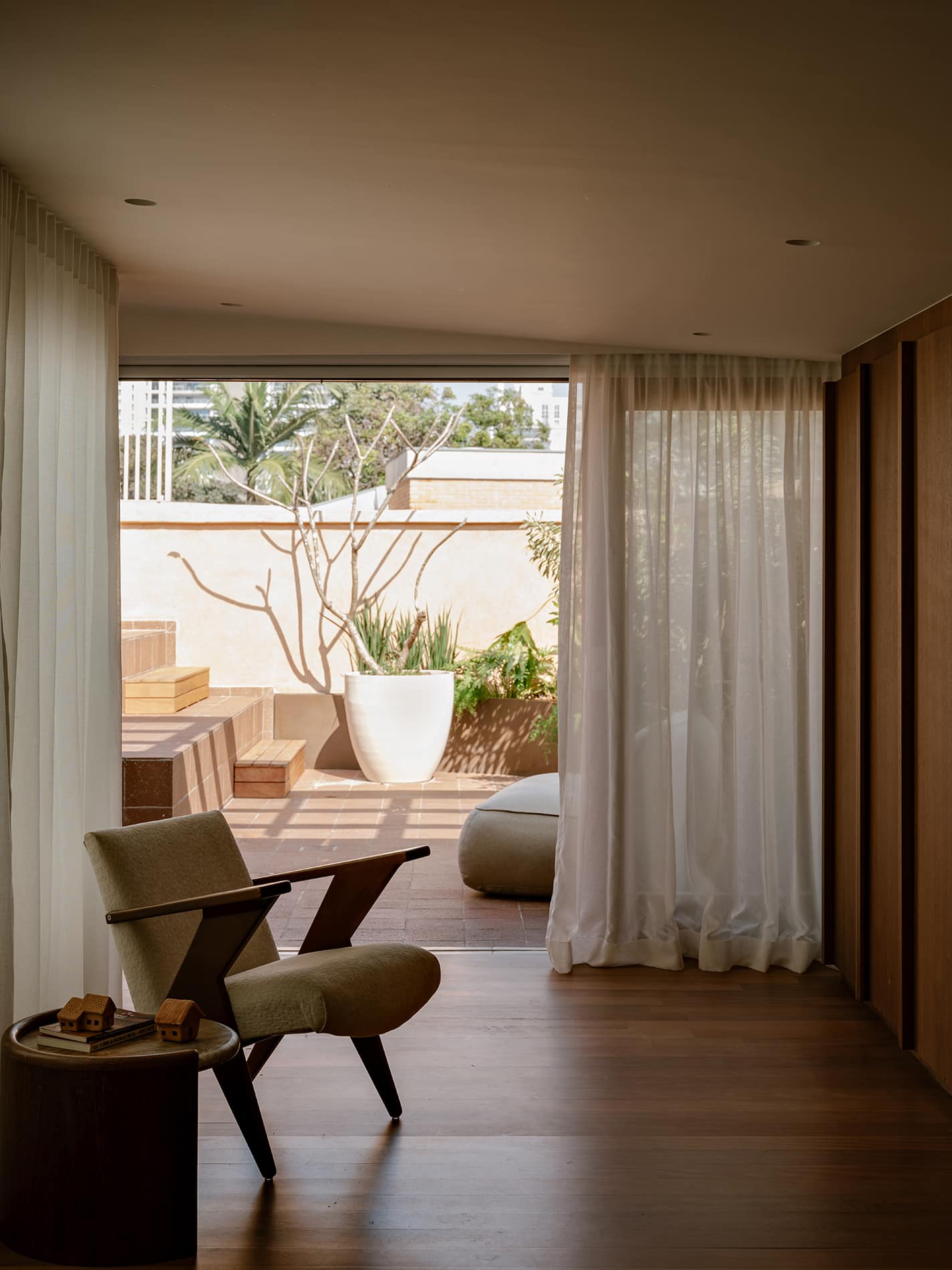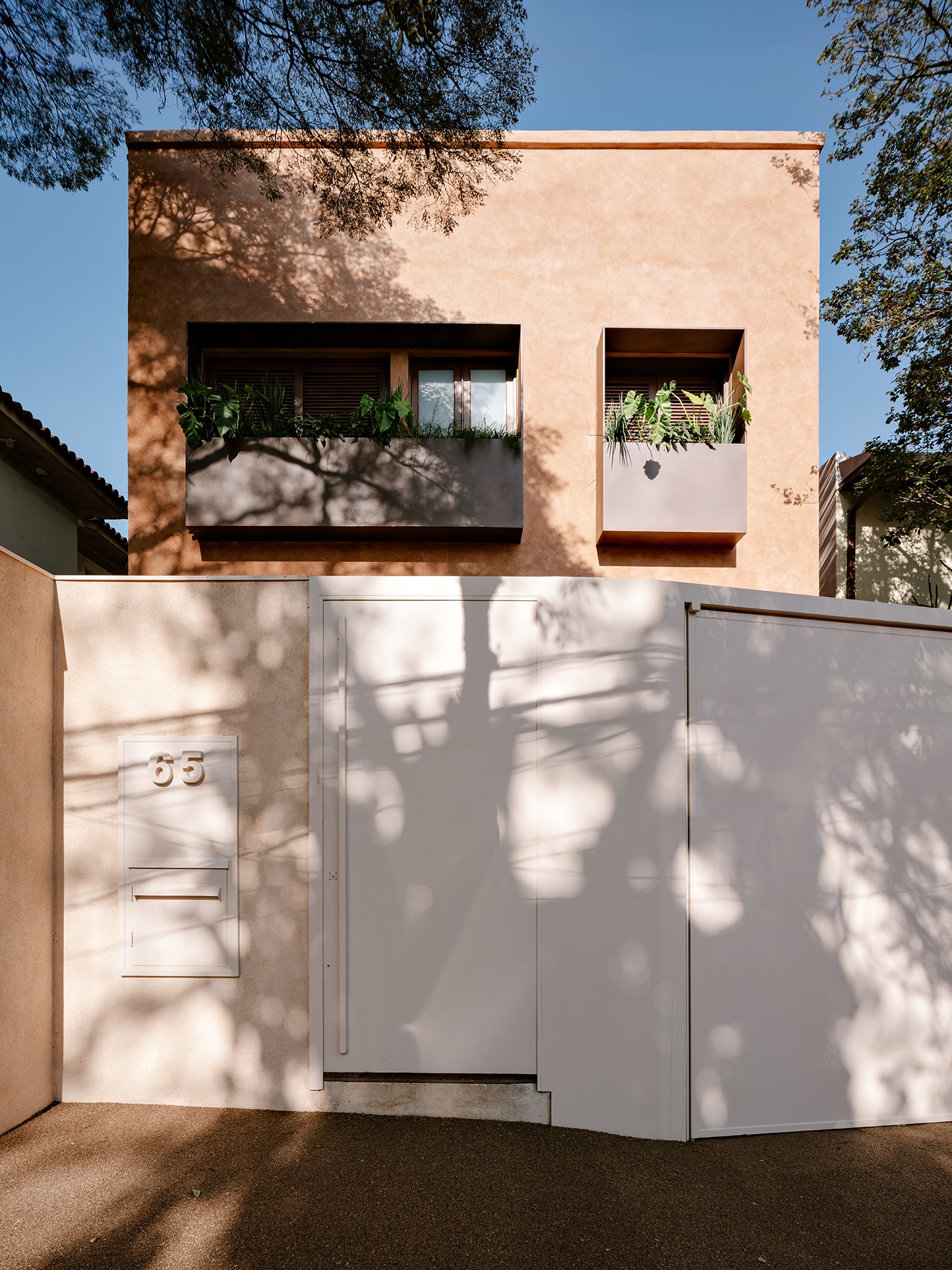 Desde la aproximación, la mirada se encuentra con una composición armónica de la fachada. Los materiales, aunque distintos en textura, dialogan dentro de una paleta común de tonos terrosos, generando una identidad serena, cohesionada y singular. La materialidad fue un eje central del diseño: se eligieron elementos naturales y atemporales para aportar ligereza y calidez a los espacios. Los marcos de madera en las ventanas, acompañados por jardineras, aparecen como gestos delicados que integran naturaleza y arquitectura, revelando desde el exterior la intención de una experiencia habitacional sensible, profundamente vinculada con su entorno y con el paso del tiempo.
