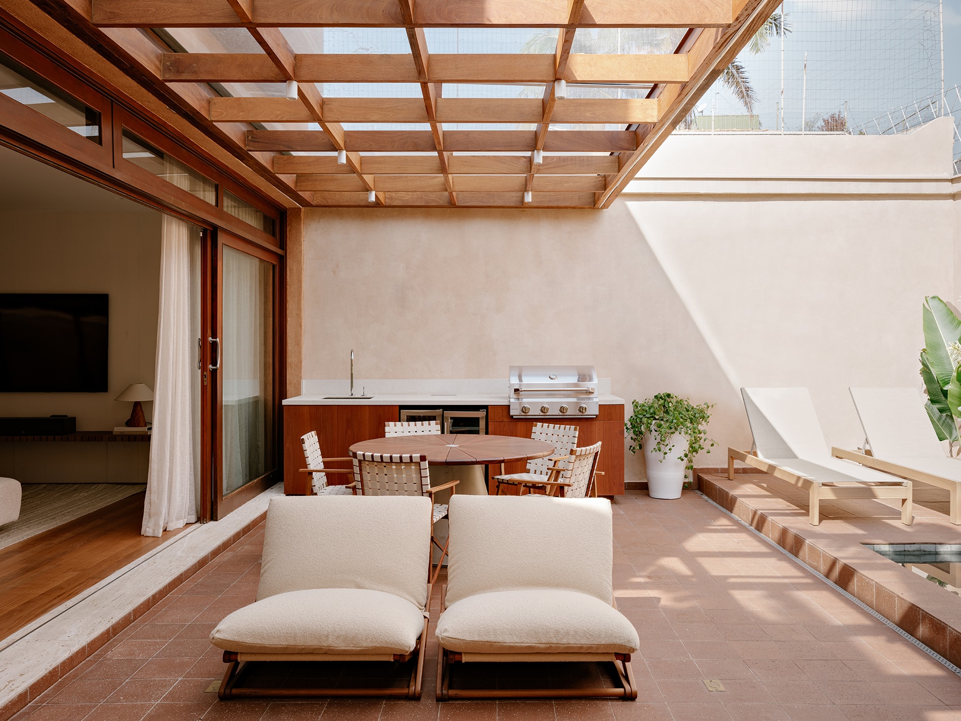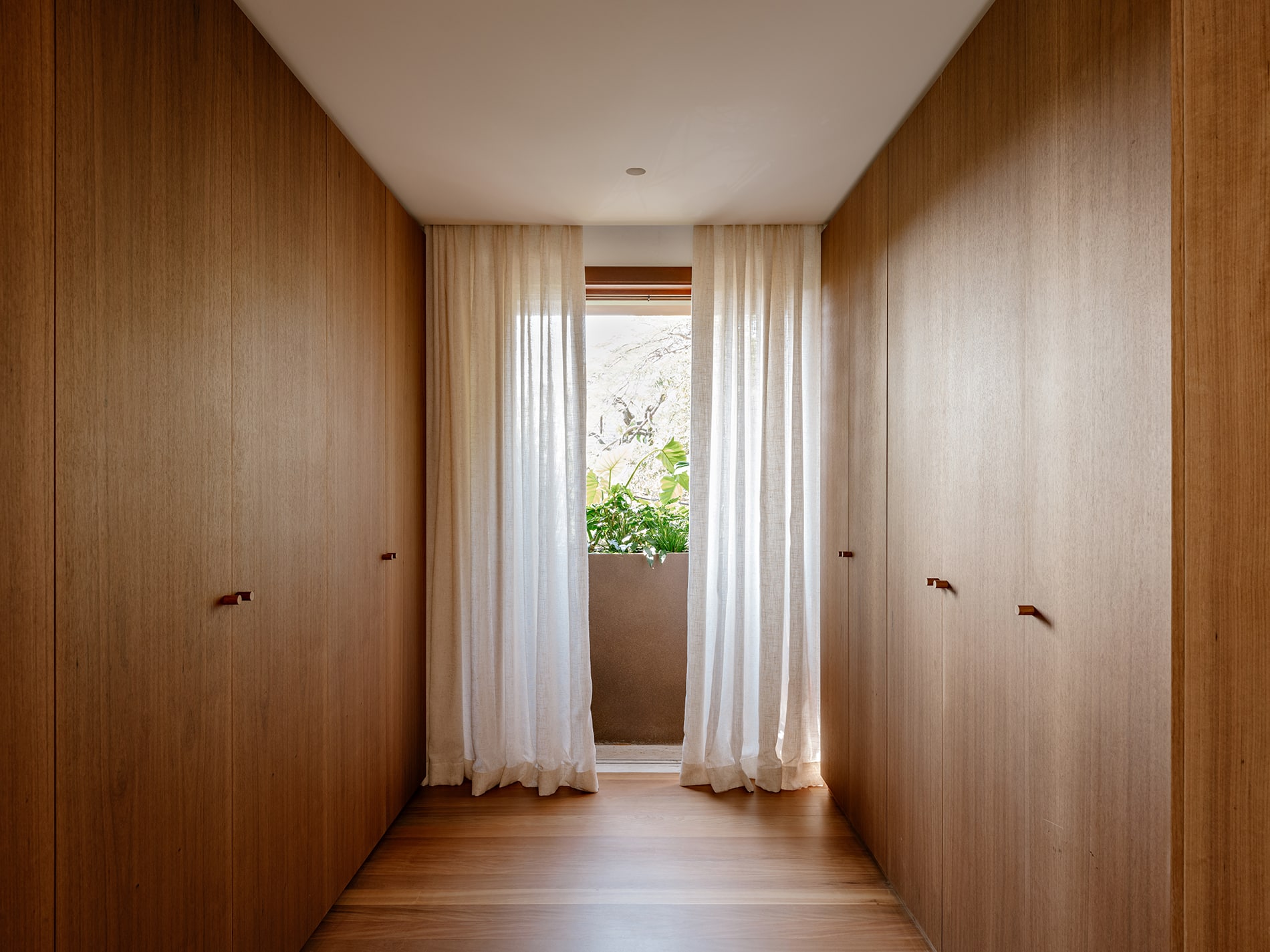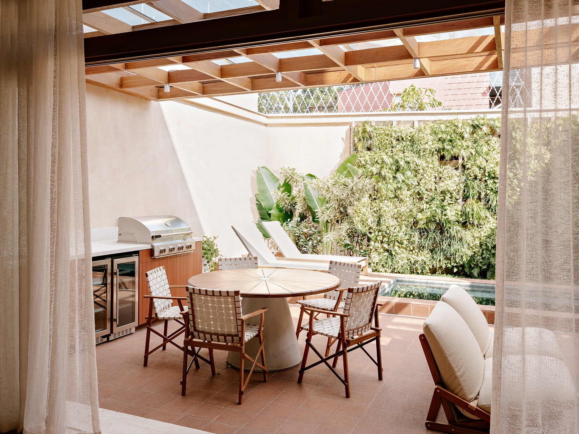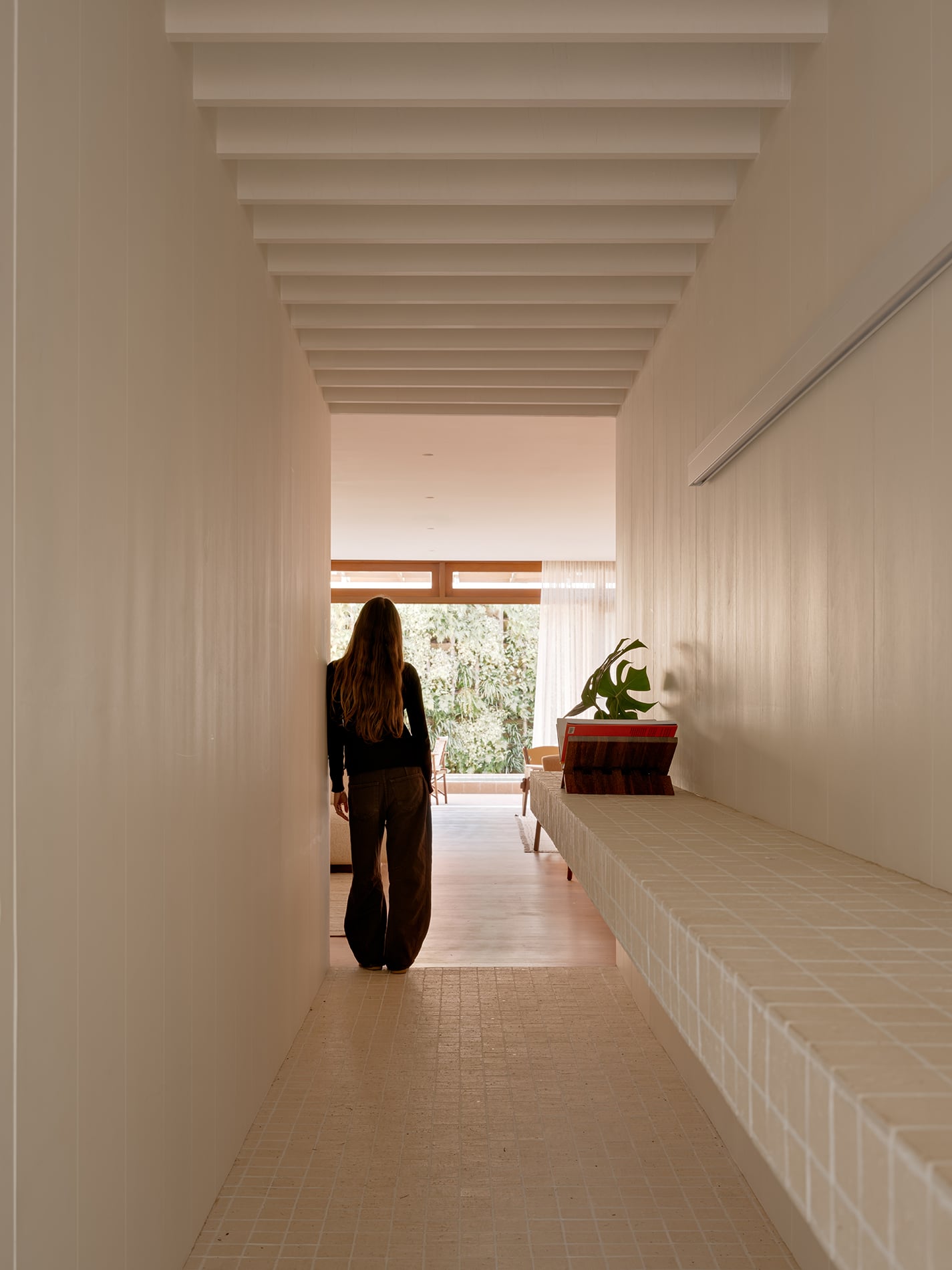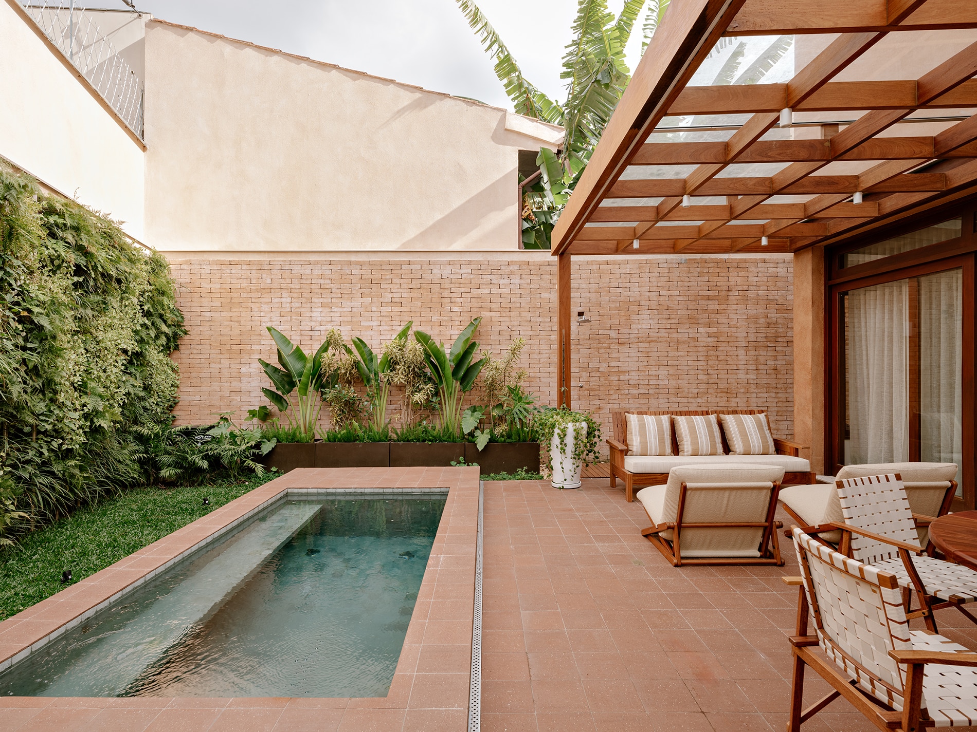 La vegetación no se limita al jardín: asciende por la fachada, se filtra a través de las ventanas y se proyecta hacia el interior como un paisaje vivo que acompaña los dormitorios. Desde el primer contacto con la casa, se percibe una invitación sutil a detenerse y contemplar.