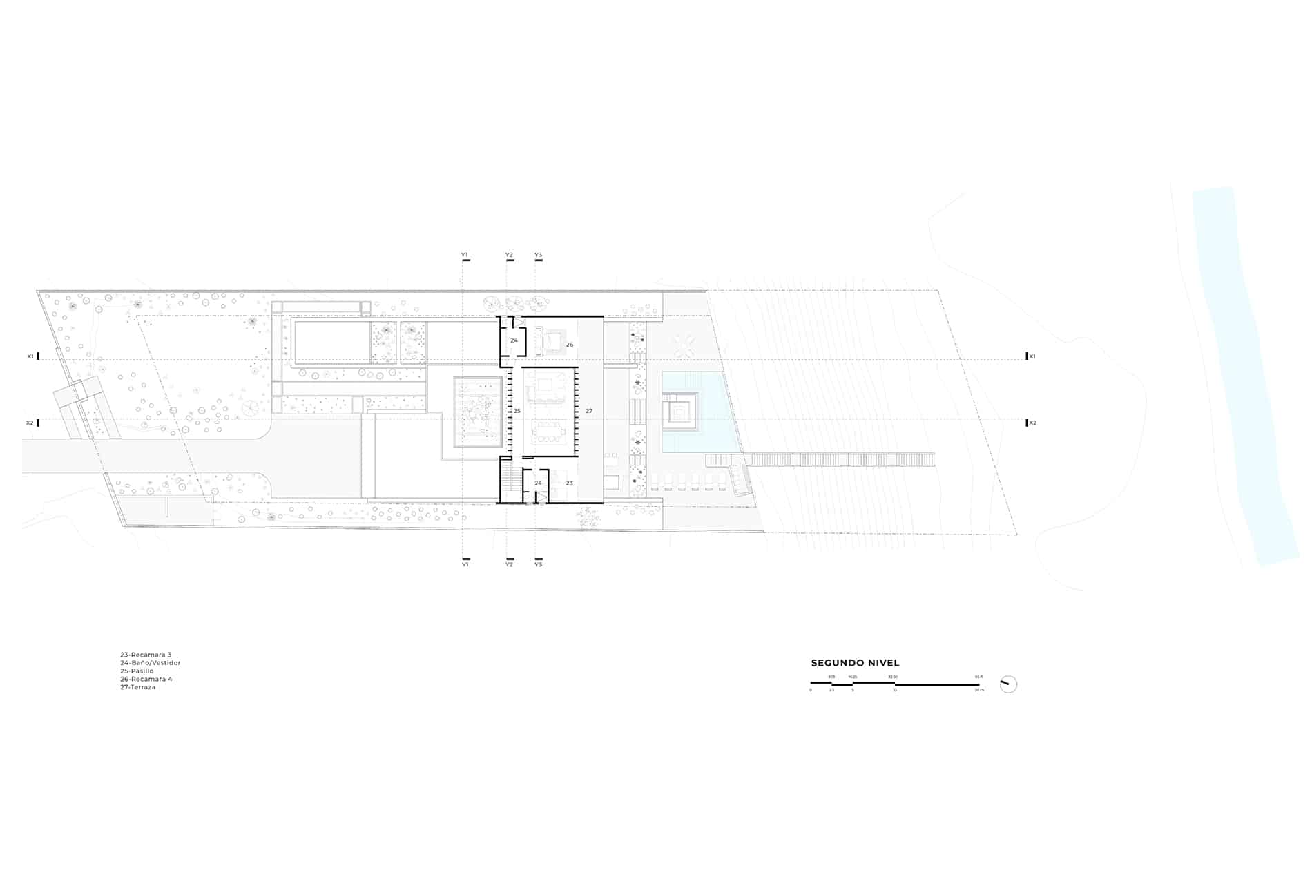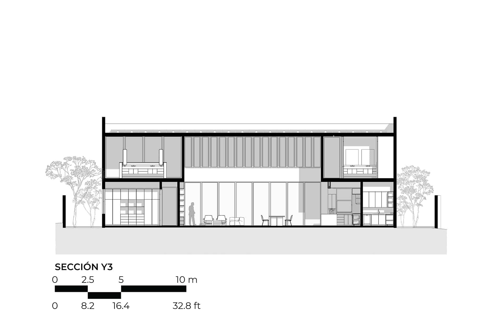 Una pérgola perimetral de concreto permite la entrada de luz natural y aire fresco. Este espacio se diseñó para permitir que las condiciones climáticas se filtraran al hogar de manera controlada, prescindiendo de cubiertas de cristal que se afectaran durante la temporada de huracanes. Al centro, una apertura rectangular permite que un árbol torote se levante, convirtiéndose en punto focal rodeado de vegetación endémica y un piso de barro que refuerza el carácter regional.