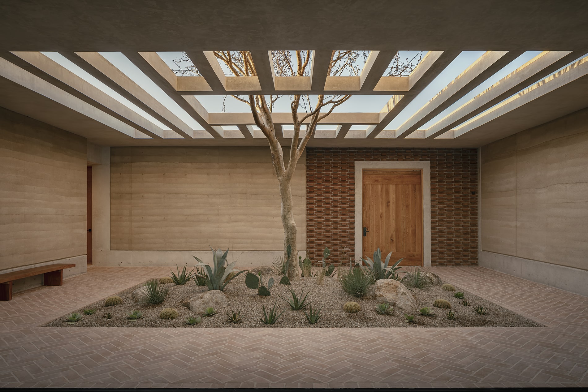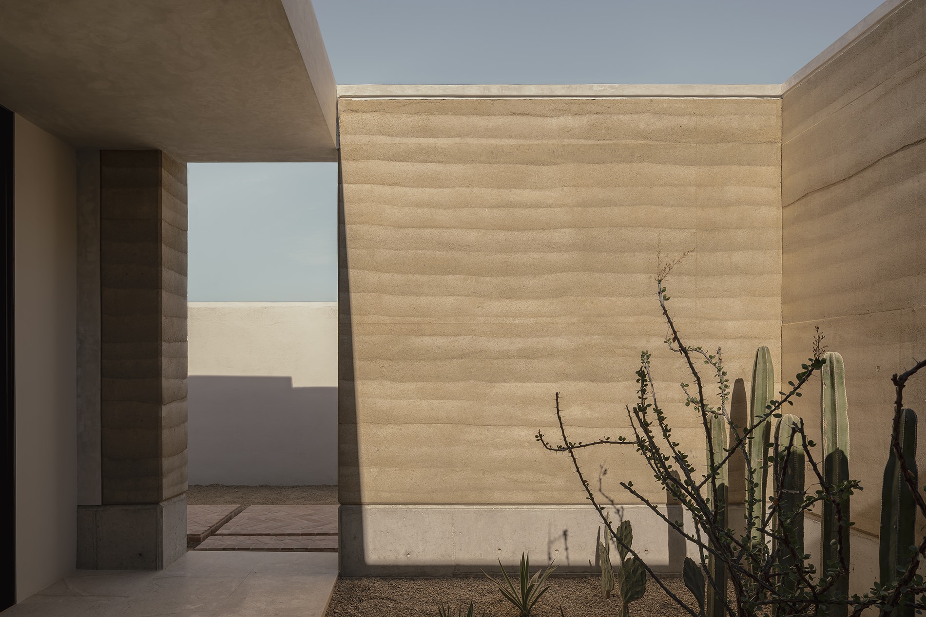 El acceso a la casa está marcado por un muro ciego que resguarda la privacidad, dejando visibles únicamente los accesos peatonal y vehicular. Desde ahí, los muros de tierra compactada del volumen principal de la casa guían al visitante hacia la entrada principal, creando una transición gradual hasta llegar a un muro de ladrillo que enmarca una puerta monumental de roble. Esta secuencia culmina en un patio central, elemento clave del proyecto. Inspirado en la arquitectura mexicana tradicional, este patio es el corazón de la casa y articula la conexión entre espacios sociales y privados.