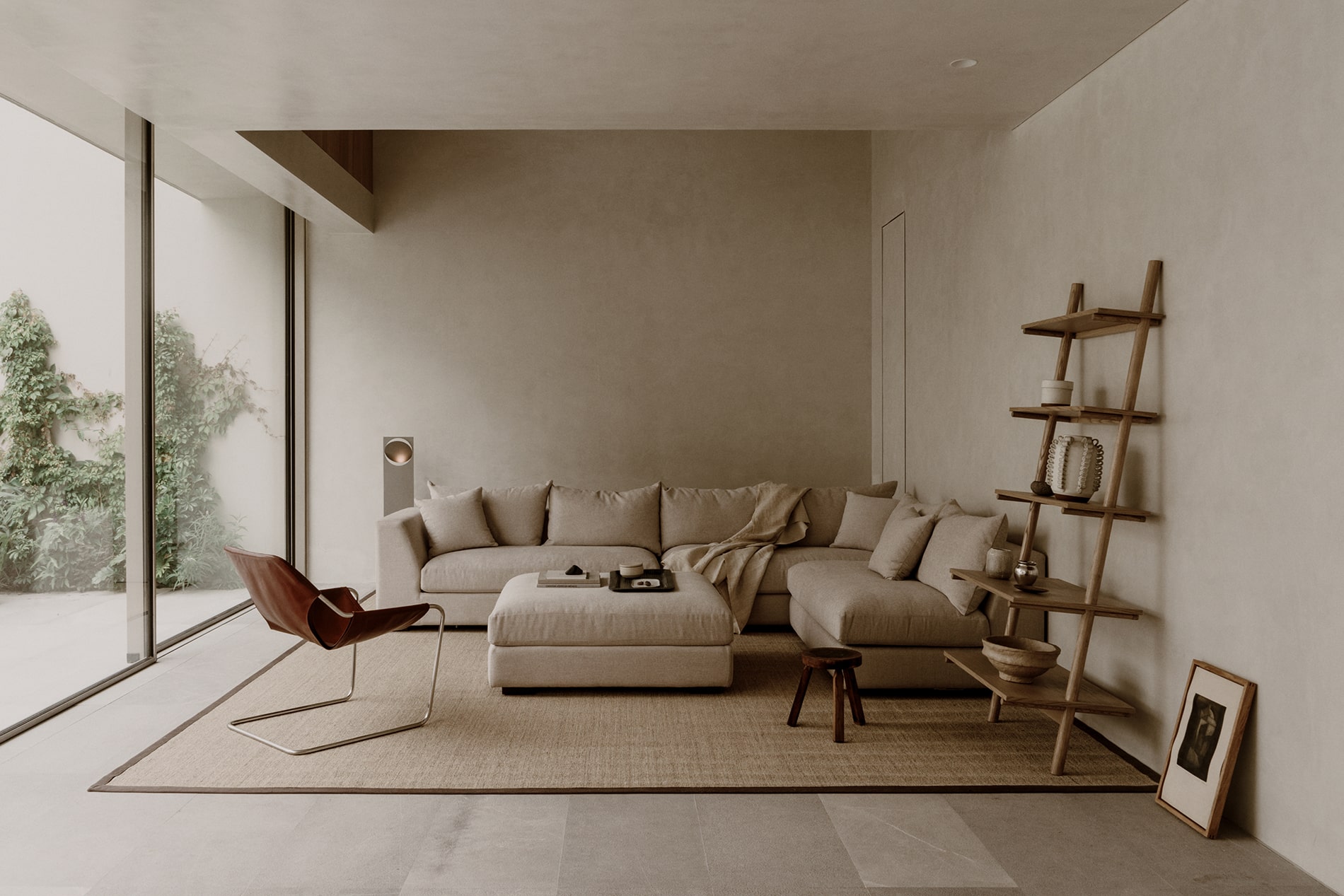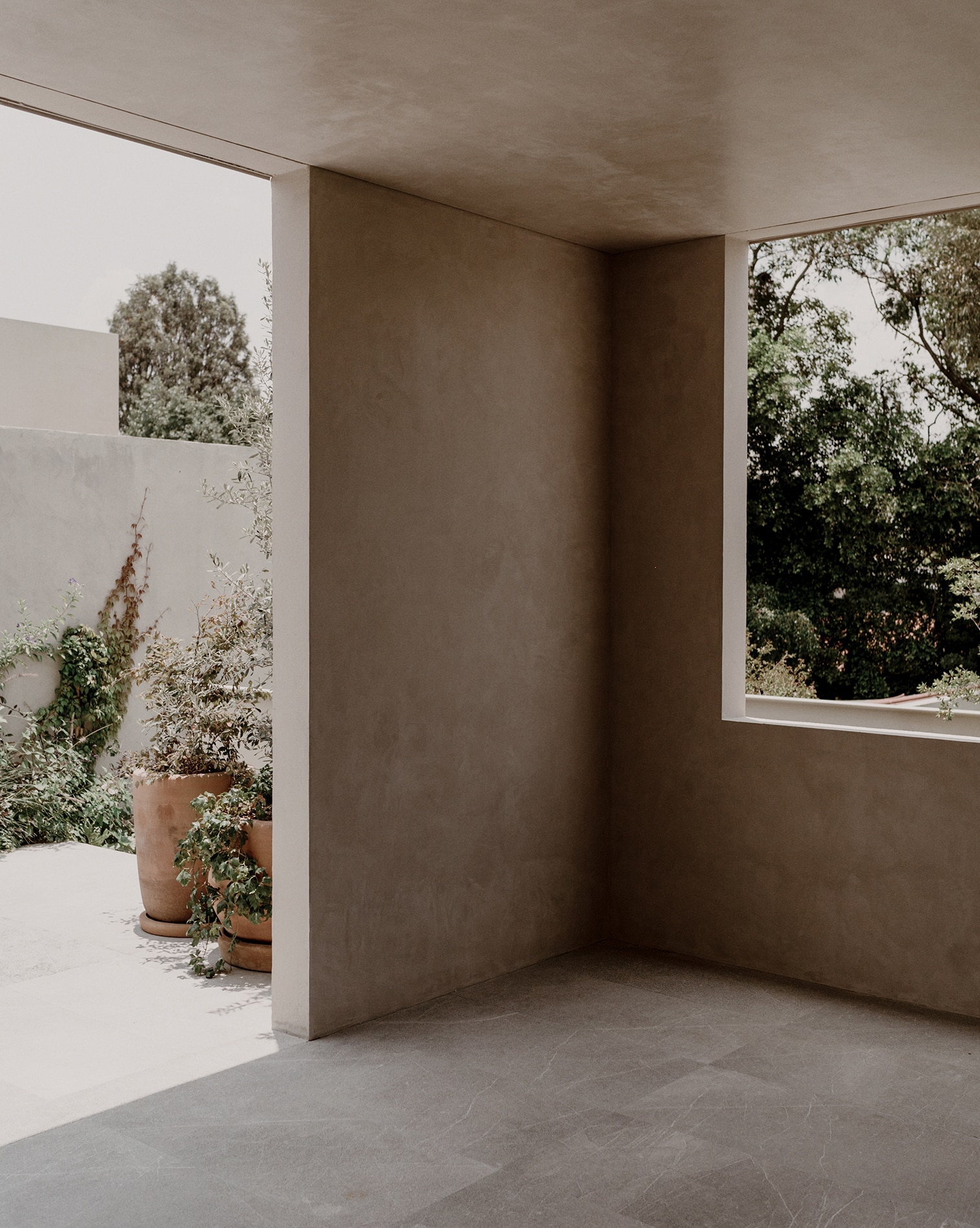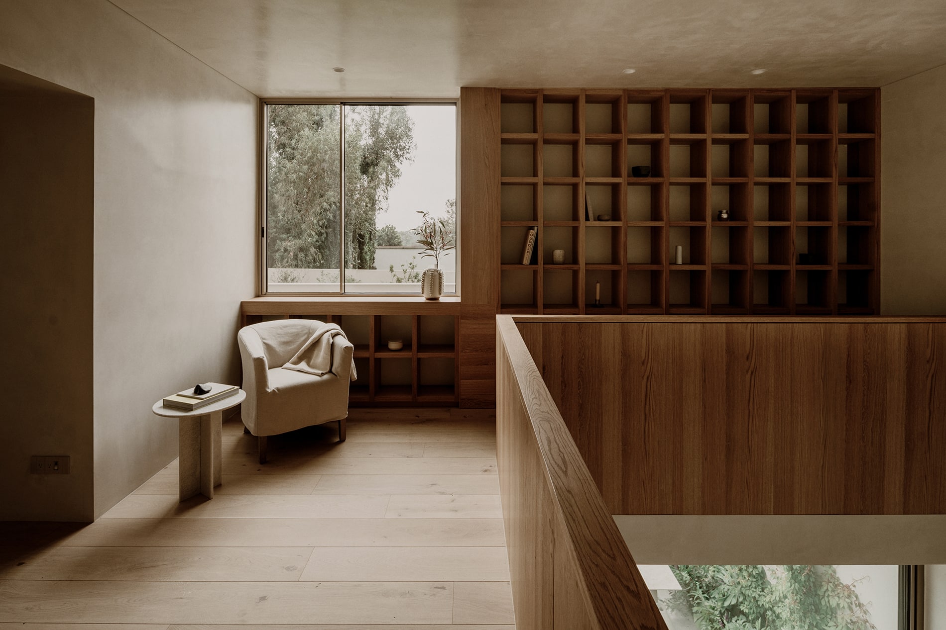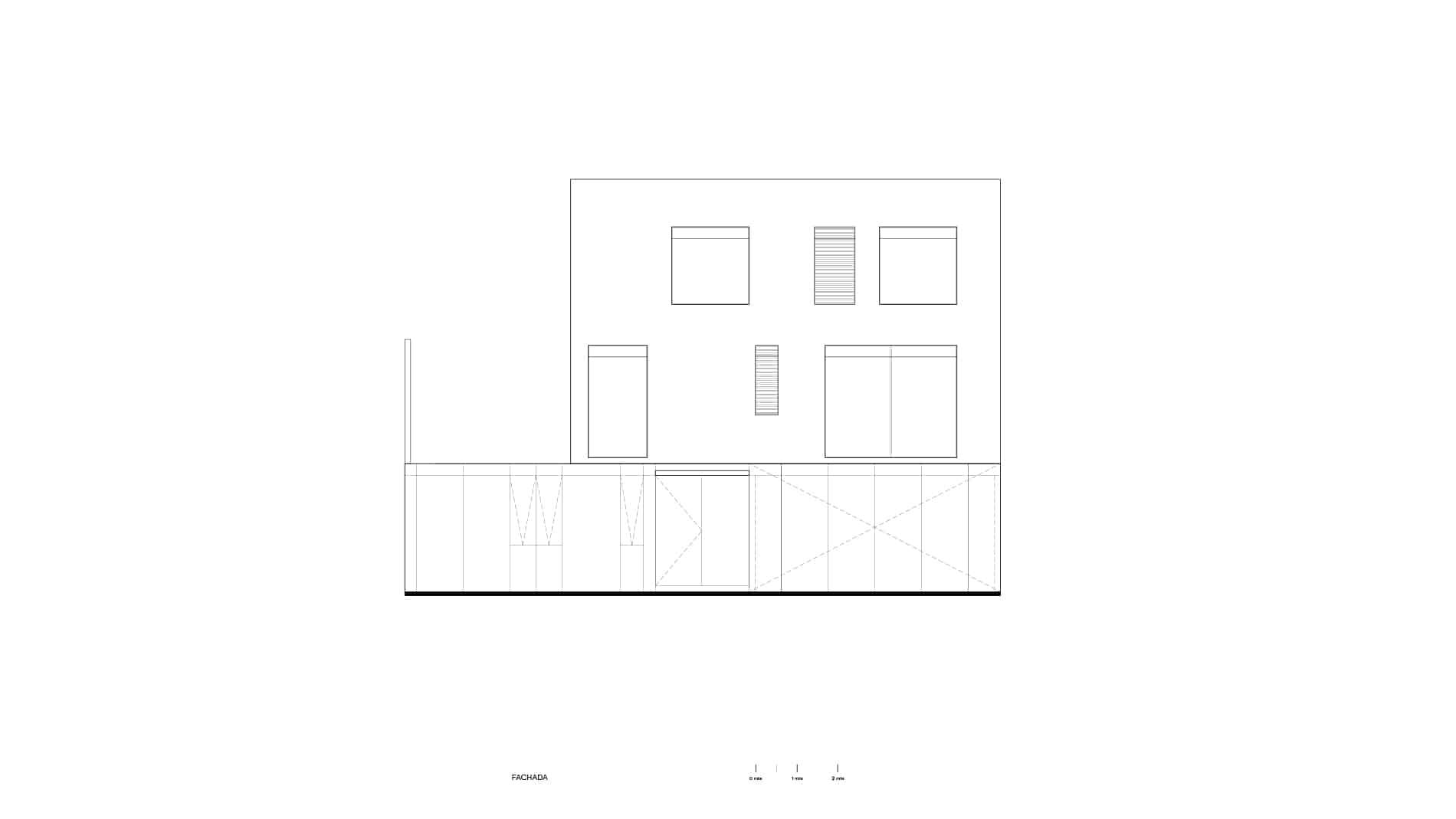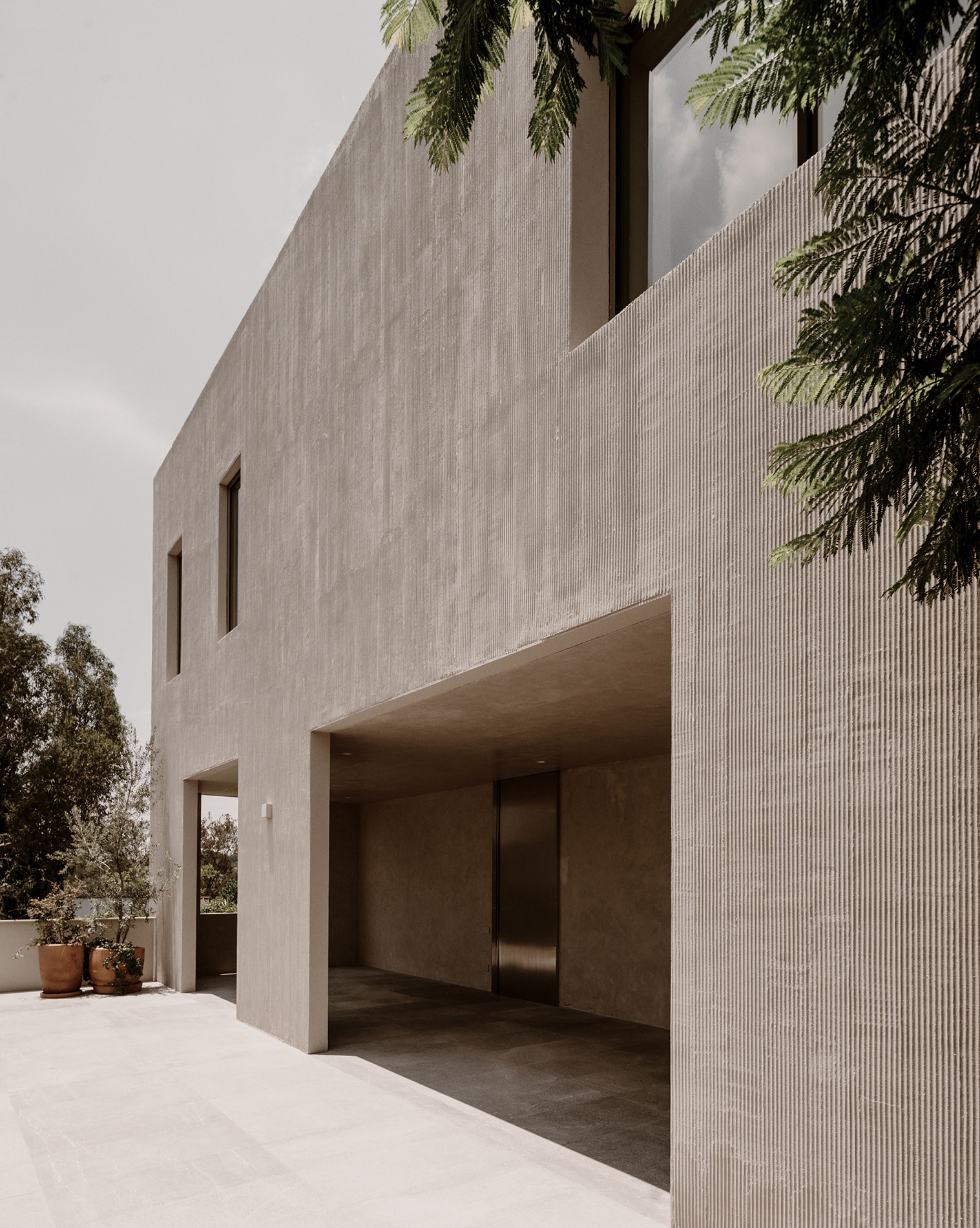 Su materialidad se acentúa mediante una textura de rayas verticales lograda con el mismo aplanado, reforzando una geometría limpia, sobria y atemporal.