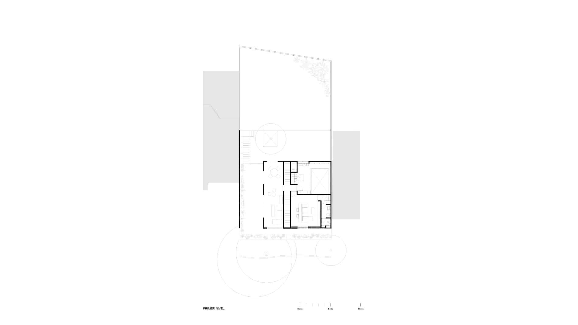 El proyecto organiza la vida social y pública de la casa en la planta baja, concebida como un plano abierto, permeable y profundamente vinculado al paisaje. Este nivel se abre por completo hacia el jardín posterior, generando una relación directa y continua entre los espacios interiores y la vegetación existente, construyendo una atmósfera natural y verde que define la experiencia cotidiana de la vivienda.