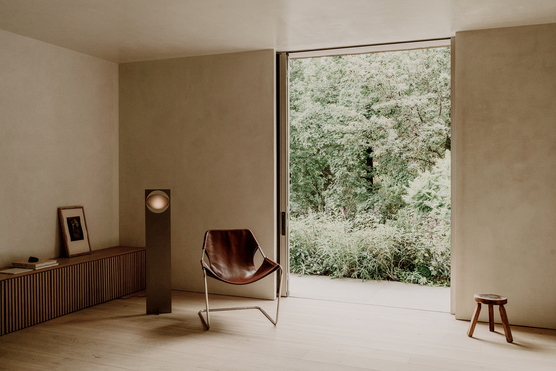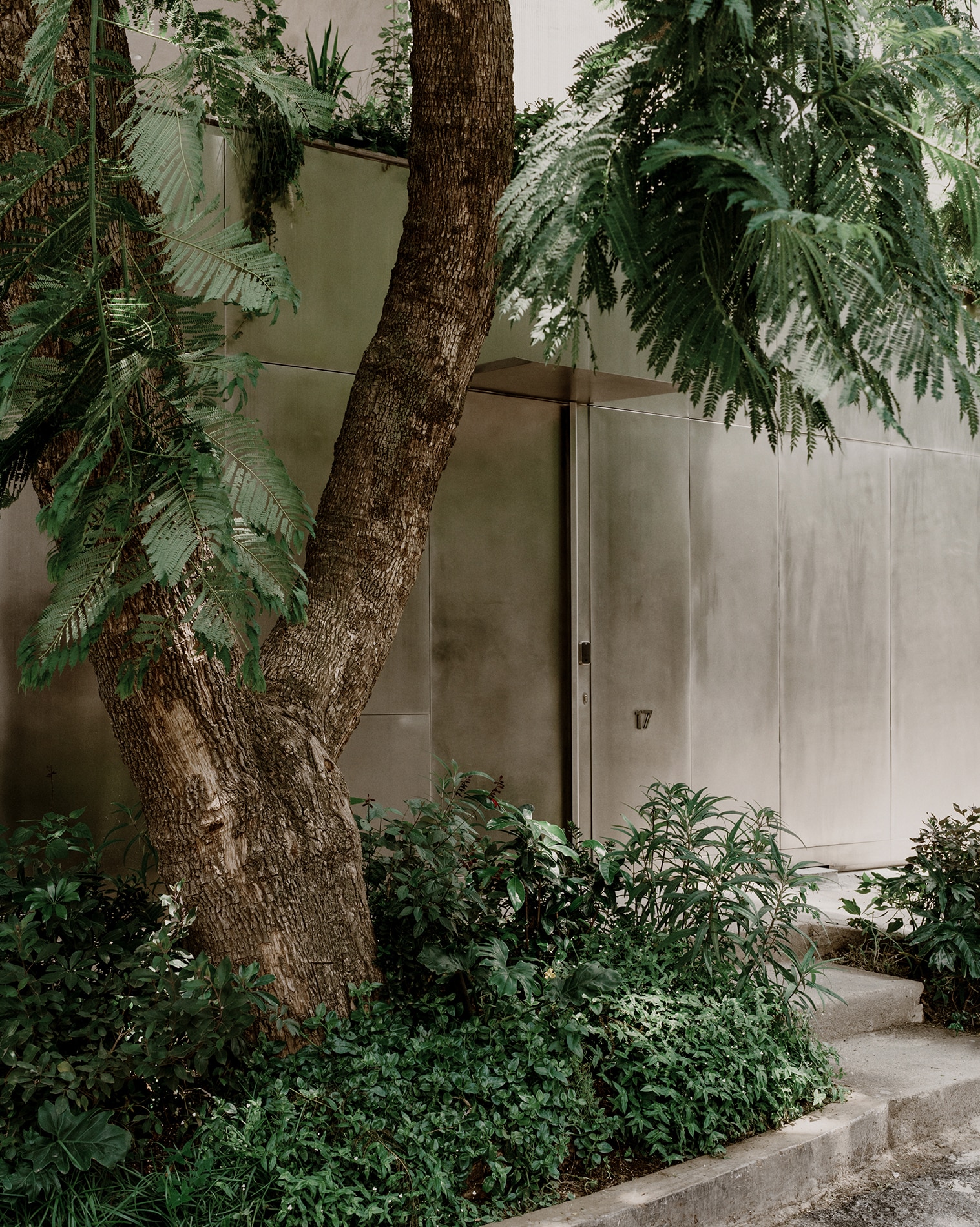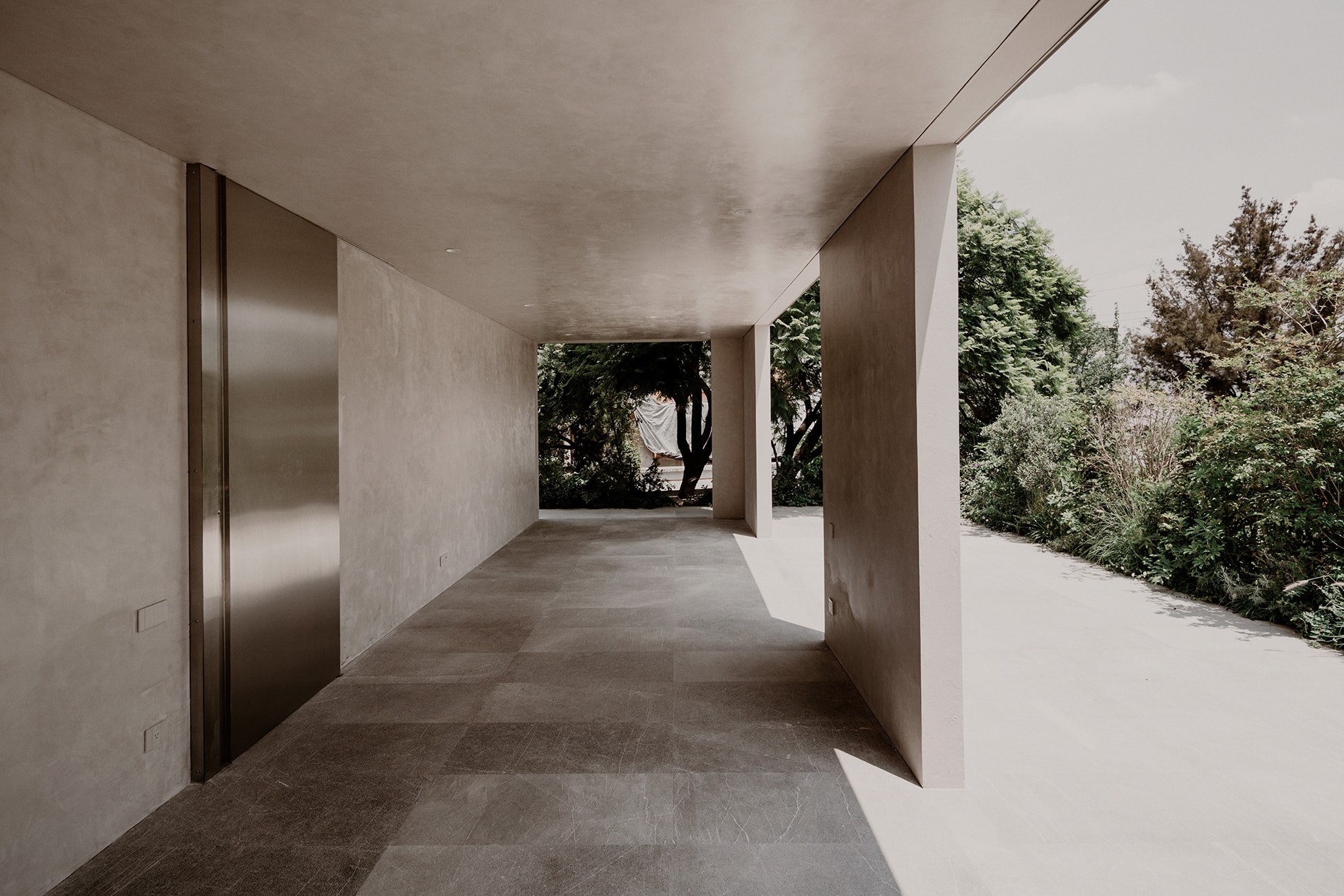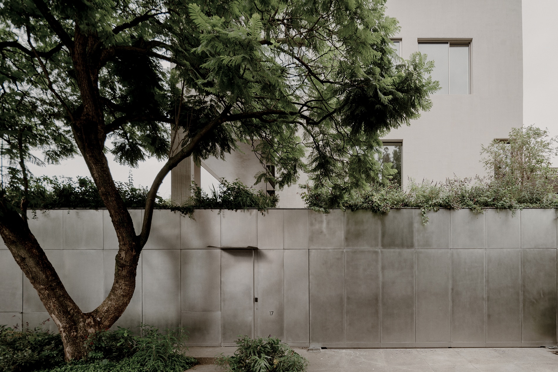 La estrategia se enfatiza a través del uso de un material reflejante en este basamento, cuya intención es amplificar visualmente el verde circundante mediante reflejos, reduciendo la presencia formal de la arquitectura en planta baja. Este material permite ocultar el acceso principal y el garage, y al mismo tiempo genera la ilusión de que los niveles superiores flotan sobre un plano vegetal continuo, casi inmaterial.