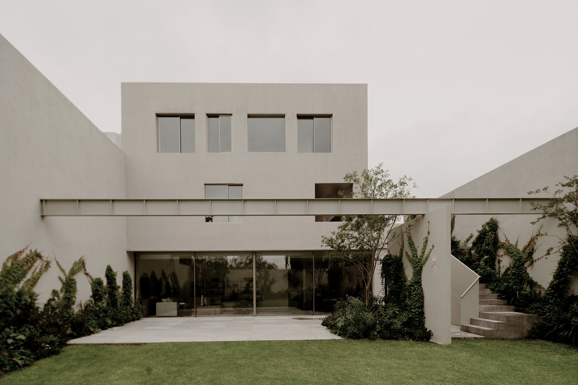 En contraste con la ligereza y apertura del basamento, el volumen superior —que alberga el segundo y tercer nivel— se presenta como una pieza sólida, contenida y claramente definida. Este volumen, de materialidad opaca y mate, tiene aperturas puntuales y controladas, reforzando la noción de privacidad. En él se concentran las áreas más íntimas de la casa, como recámaras y estudios.