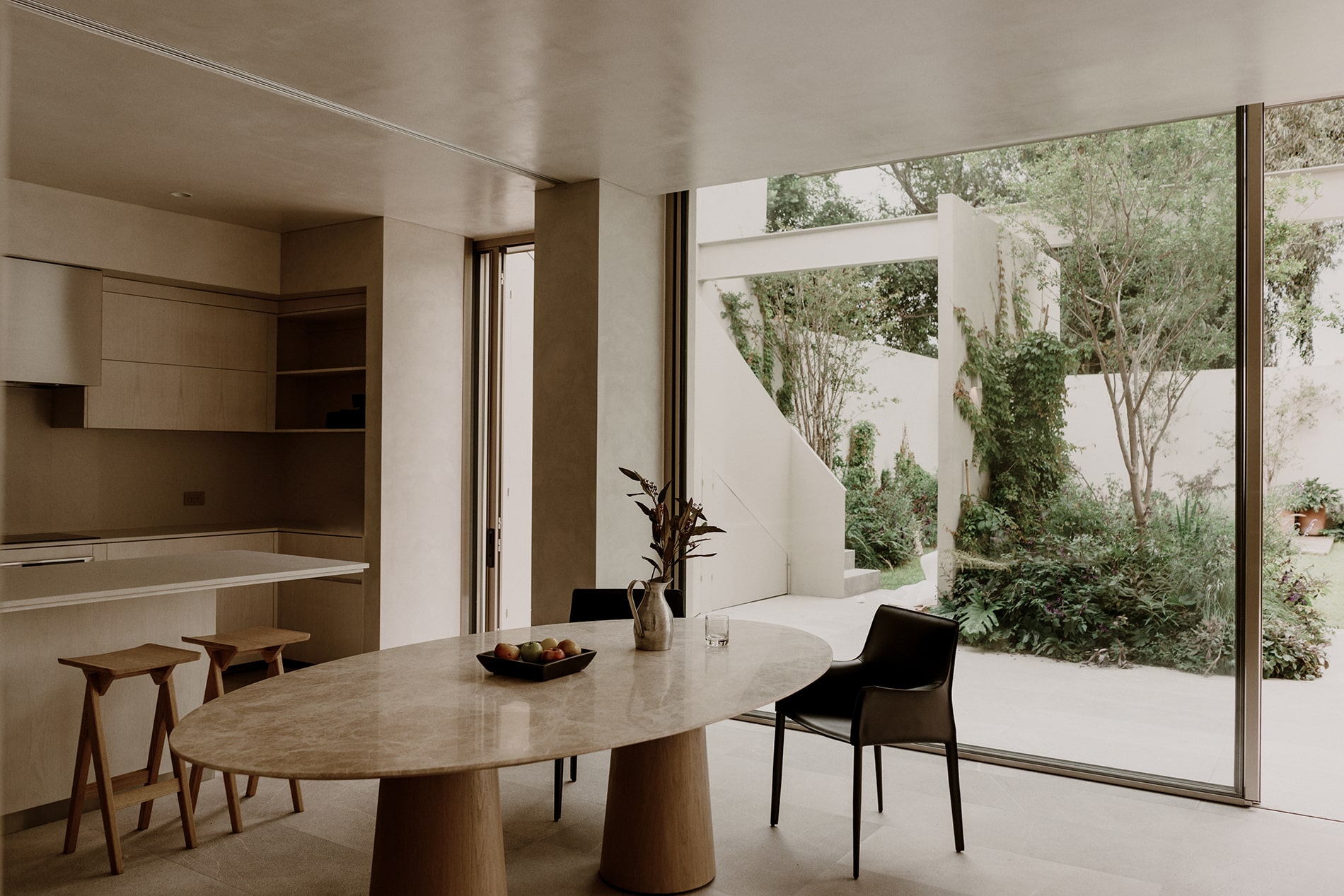 En los interiores, el proyecto mantiene una coherencia material que refuerza la lectura de los distintos ámbitos. En los espacios públicos, se utiliza una pasta natural en muros y un piso de mármol abujardado que se extiende del interior al exterior, fortaleciendo la continuidad espacial. En las áreas privadas, los pisos de madera aportan una atmósfera más cálida e íntima, acompañando las aperturas controladas de las ventanas.