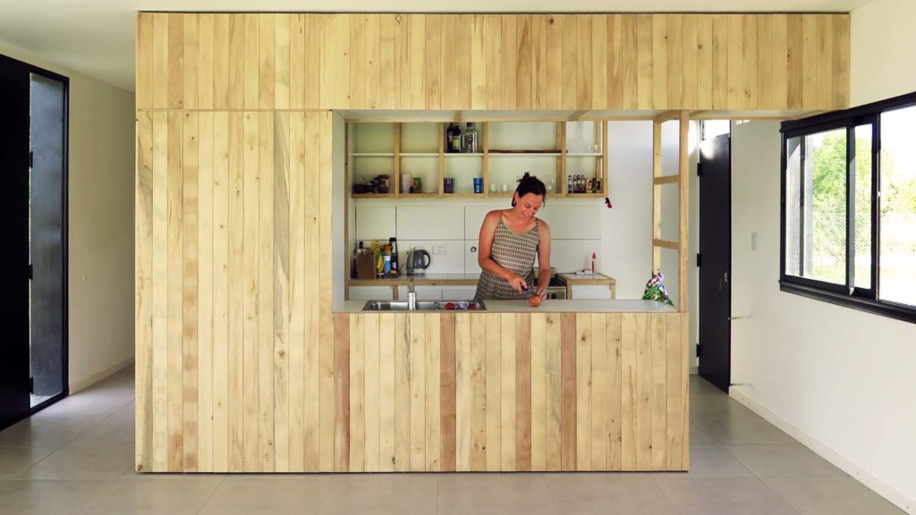 La economía en la utilización de una volumetría simple es acompañada por detalles de fácil ejecución y una búsqueda en reducir los elementos que componen la paleta de materiales. En el interior un revestimiento de tablas de álamo, madera local, accesible y económica le da unidad al frente de la cocina/hall/circulación, a la vez que la calidez propia que otorga la madera. El revestimiento de chapa acanalada negra resuelve en su totalidad la terminación exterior con mantenimiento mínimo, y reforzando la síntesis volumétrica y material de la casa.