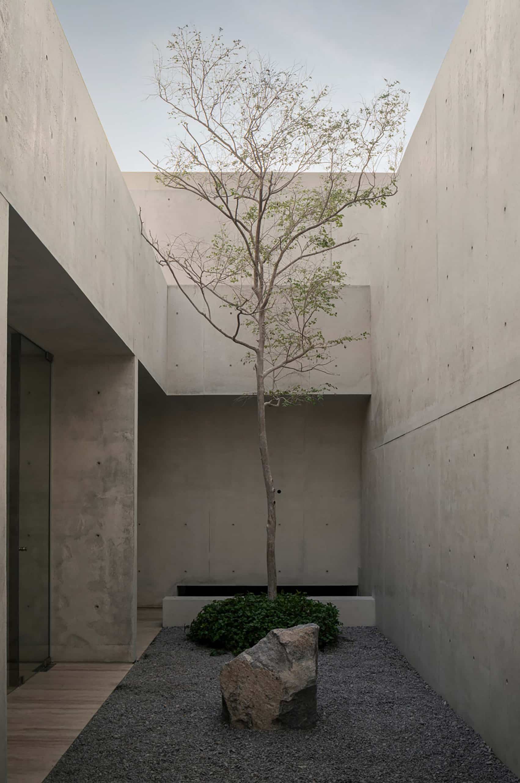 Las habitaciones se organizan en torno a un patio, buscando silencio y aire. Aquí, la intimidad se expresa a través del encierro, no como clausura, sino como mundo interior. Un muro curvo recibe al visitante con suavidad, marcando un umbral acogedor, mientras un árbol te da la bienvenida como si se tratara de un arreglo floral. La casa no mira hacia el vecindario: se voltea, como quien busca el recogimiento. Pero no se encierra: se abre hacia el cielo, la sombra, la plaza. Todo está dispuesto para que el habitar ocurra en una forma más lenta, más plena, más abierta a lo invisible.