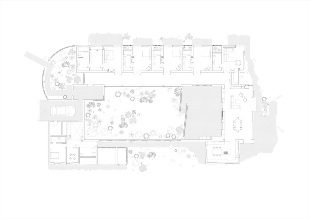 Con el fin de atender tanto la necesidad de resguardo como el deseo de apertura, la casa se dispone en torno a cuatro patios. El primero, de forma curva, funciona como espacio de transición entre el exterior y la casa; el segundo, de mayor tamaño y en la posición central de la casa, marca la transición desde las zonas más privadas hasta las más públicas; el tercero, en un nivel más bajo, es un espacio velado que conduce hacia las terrazas en la azotea; y el cuarto conforma una especie de casa en sí misma para la zona de servicio.