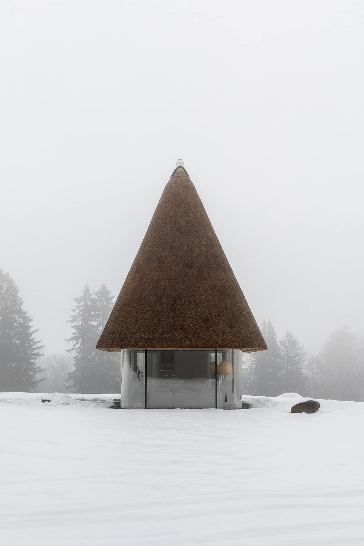 Durante el día, las fachadas completamente acristaladas se diluyen visualmente, generando la sensación de que la cubierta masiva de paja flota sobre el paisaje. El acristalamiento continuo intensifica la experiencia de inmersión en la naturaleza, permitiendo que el paisaje se integre como parte esencial de la vivencia emocional. Cuando se requiere privacidad, es posible cerrar cortinas densas pero visualmente ligeras, operadas de manera automática mediante un panel de control ubicado junto a la cama.