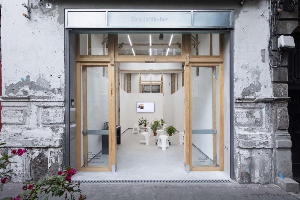 El diseño arquitectónico de APRDELESP para el nuevo espacio de la galería en un local comercial de 59 m2 en la colonia Juárez de la Ciudad de México contempla: mantener los acabados de los muros interiores; un nuevo piso de concreto gris equipado con instalaciones eléctricas, pluviales, hidráulicas y sanitarias; una nueva estructura de madera de pino perimetral, remetida de los muros existentes y modulada a partir de las dimensiones de la hoja de Tablaroca, que funciona como sistema de exhibición, soporte para iluminación, bodega, oficina, baño y accesos; un nuevo antepecho de acero galvanizado en la fachada; una adaptación a la cortina de acero tropicalizado existente; diez buganvilias de distintos colores en las jardineras exteriores existentes; una llave de nariz; un sistema de seguridad y dos portapapeles de acero galvanizado diseñados en colaboración con Fabien Cappello.