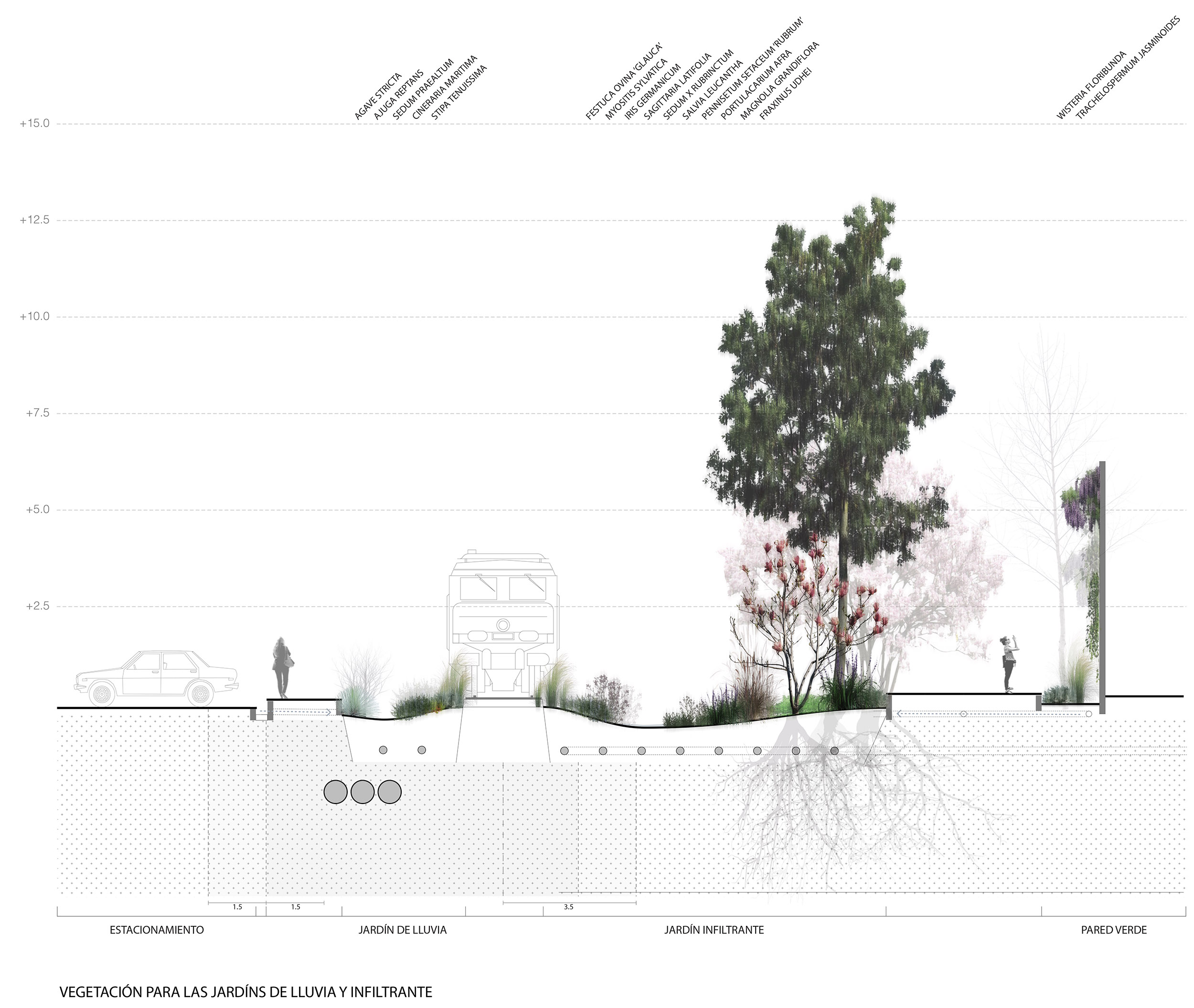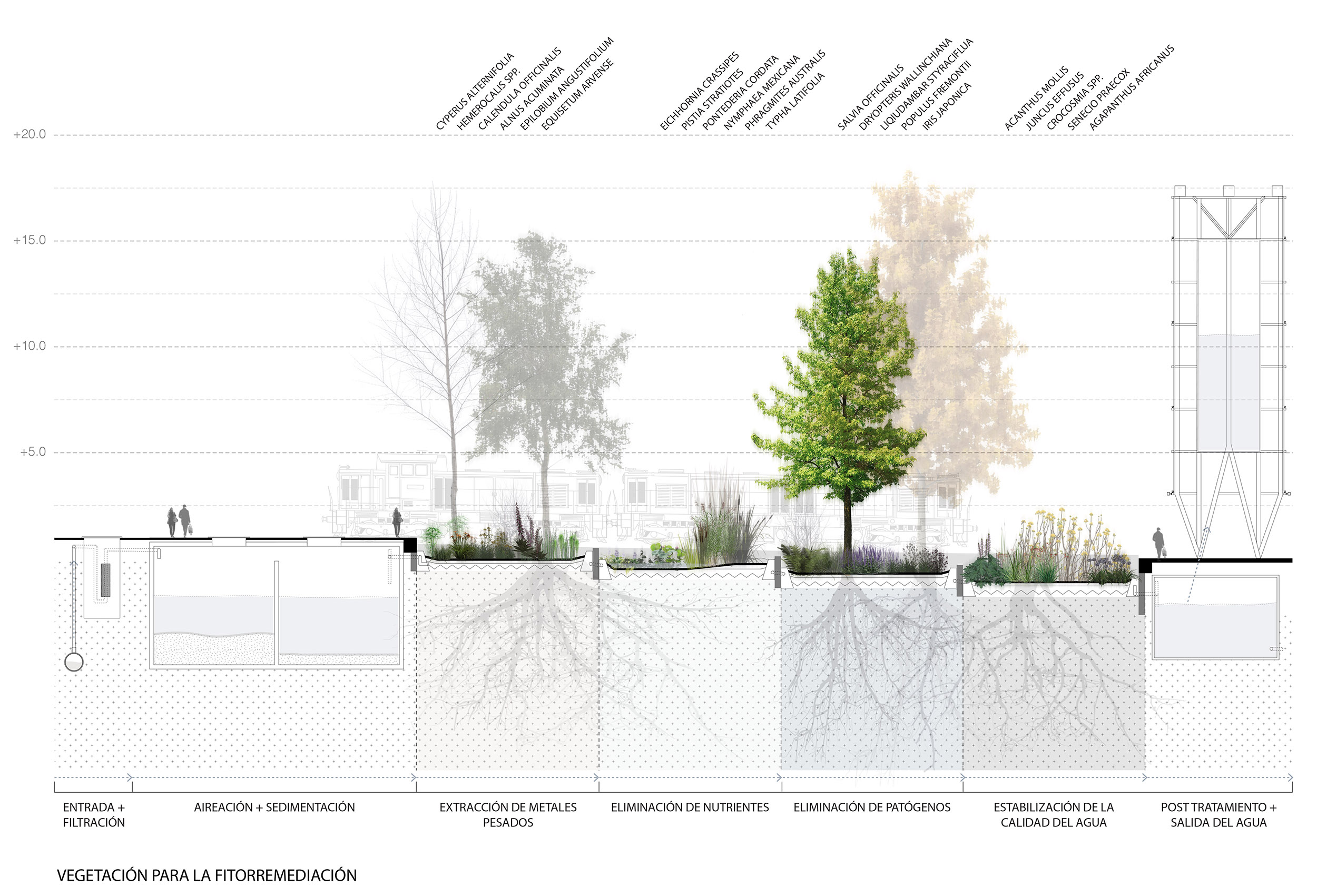 La propuesta busca, por otro lado, el rescate de parte del agua que la ciudad desperdicia, activando el uso de la vegetación del parque, lo que permite que la sección cambie de texturas y colores en función de las estaciones del año = cuatro parques lineales en uno.