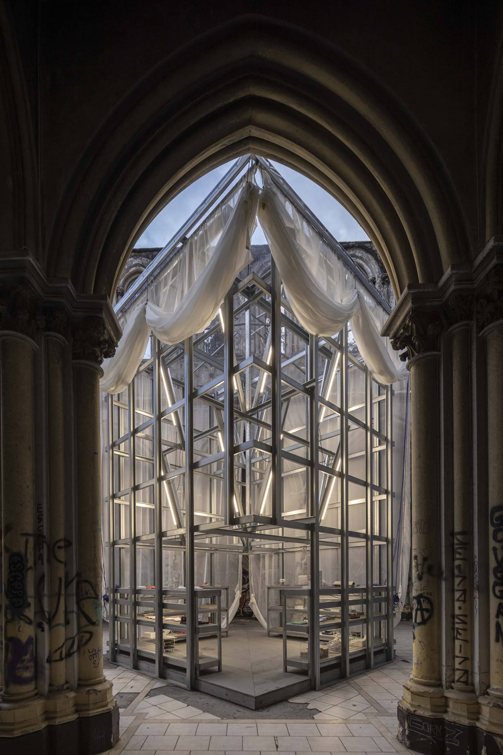 Los pabellones no alteran la estructura original del edificio, se superpone a ella con precisión y autonomía, evitando intervenir los muros o bóvedas existentes. El visitante entra a la iglesia desde una barra que la cruza transversalmente –retomando el antiguo transepto. Al interior, el recorrido se define por los vacíos dejados entre los pabellones, entendiendo la intervención como una operación de activación y lectura más que de transformación. La museografía y la iluminación se integran al sistema arquitectónico, generando un recorrido claro, contenido y contemporáneo dentro de una estructura preexistente.