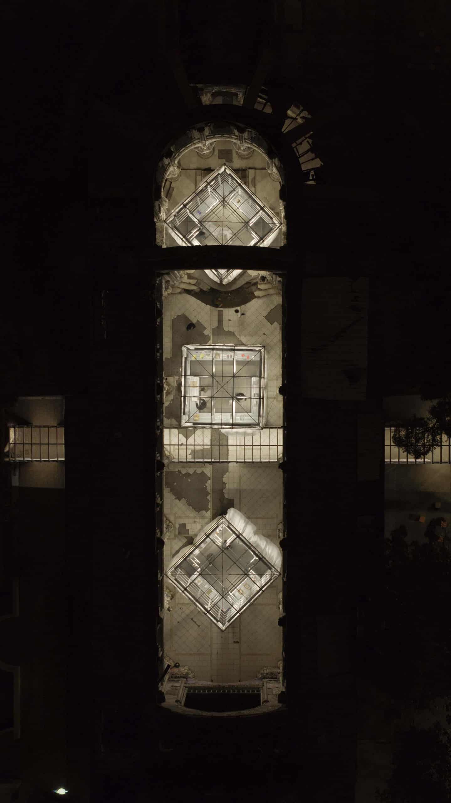 El segundo gesto, tres torres alineadas en el eje de la nave, busca reconocer la estructura original sin ocuparla directamente, proponiendo una forma alternativa de habitar el espacio mediante los tótems curatoriales.