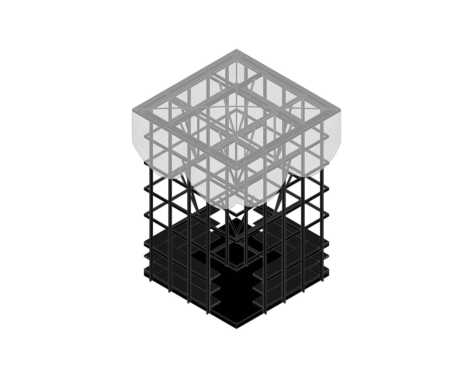 Las tres torres, alineadas a lo largo del eje central, se asocian a cada uno de los tres ejes curatoriales de la Bienal: (re)programar, (re)adaptar y (re)construir. Construidos también con perfiles de volcometal, se complementan con una cubierta plástica translúcida y una tela que cae a modo de telón, la cual puede subir y bajar y se mueve suavemente con el viento, introduciendo una dimensión viva y cambiante dentro del espacio.