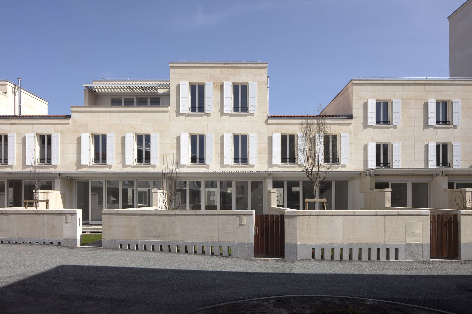 Las fachadas y bardas de todos los edificios están realizadas con piedra maciza portante de 28 cm de espesor. La producción de este material natural no requiere cocción ni mezclas, consume muy poca energía. Se obtiene mediante el simple corte de piedra natural. Los bloques se cortan en cantera siguiendo un plano de modulación diseñado por el arquitecto y posteriormente se apilan en obra. En este caso, la construcción en piedra es comparable a un sistema prefabricado. El uso de equipos de elevación modernos, que permiten manipular grandes bloques, ha devuelto vigencia a esta técnica ancestral. La piedra caliza es un material natural presente en la región de Aquitania; sin embargo, las canteras históricas han cerrado debido a la expansión urbana.