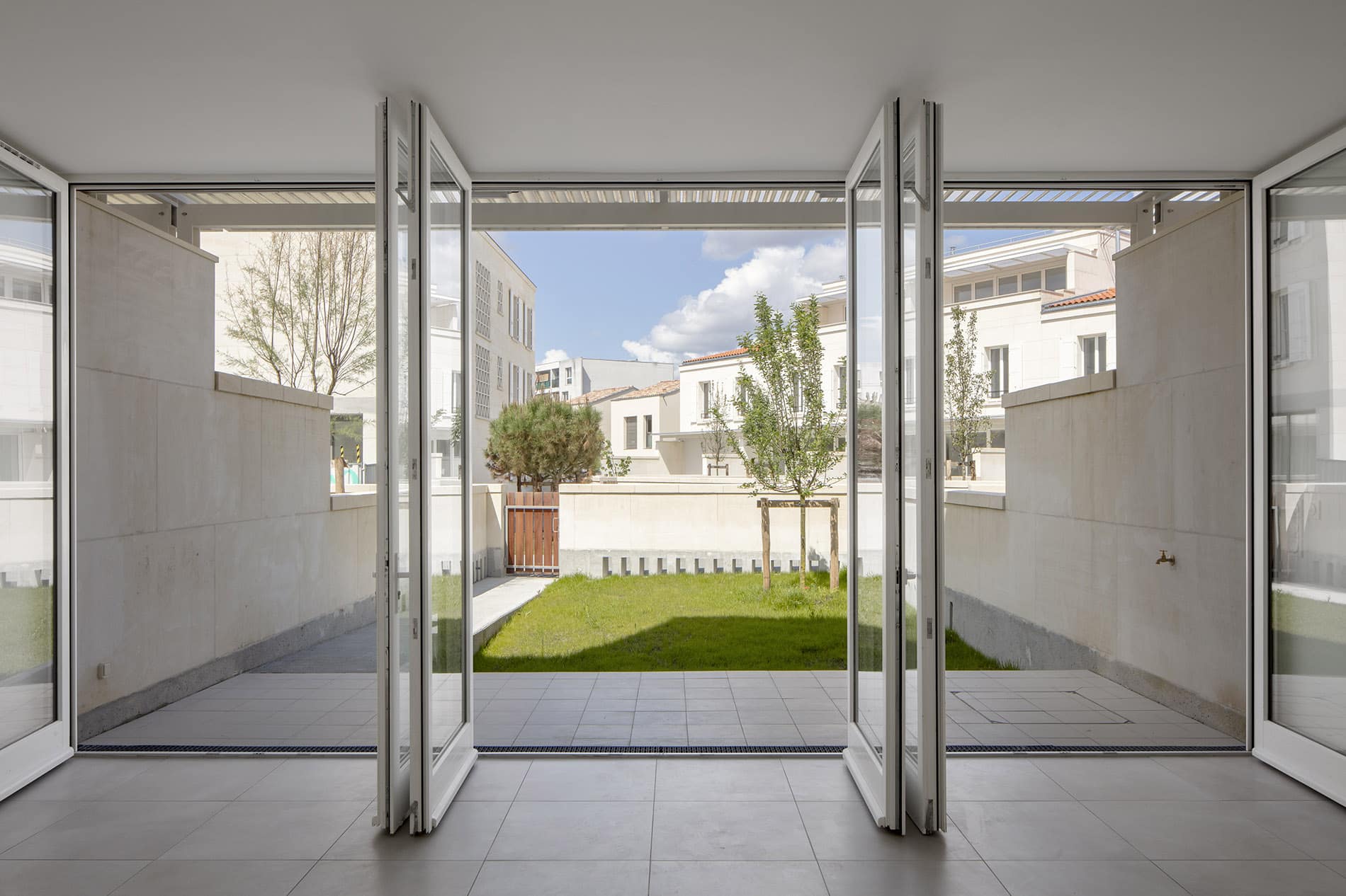 Las siete viviendas denominadas “asequibles” se construyen sobre una crujía estrecha de 3.60 m. Ofrecen las mismas cualidades espaciales y constructivas que las demás casas, pero se agrupan de forma más compacta en parcelas más pequeñas. Esta configuración permite producir auténticas casas individuales a un costo muy competitivo. Estas viviendas de 80 m² se venden por 230,000 euros, con un IVA del 5.5%.