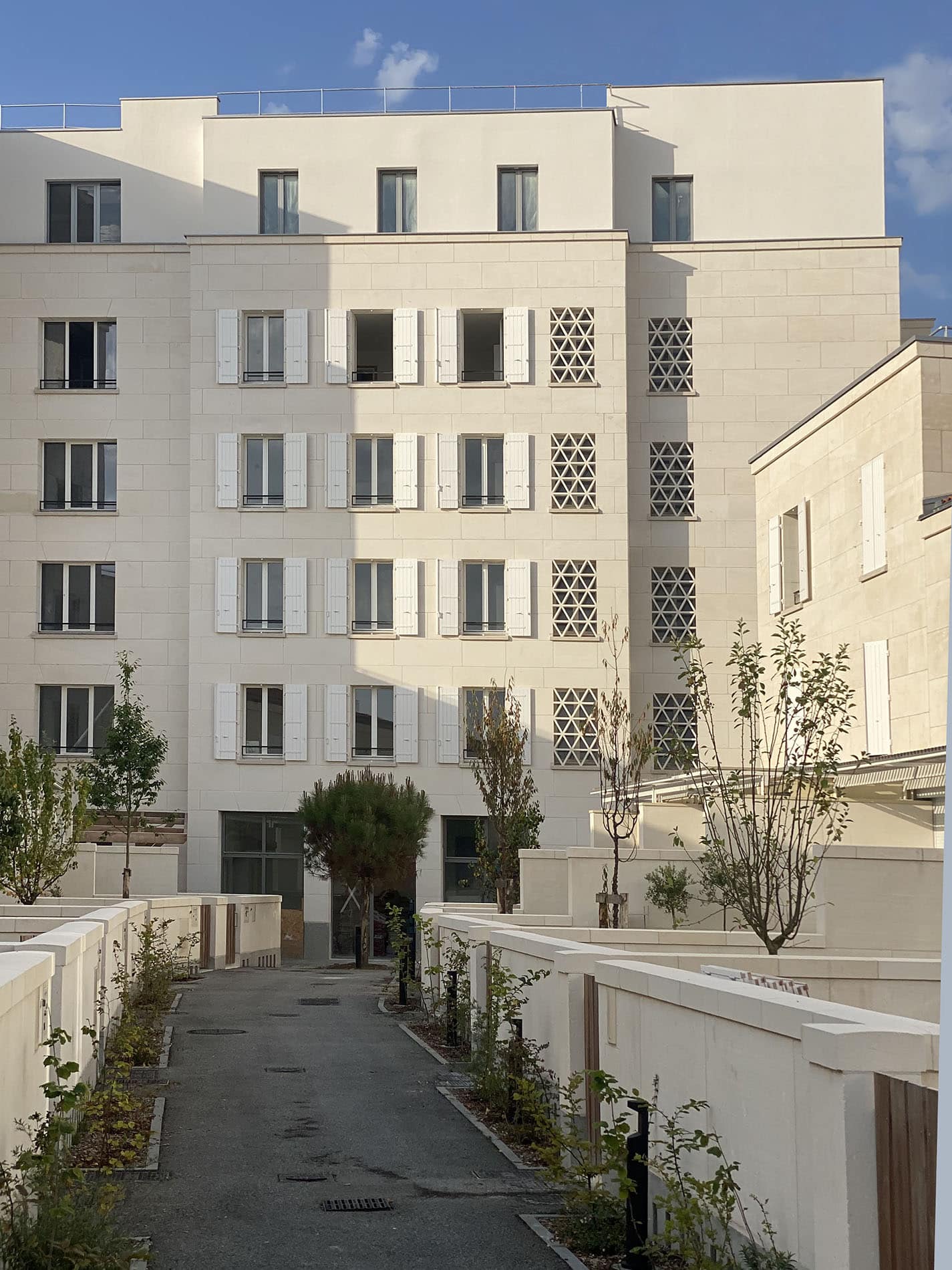 Varios edificios colectivos completan el desarrollo y ofrecen pequeñas unidades habitacionales, en su mayoría departamentos con superficies generosas, orientados hacia el parque al sur. La combinación de casas adosadas con edificios de departamentos permite alcanzar un coeficiente de ocupación del suelo aproximado de 1.2, considerablemente superior al de los barrios tradicionales de échoppes.