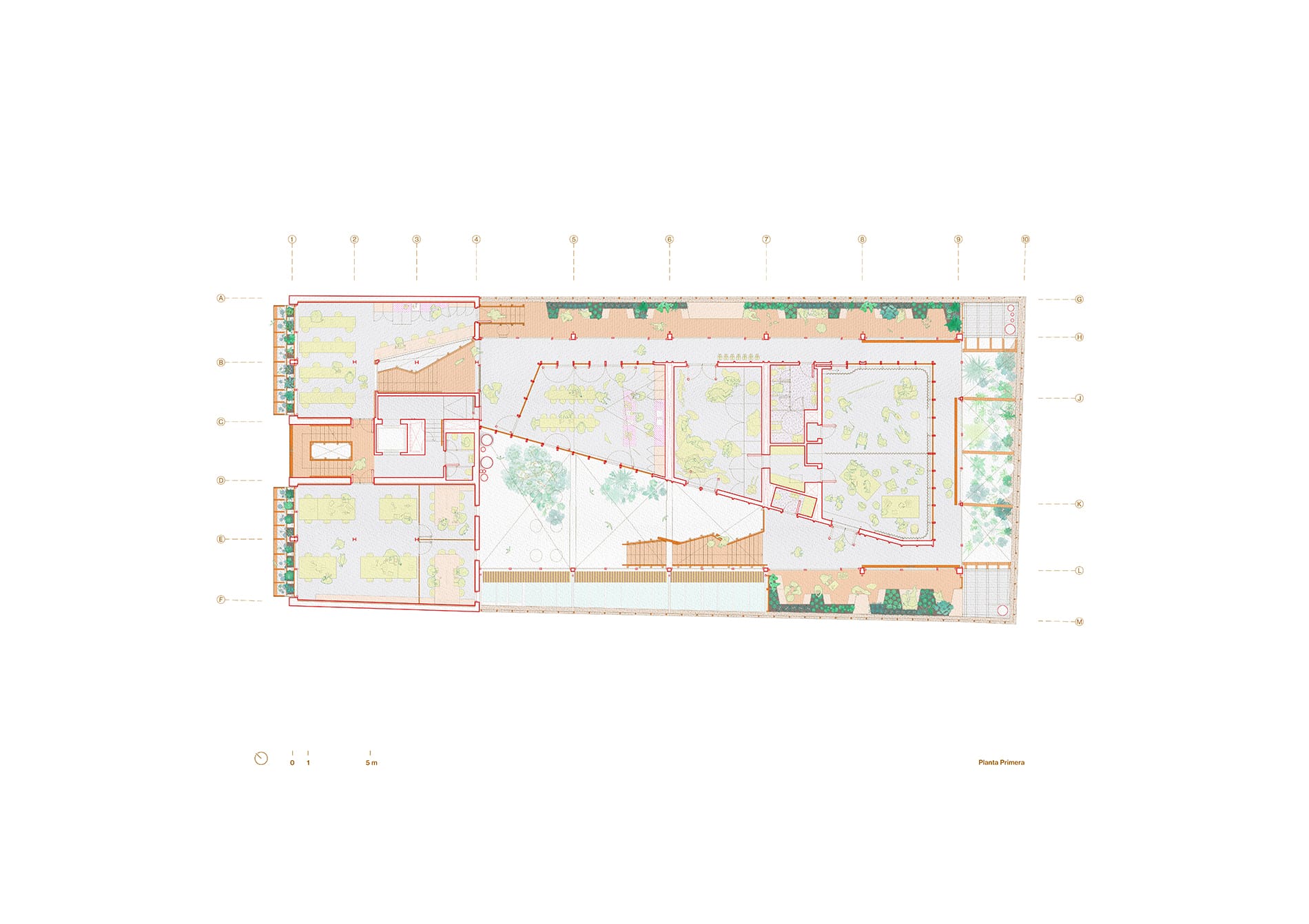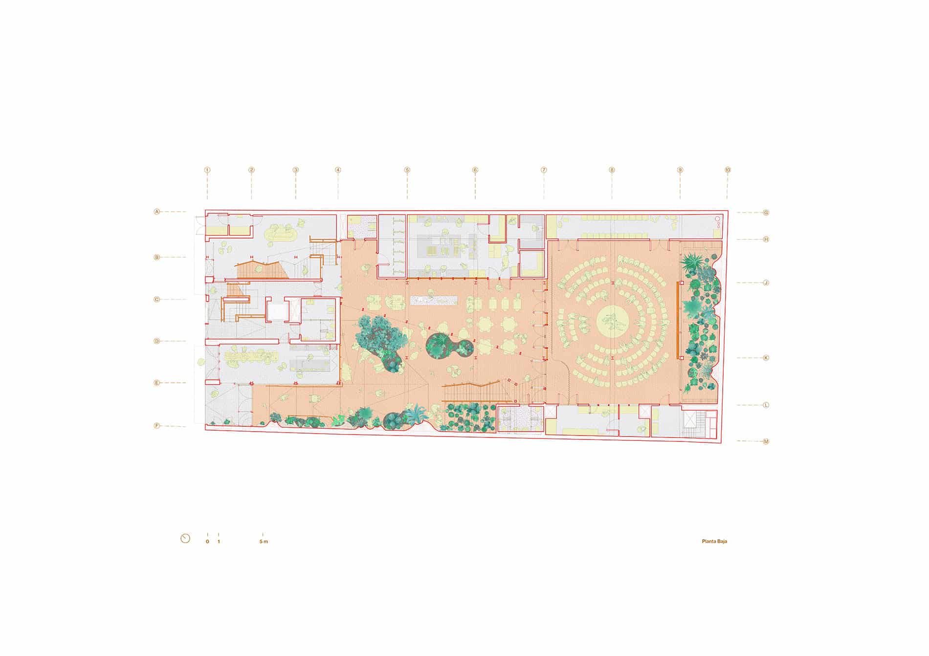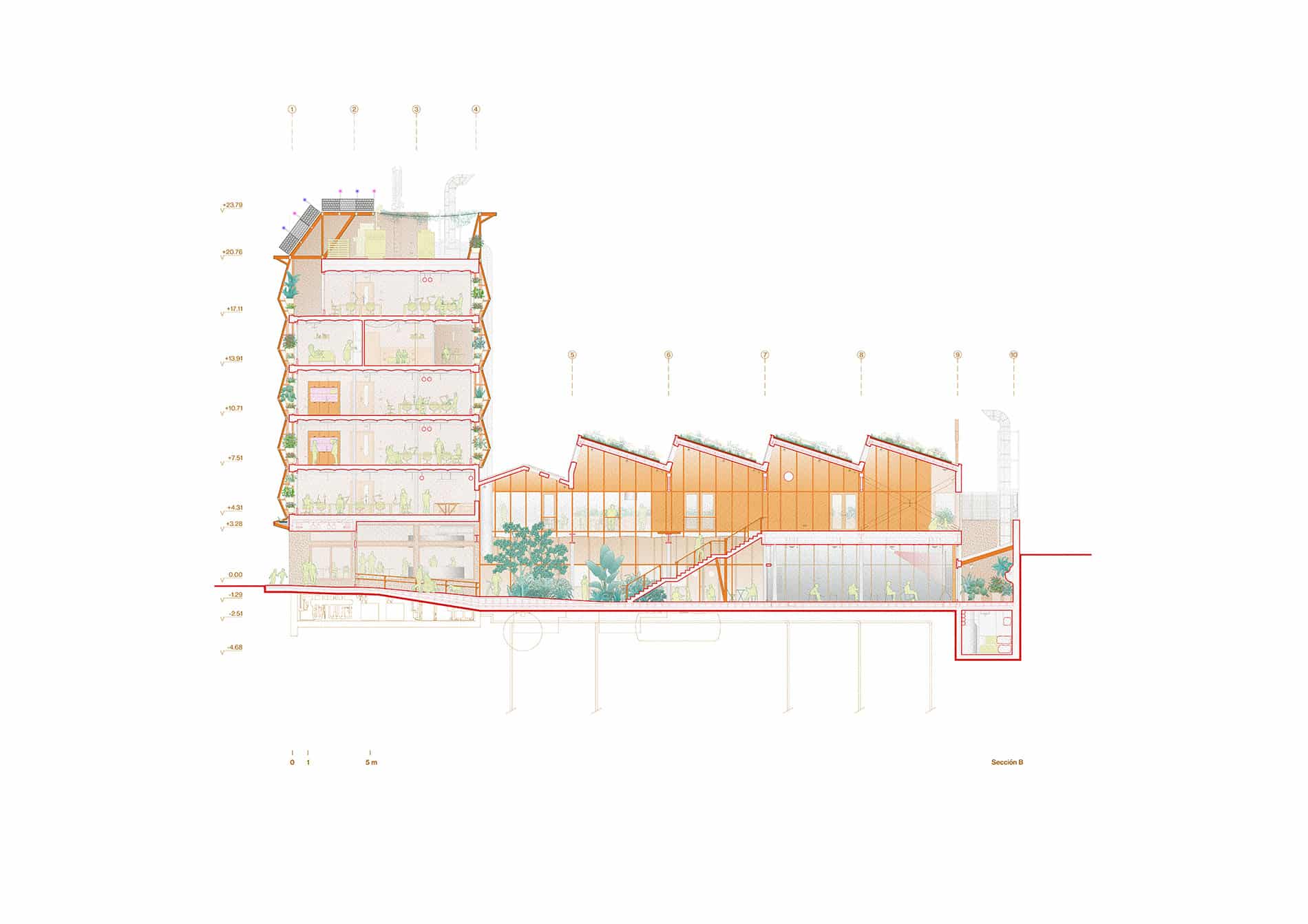 Consta de un programa híbrido que abarca oficinas, espacios de usos múltiples, restaurante, cocina plató, laboratorio culinario, espacio residencial, salas de ensayos, jardines y huertos. Cuenta con casi un 40% de superficie de uso colectivo, interior-exterior, accesible al barrio.