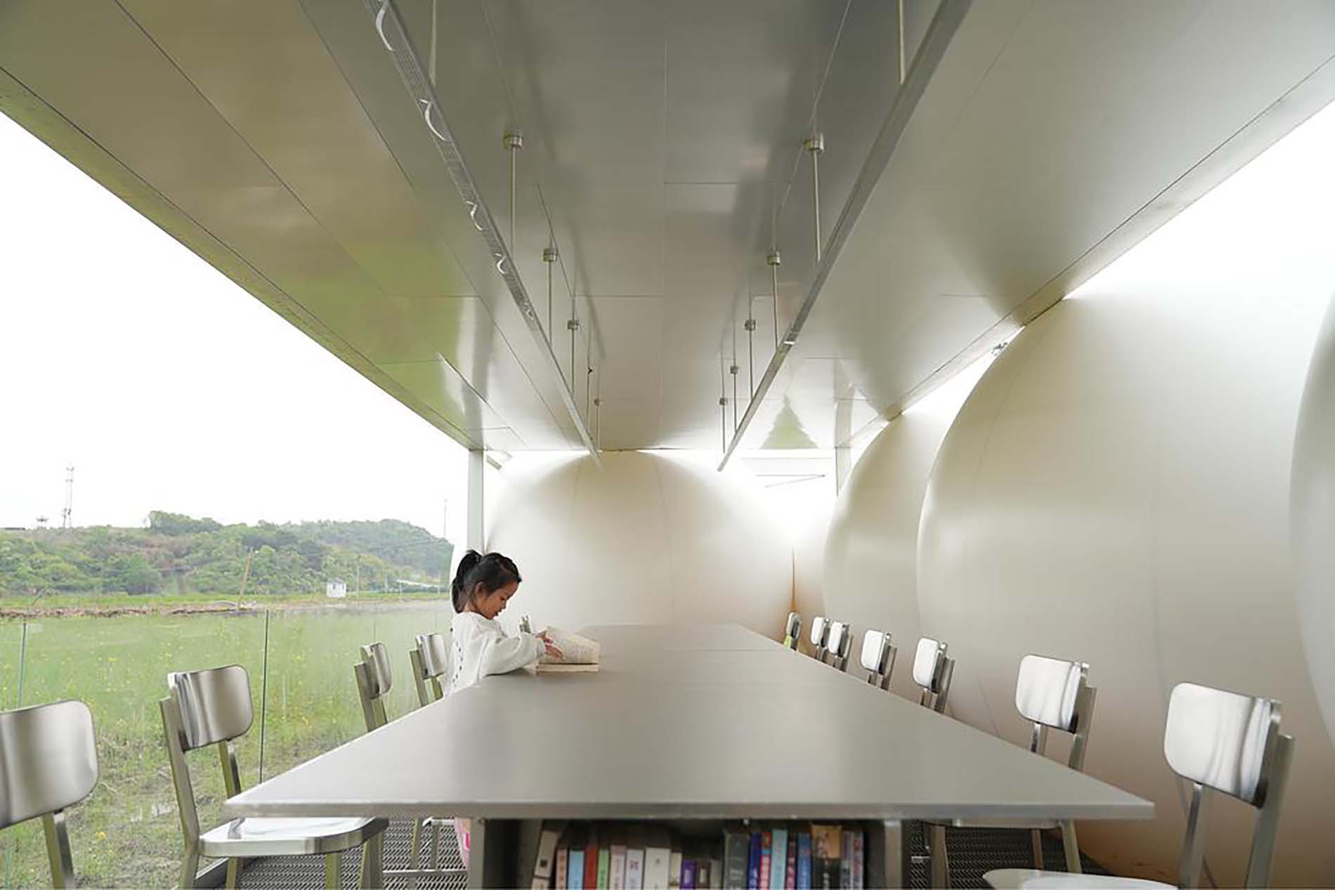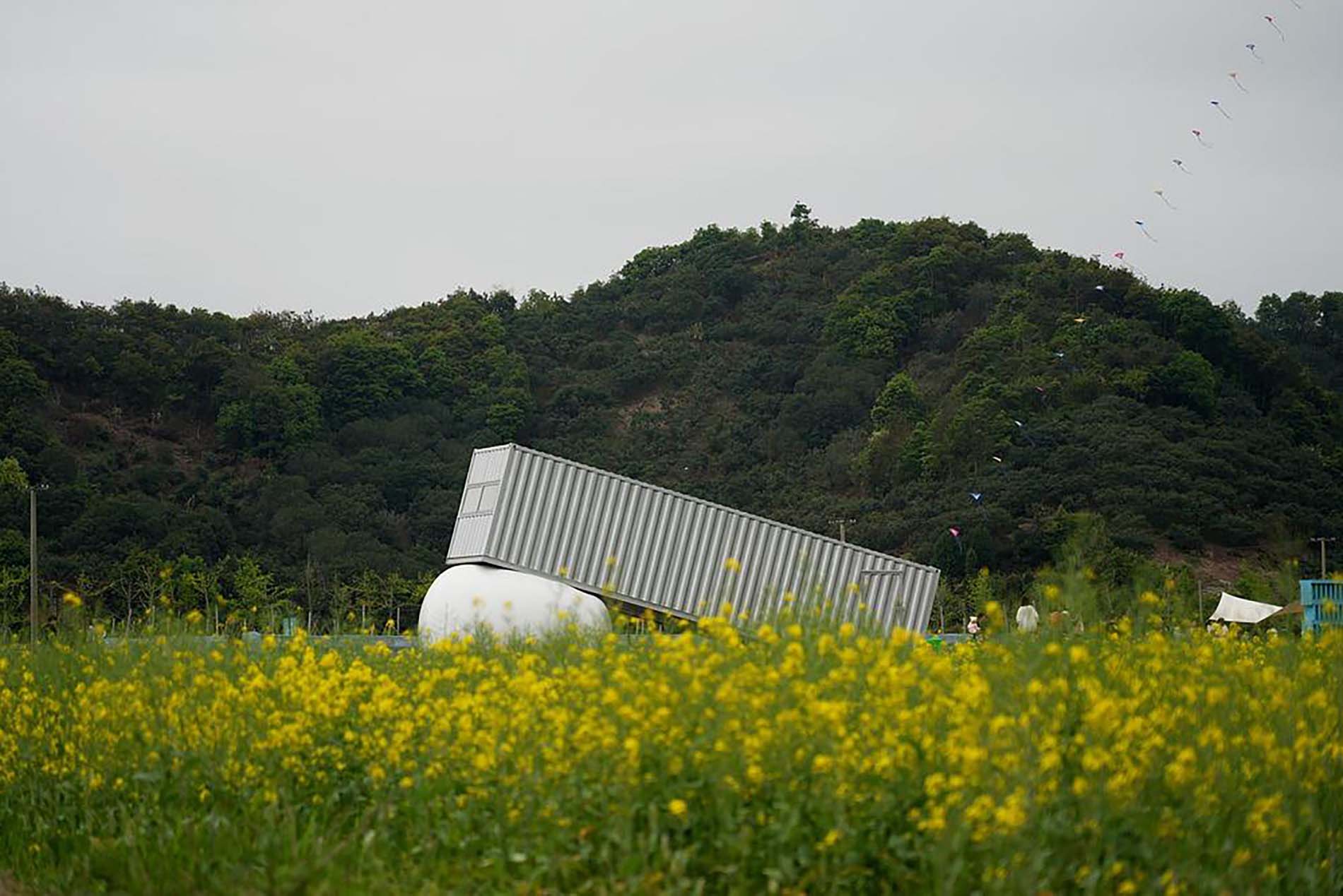 Al pie de las colinas, una antigua edificación técnica se transforma en un espacio de lectura elevado sobre los campos. Aquí, el estudio ensaya una tercera relación entre contenedores e inflables: siete esferas blancas suspendidas dentro de una estructura metálica conforman un “muro” circular sin puertas. El acceso ocurre al separar físicamente los cuerpos inflables, provocando una experiencia táctil inesperada que cuestiona la solidez tradicional de la arquitectura.