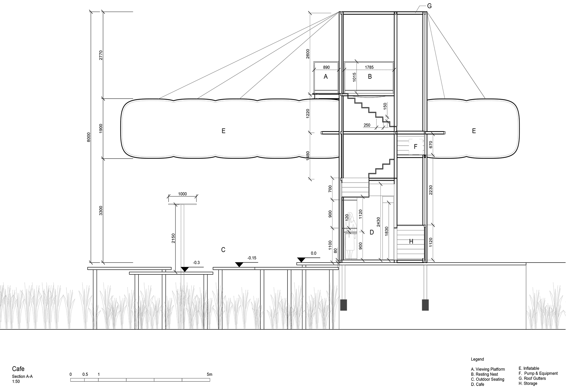 Ubicado en el acceso principal a los campos, donde antes existía una construcción en desuso, el Cloud Café funciona como un nuevo hito territorial. La “nube” inflable no solo posee una fuerte carga icónica y pública, sino que genera un amplio espacio cubierto en voladizo que protege del sol y la lluvia sin interferir con la actividad agrícola.