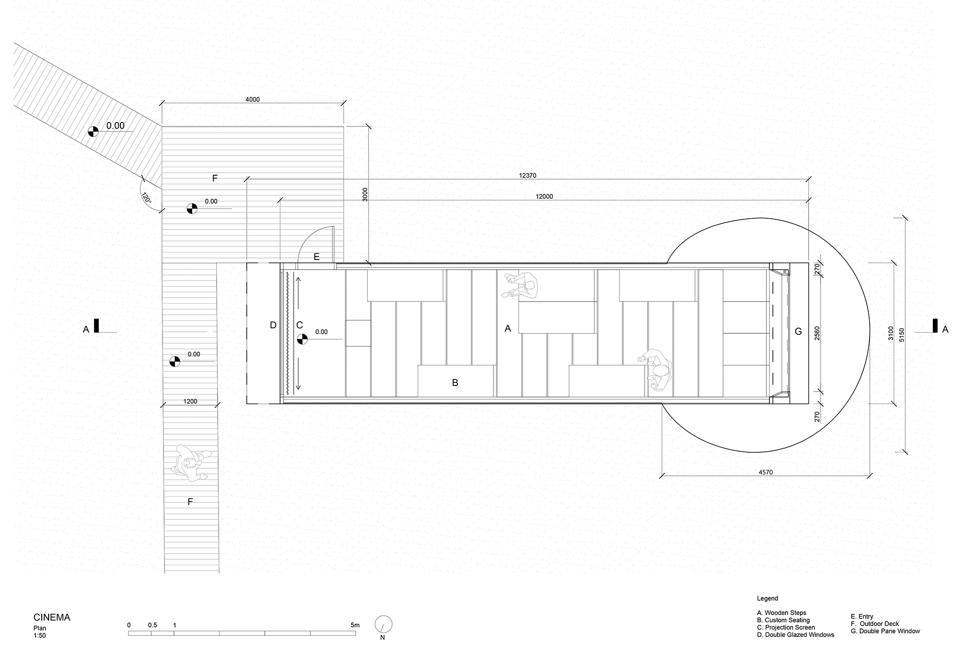 Con poco más de 30 m², el espacio está completamente equipado para proyecciones. Paneles de lana de madera aportan acondicionamiento acústico, mientras que respaldos curvos diseñados ergonómicamente permiten al cuerpo recostarse, en sintonía con el espíritu relajado del proyecto.