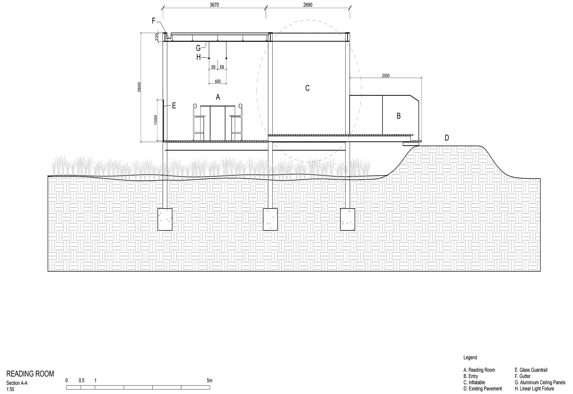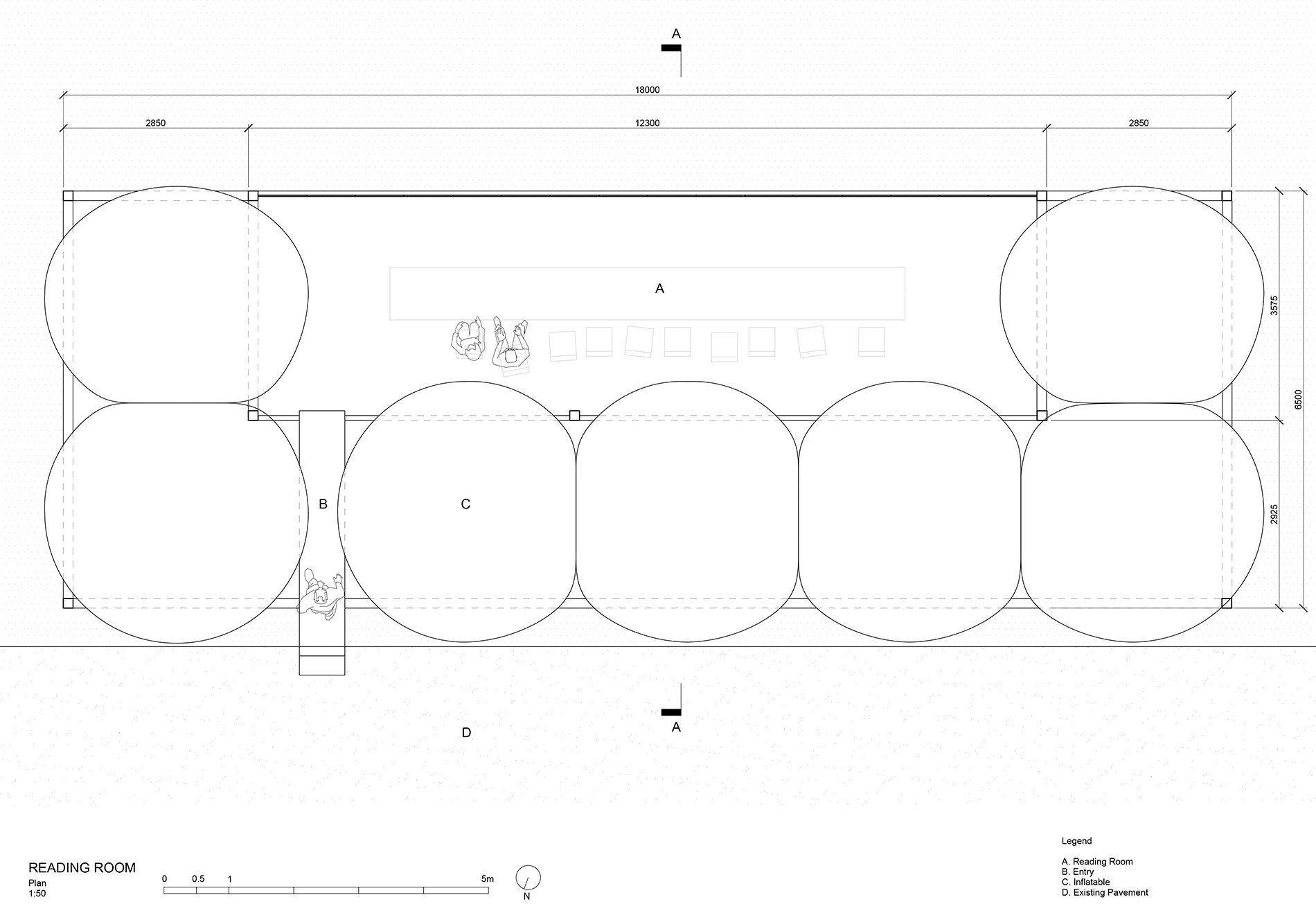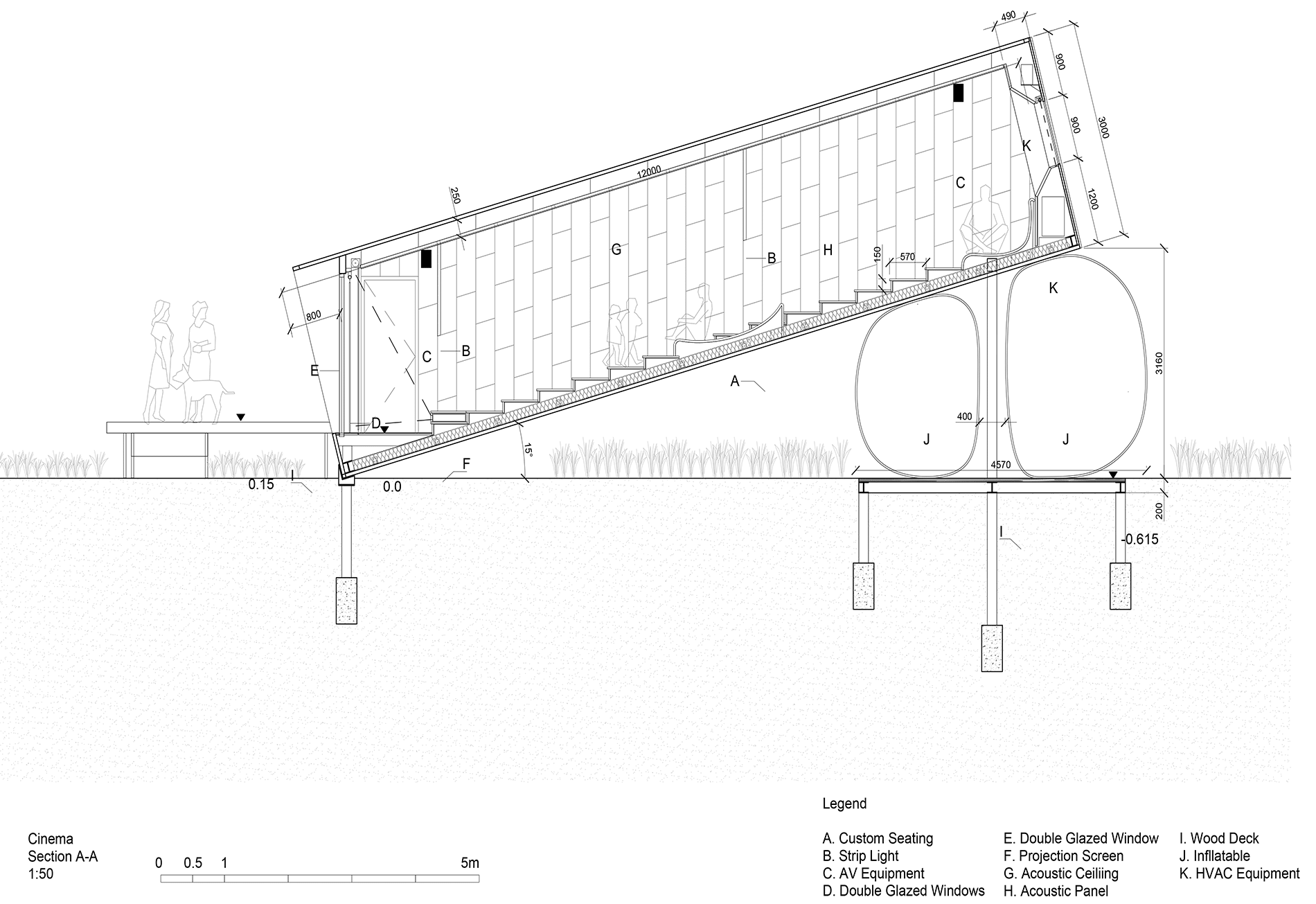 La segunda intervención reutiliza una estructura publicitaria existente para crear un pequeño cine climatizado. Para minimizar el impacto sobre el terreno, el contenedor se inclina 15 grados y se apoya únicamente en dos puntos, generando una gradería interior escalonada. Los soportes estructurales quedan envueltos en anillos inflables que ocultan instalaciones técnicas y producen una imagen inesperada: un volumen pesado parece descansar con naturalidad sobre formas suaves y ligeras.
