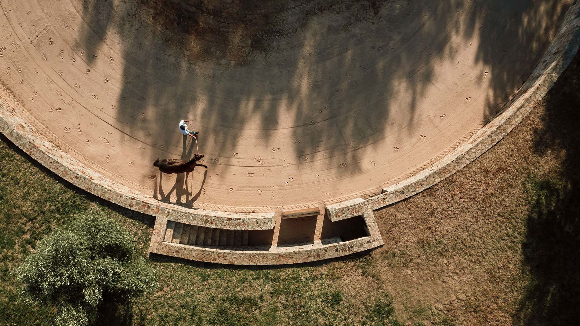 se resolvió mediante una pendiente suave que prolonga la topografía de la pradera, logrando que el conjunto se funda visualmente con el entorno. El acceso a la plaza se da a través de una escalera que desciende siguiendo la curvatura del ruedo. Este recorrido atraviesa un túnel diseñado para proteger dos antiguos mezquites, y desemboca en un patio semi-enterrado a su sombra, con una pequeña fuente que brinda frescura y pausa.