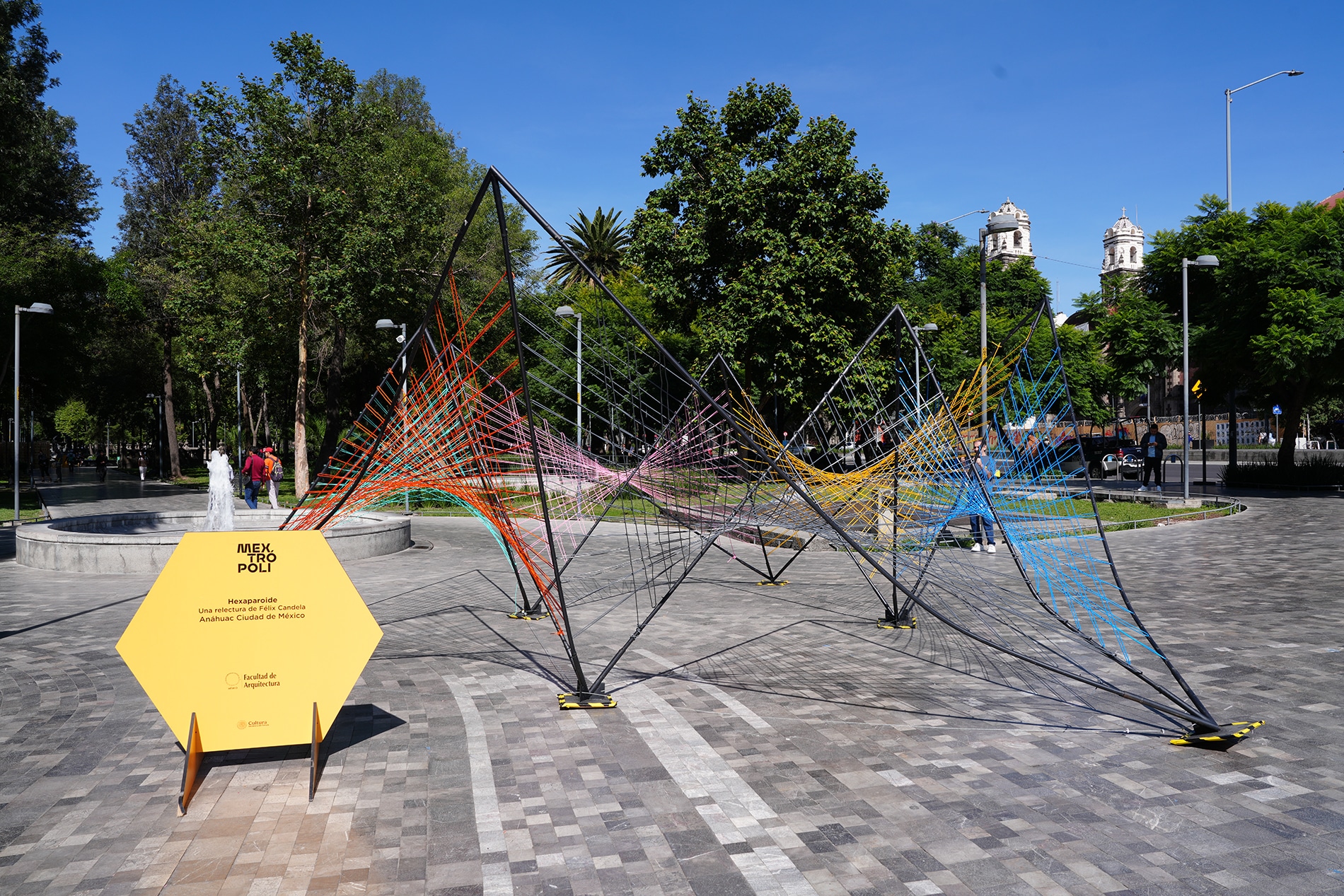 El pabellón diseñado por estudiantes de la Universidad Anáhuac partió de la lógica de las superficies regladas —como los hiperparaboloides empleados por Félix Candela— para reinterpretarlas a una escala humana, lúdica y accesible. La estructura estuvo conformada por marcos y tubos metálicos articulados mediante nodos de acero, lo que permitió un ensamble preciso y desmontable.