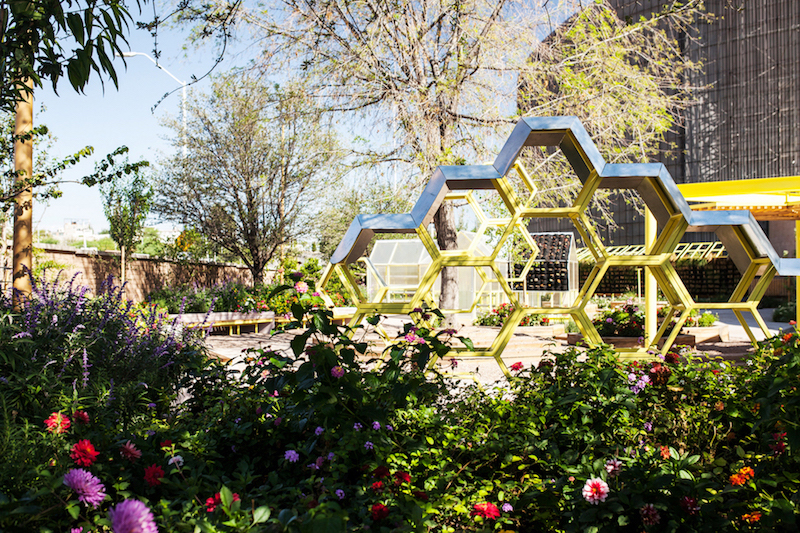 En este nuevo territorio experimental destaca la vegetación compuesta por árboles frutales, flores, aromáticas y pastos dispuestos en masas entre 5 árboles preexistentes. Ademas se considera la colección de plantas de alimentos que se producirán en las camas de cultivo biointensivo a lo largo del año. El programa se resuelve con elementos sucintos dispuestos en el lugar para promover el uso del espacio como un laboratorio de la agricultura urbana, lugar de encuentro, aprendizaje y de recorridos museográficos. Son objetos ligeros, hechos a base de madera de pino tratada con aceite de llinaza, acero en color amarillo, policarbonato y cristal. Ahora son dos pérgolas de diferente tamaño que crean el acceso y el foro multifuncional, canteros para el huerto de cultivo biointensivo, lugar para los deshidratadores y composteros, áreas de descanso, el invernadero y el hotel de insectos.