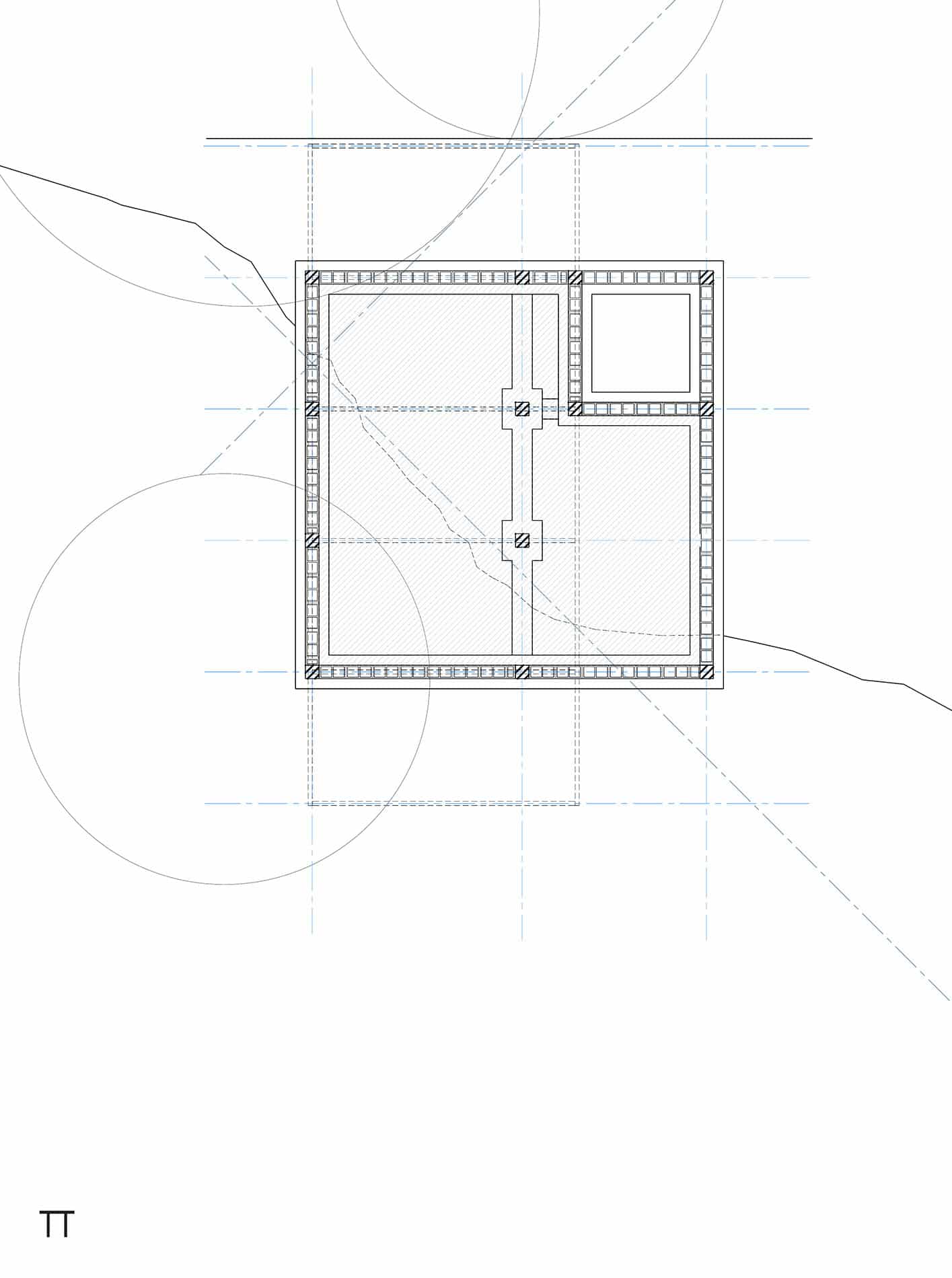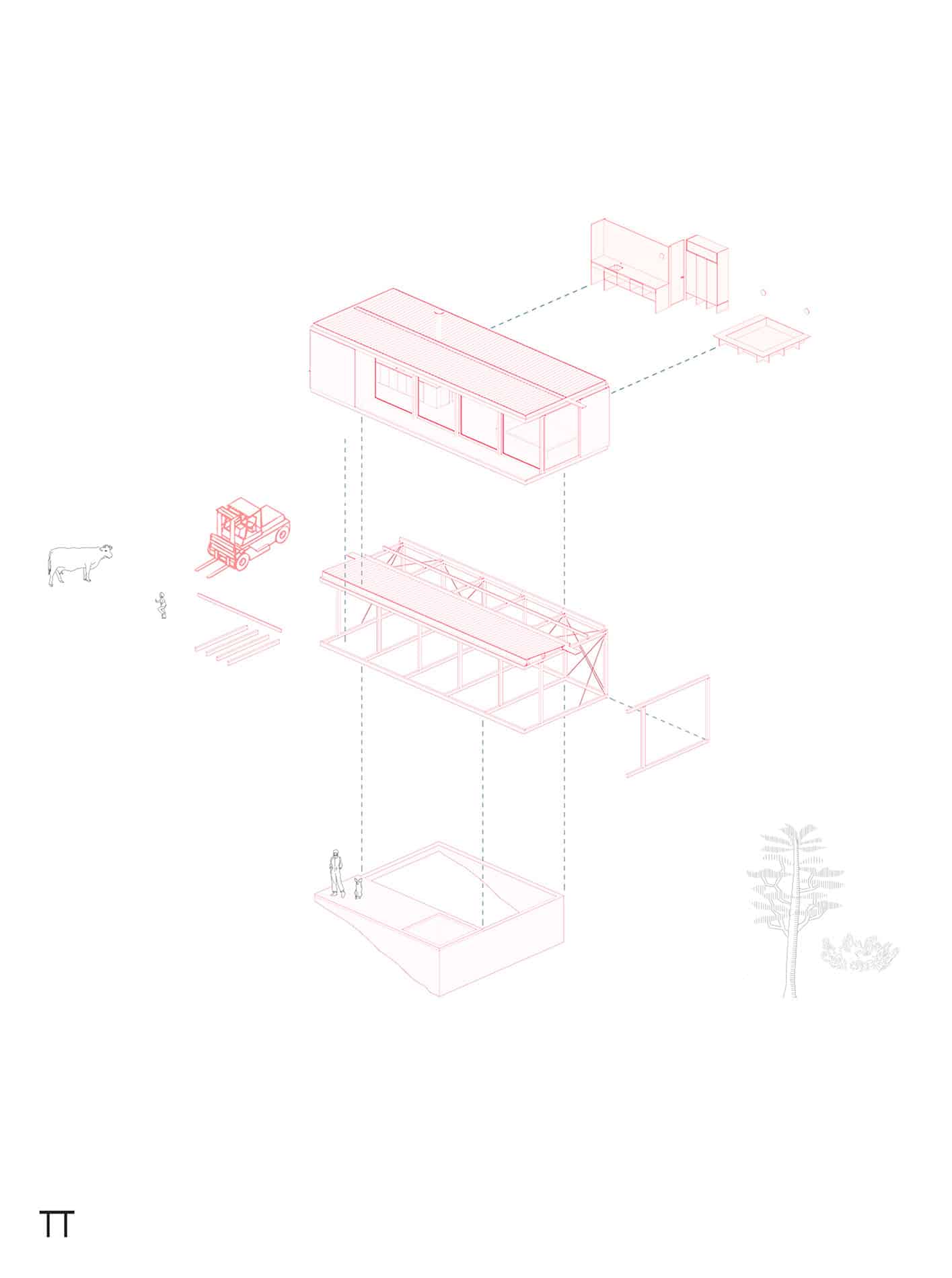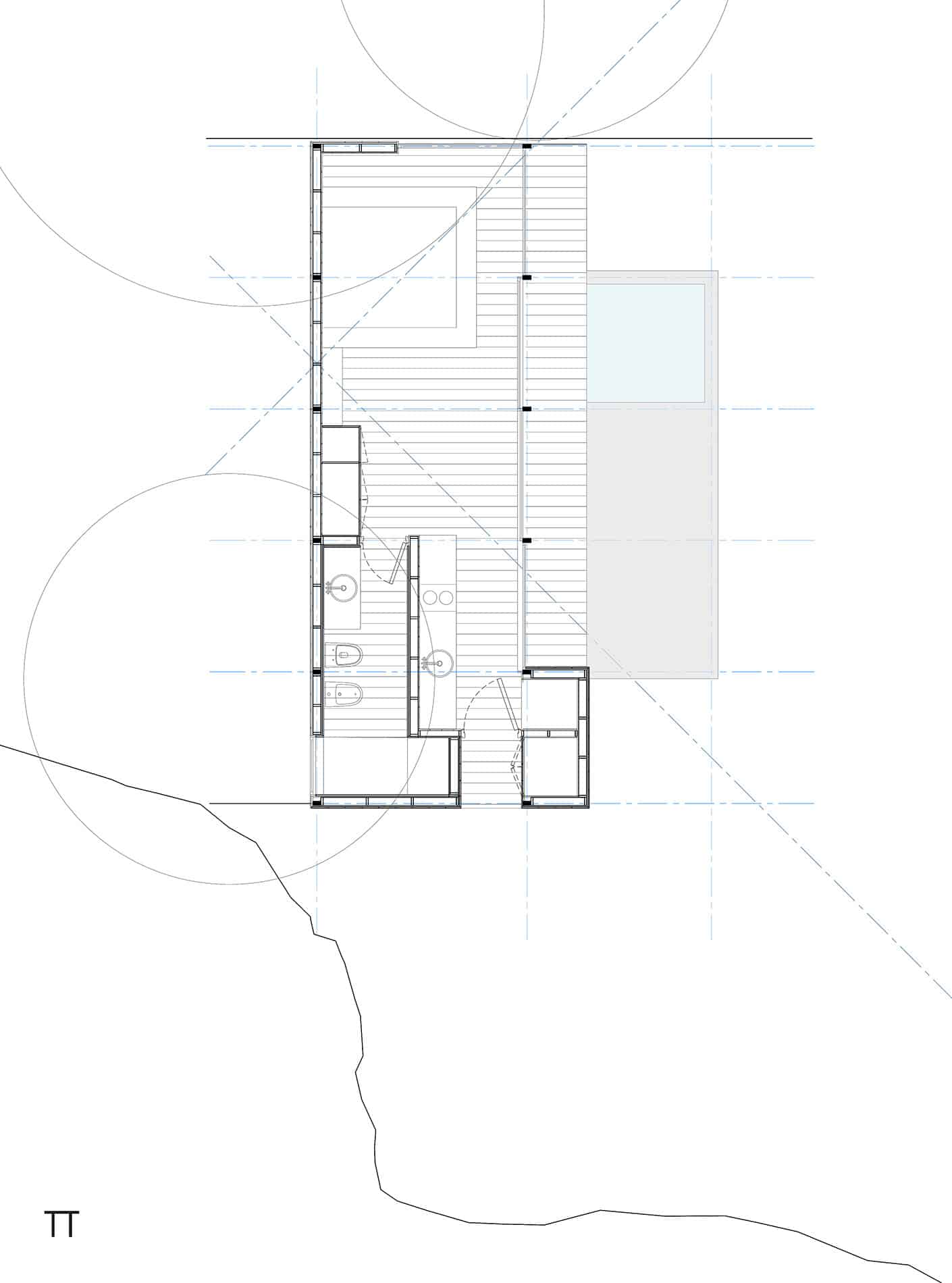 Dos pequeños bloques de madera descansan sobre un basamento construido con piedra del sitio, el cual resuelve el pronunciado desnivel del terreno y es la conexión entre la arquitectura y el suelo.