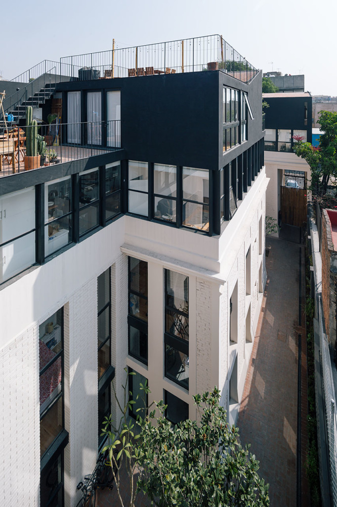 El proyecto se estructura a través de un corredor lateral; el patio de acceso existente en la casa original se replica en la parte posterior y proporciona los dos núcleos de accesos al edifico. La adición que se construye en la parte posterior de la casa, en sustitución de la zona de servicio, traza un segundo patio de acceso con la forma y la materialidad de la casona existente, pero utilizando tecnologías actuales: la adición es claramente identificable bajo la mirada de un profesional, pero ofrece una lectura continua a un ojo distraído. El proyecto también crece en altura, tanto dentro del edificio existente, como por la adición de dos plantas sobre la casona.
