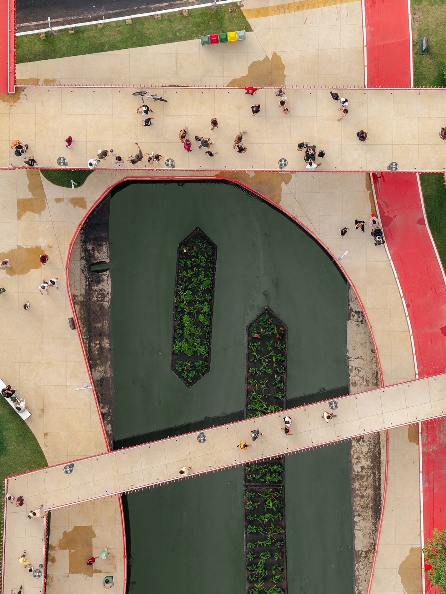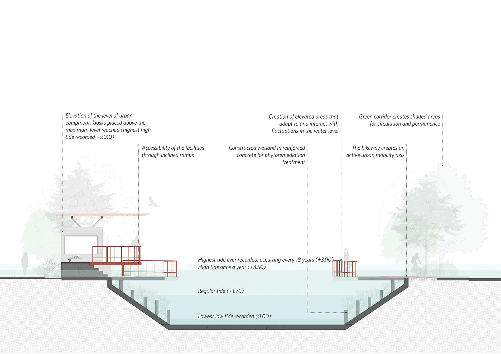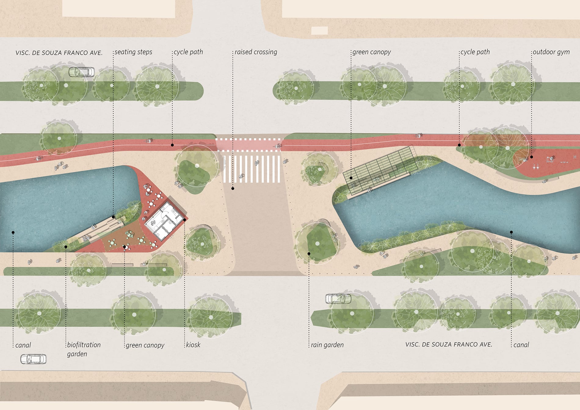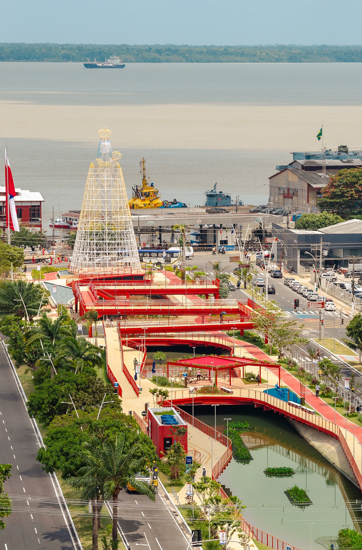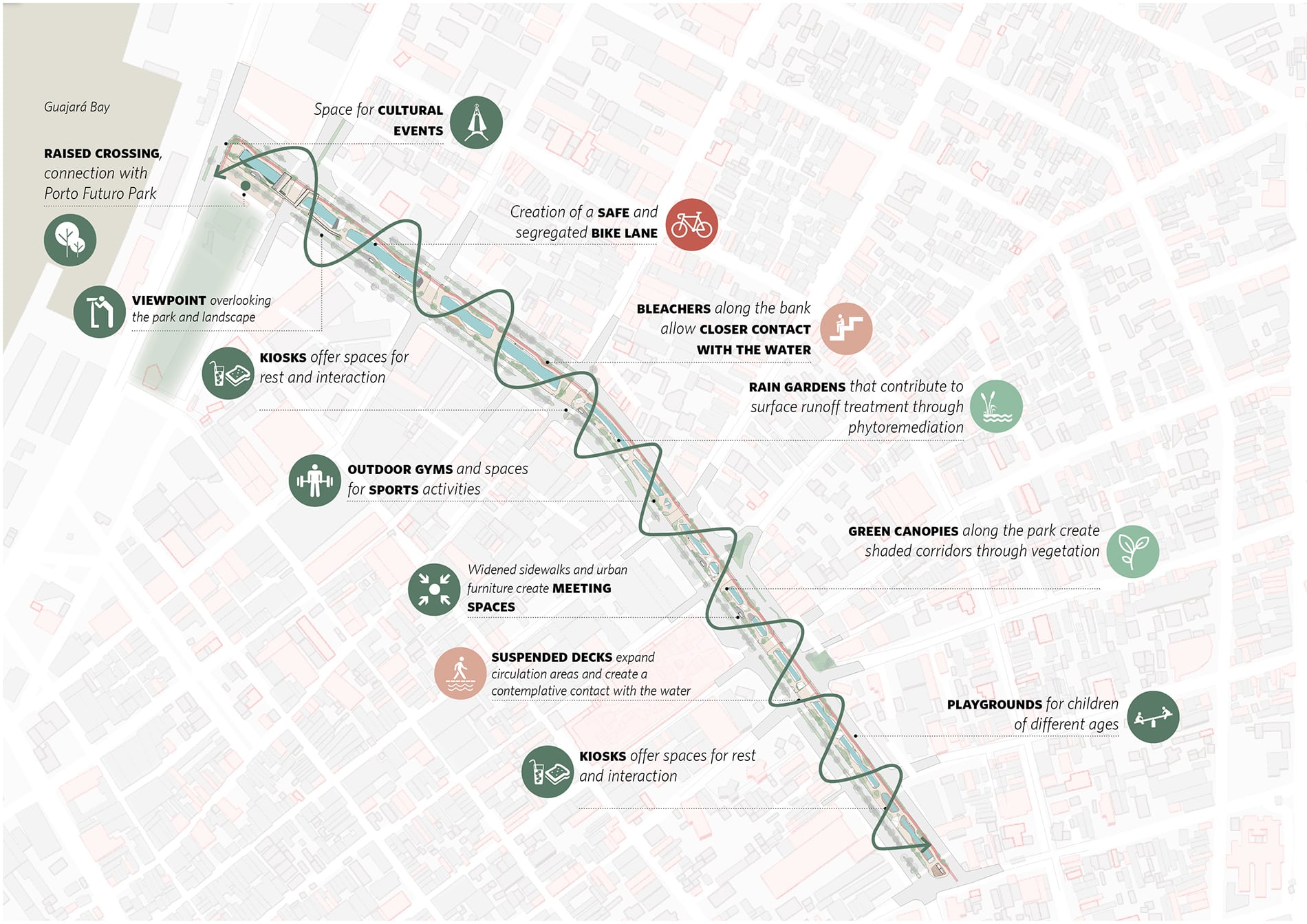 Inspirado en la reflexión de Ailton Krenak —“Que estos ríos, que son mucho más antiguos que nosotros, nos concedan sabiduría y nos guíen hacia una mejor forma de existir…”—, el proyecto adopta el agua como elemento estructurador. El diseño reintegra el canal a la vida cotidiana de Belém, acercando a las personas al curso de agua y ampliando sus funciones ecológicas, sociales y simbólicas.